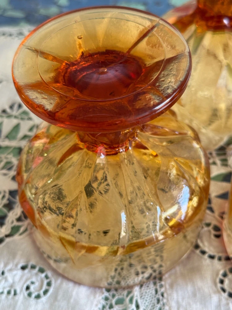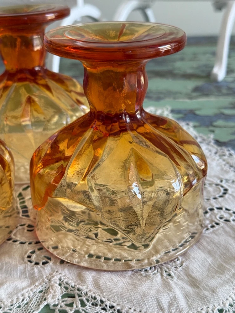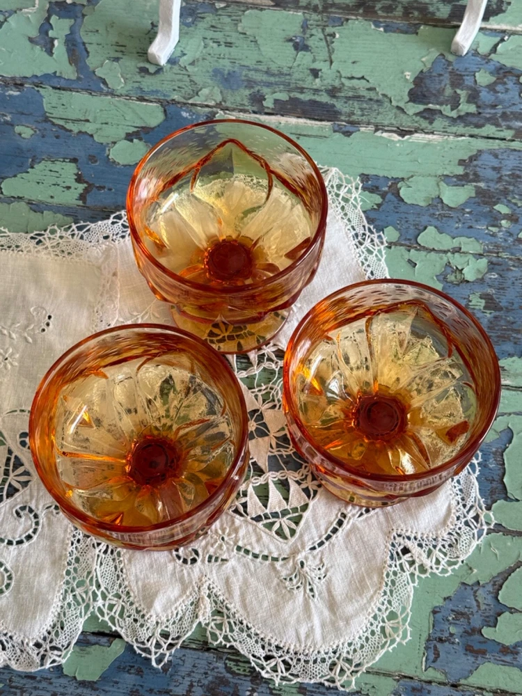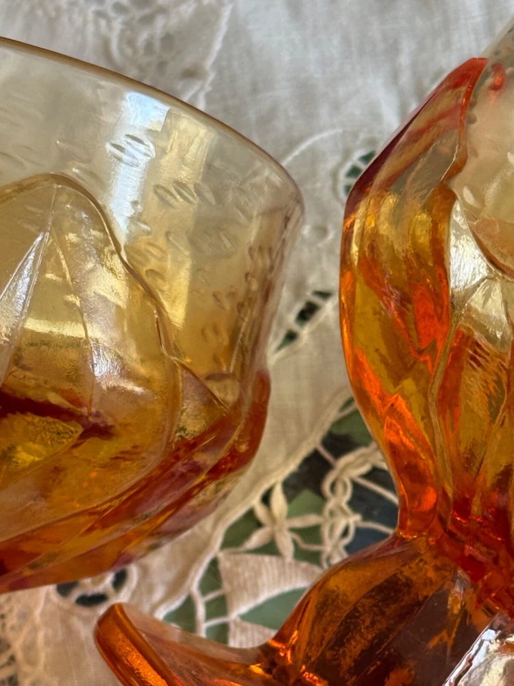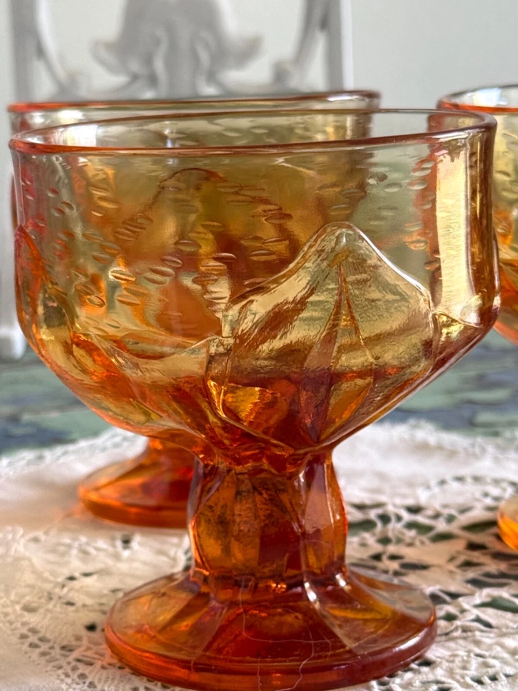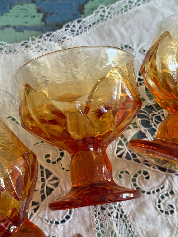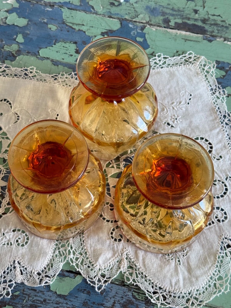 A vintage set of 3 glass sherbet or dessert cups. They could also be used for champaign. They are a substantial weight with a leaf design at the base of the cup. The top of the sherbets have tiny oblong marks that are indented inside the sherbet glass. The color is unusual and fantastic. It is an orangy amber, like apricot. We were not able to find a maker on these so we are just guessing at Blenko or possibly Noritake. We believe that they may be mid century era. Height: nearly 4 1/2” Width Across: 4” A fantastic set! Hint: To view clearest pictures please do not click into the Ebay picture program to scroll down, just expand / enlarge the main picture manually then use the arrow to scroll sideways to view pictures. They will be much clearer :-) Please email us with any questions and please check our Ebay store, Hooked-On-Vintage, for more great vintage items. We combine ship :-) We can ship either USPS or UPS Ground. The latter may be less expensive. These are heavy sherbets and will be aprox 5 pounds with packaging.