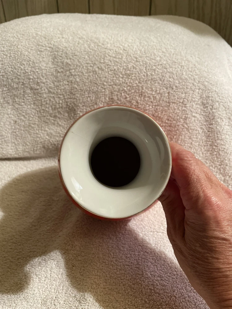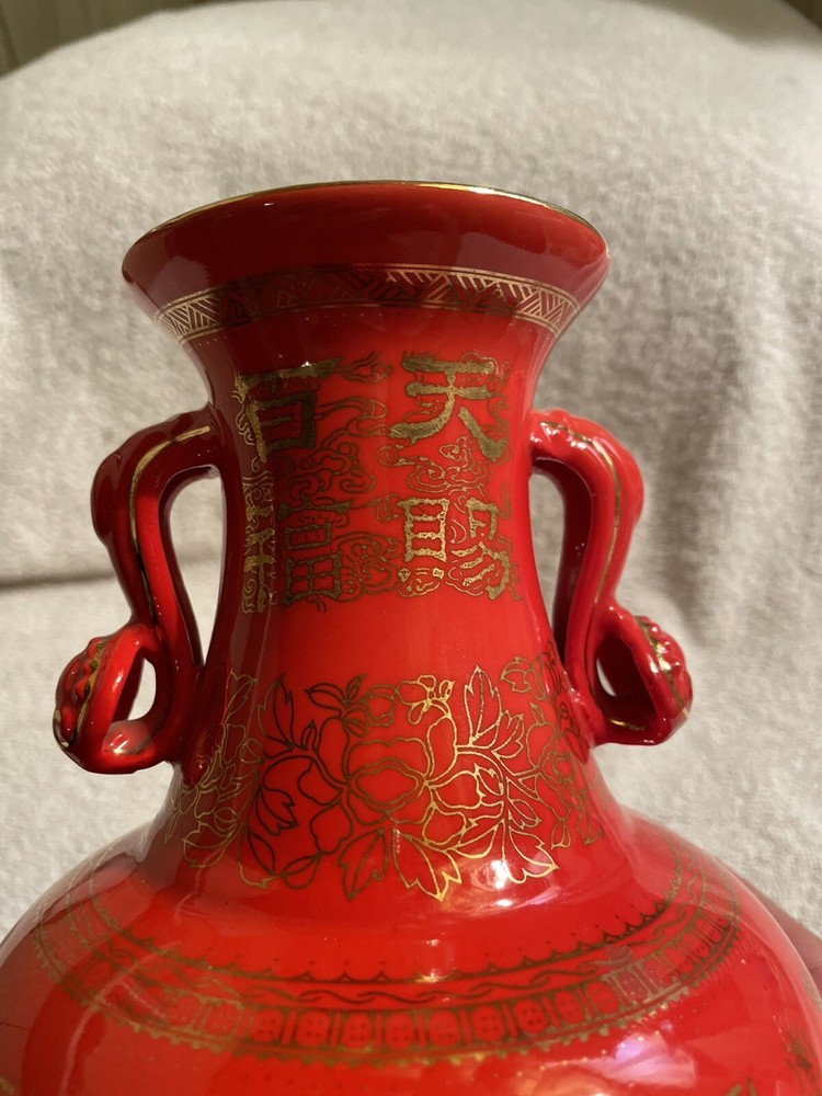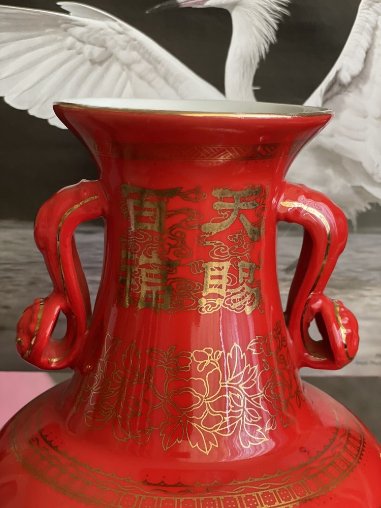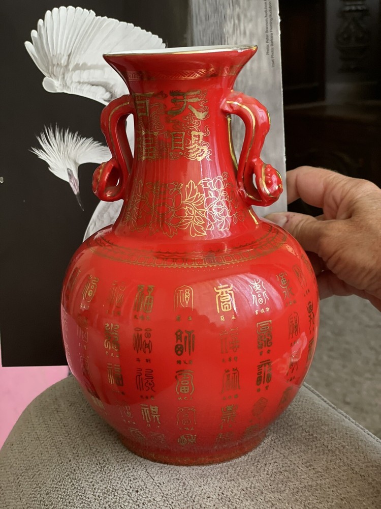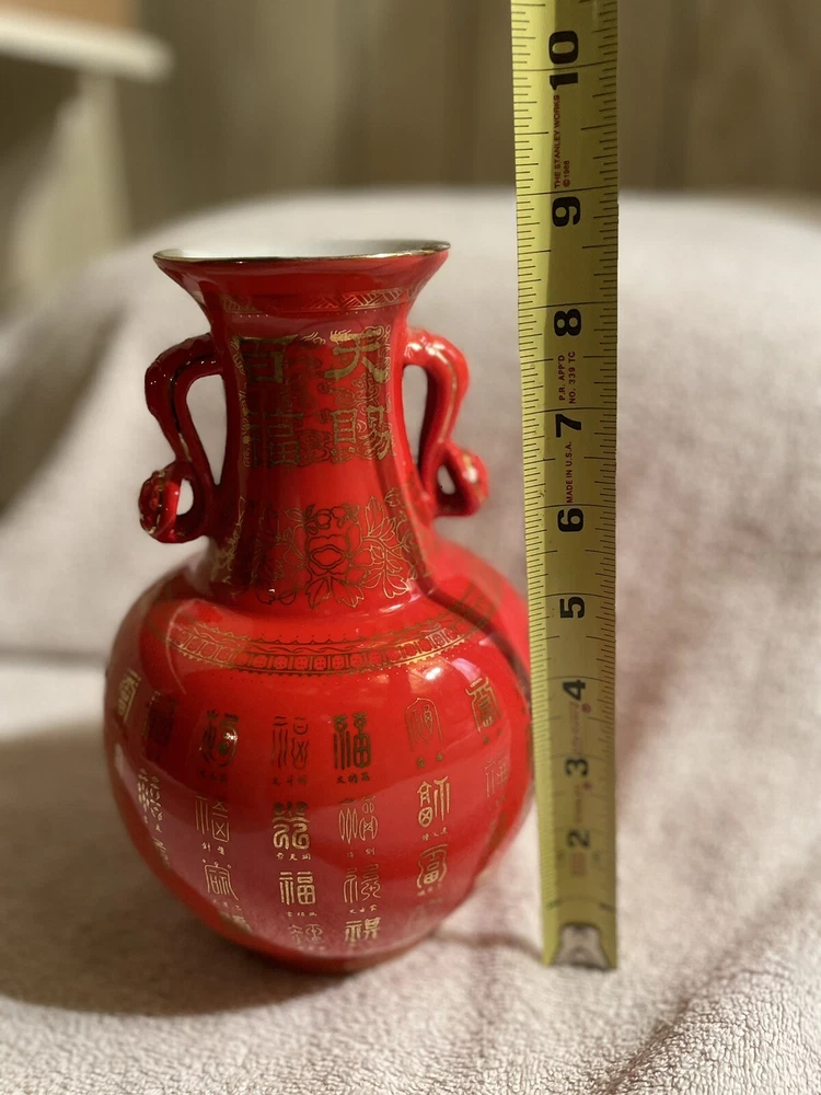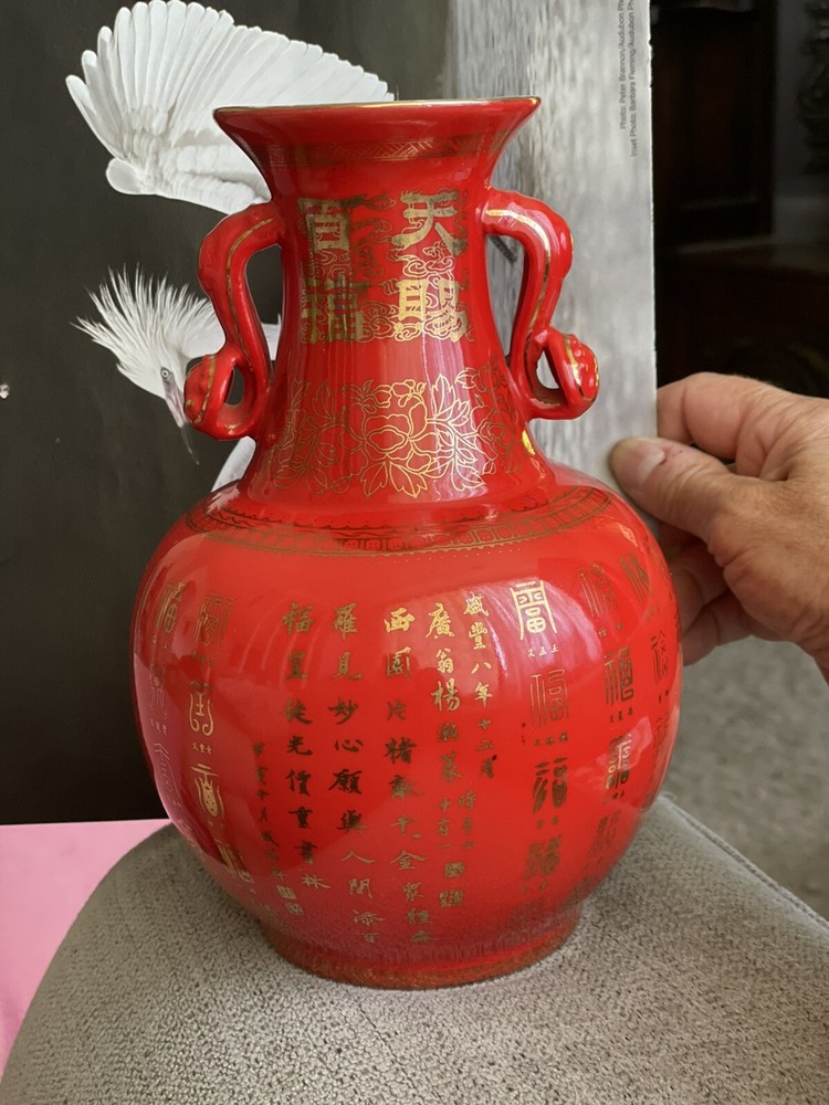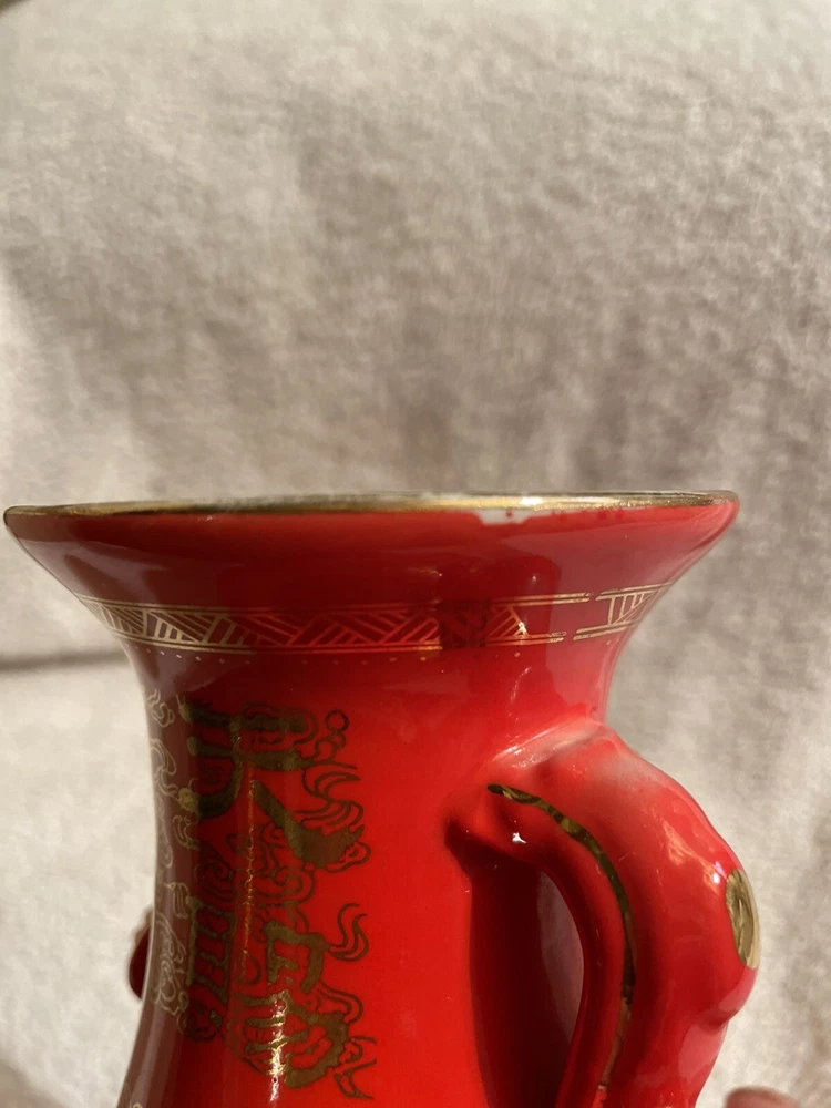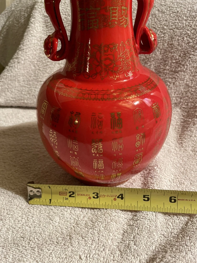 VTG Mid Century Orange/ Red Chinese Vase Gold Symbols. This Vibrant Orangey Red is Accented with many Gold Symbols. The Opening has a Gold edge, and Two Beautiful Ornate Handles. Made of Porcelain, Stands 9” Tall x 6” Wide. In Great Condition.There is the tiniest paint loss at lip as shown in Close up, but I believe that’s when it was made. No Marking on Bottom