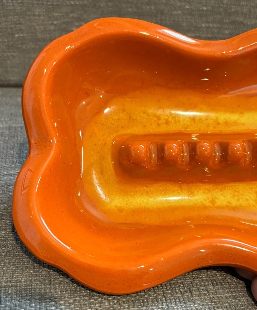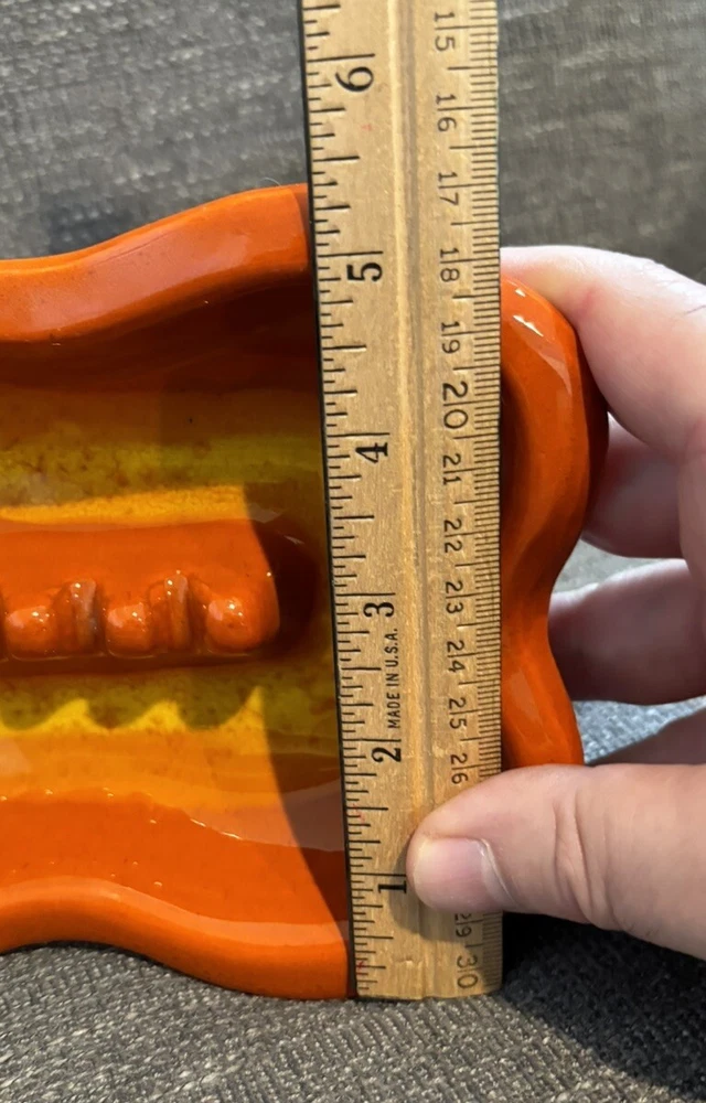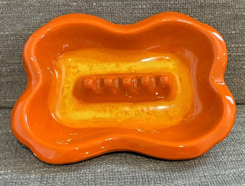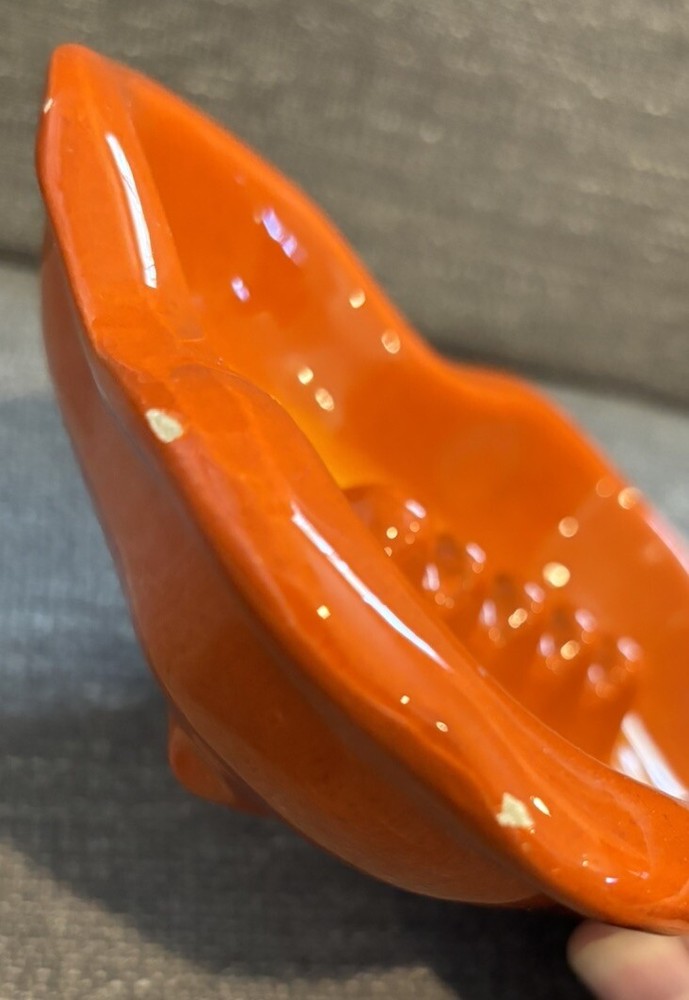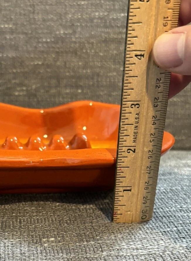 You are bidding on a VTG Orange Glazed MCM Rectangular Ashtray Mid Century Modern Ceramic Retro READ. This ashtray has 3 tiny chips on the left hand side which I have photographed for you to see. The ashtray measures approx. 7 1/2" Long X 5 1/2" wide X 1 1/2" Tall. Other than the tiny chips this item is in very nice used condition for it's age. Please check out all my photos to make sure you will be happy with this item before bidding. Thanks for looking!!!