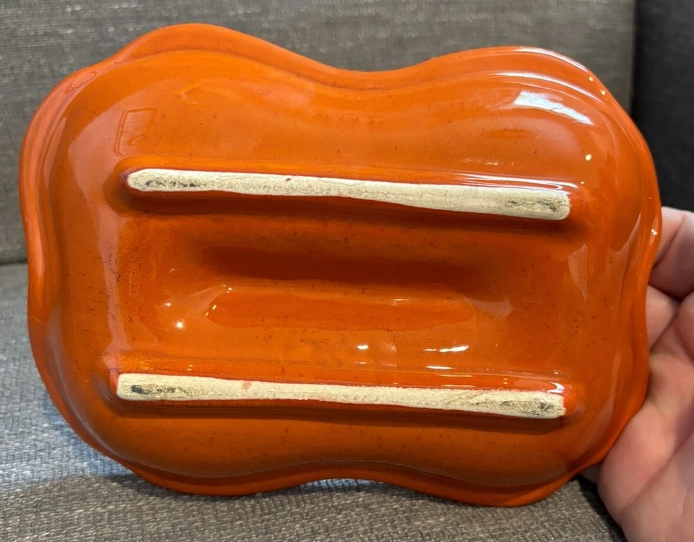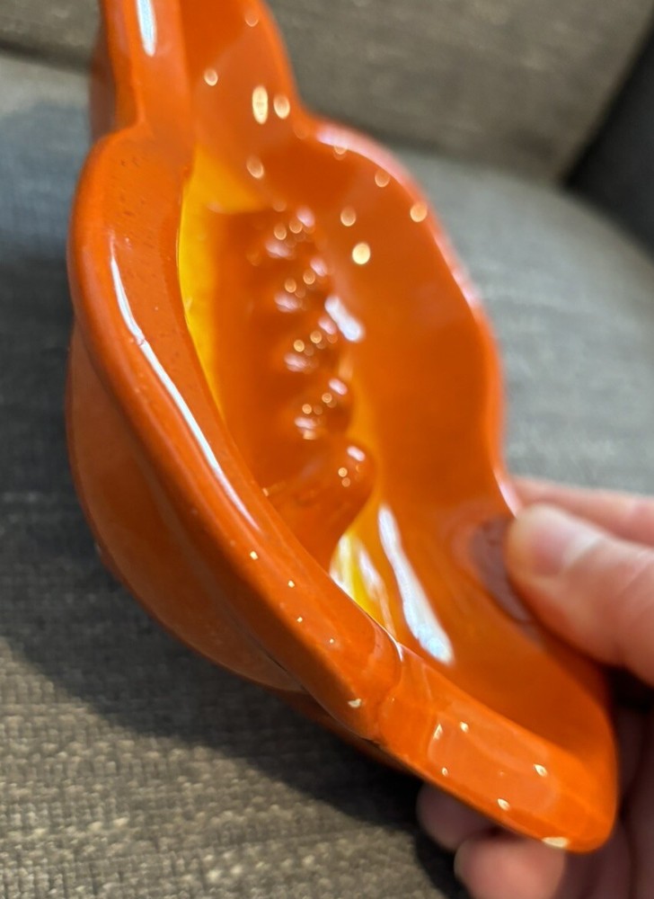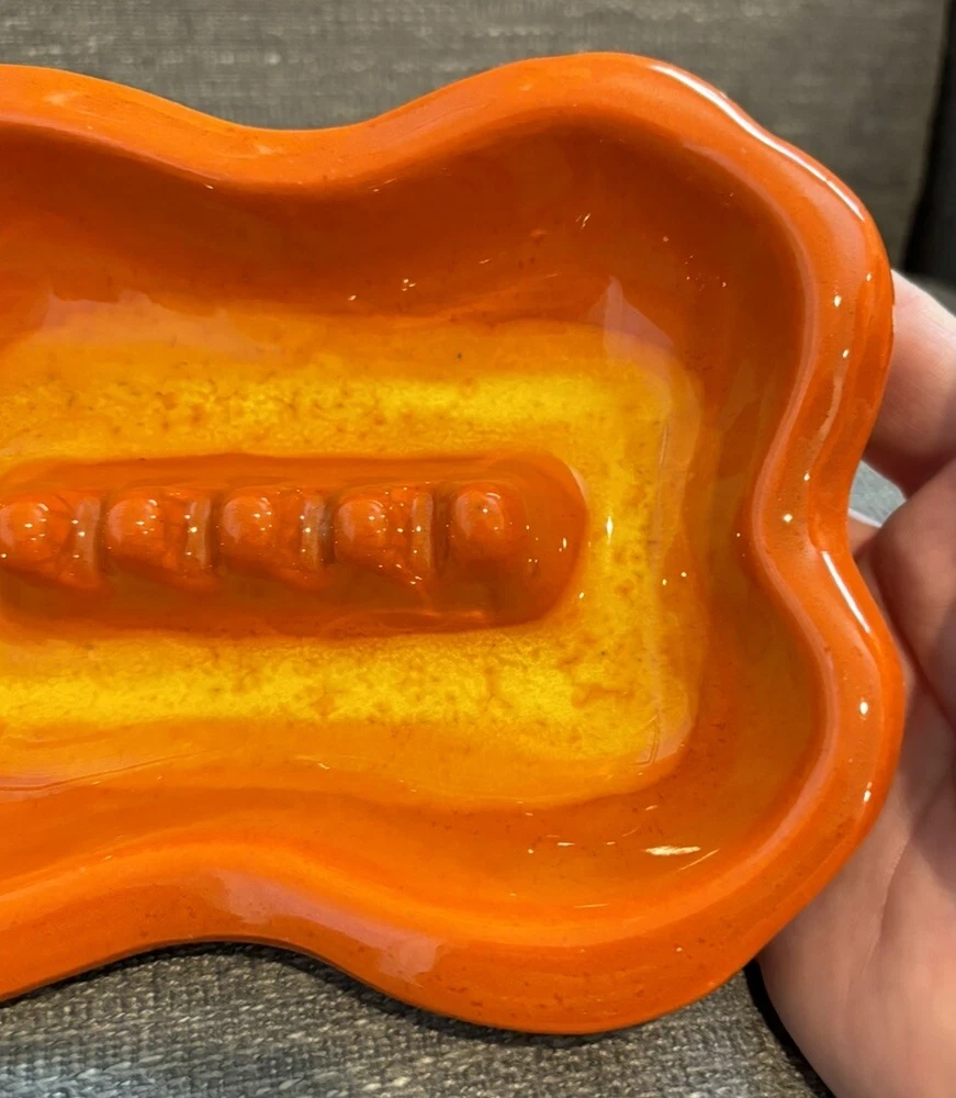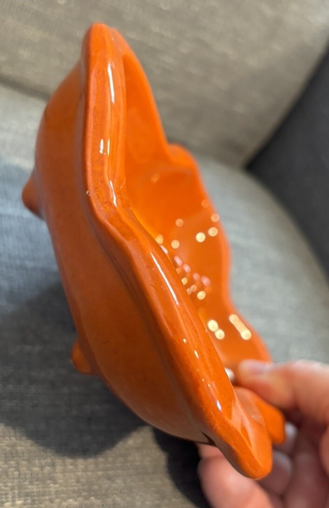You are bidding on a VTG Orange Glazed MCM Rectangular Ashtray Mid Century Modern Ceramic Retro READ. This ashtray has 3 tiny chips on the left hand side which I have photographed for you to see. The ashtray measures approx. 7 1/2" Long X 5 1/2" wide X 1 1/2" Tall. Other than the tiny chips this item is in very nice used condition for it's age. Please check out all my photos to make sure you will be happy with this item before bidding. Thanks for looking!!!