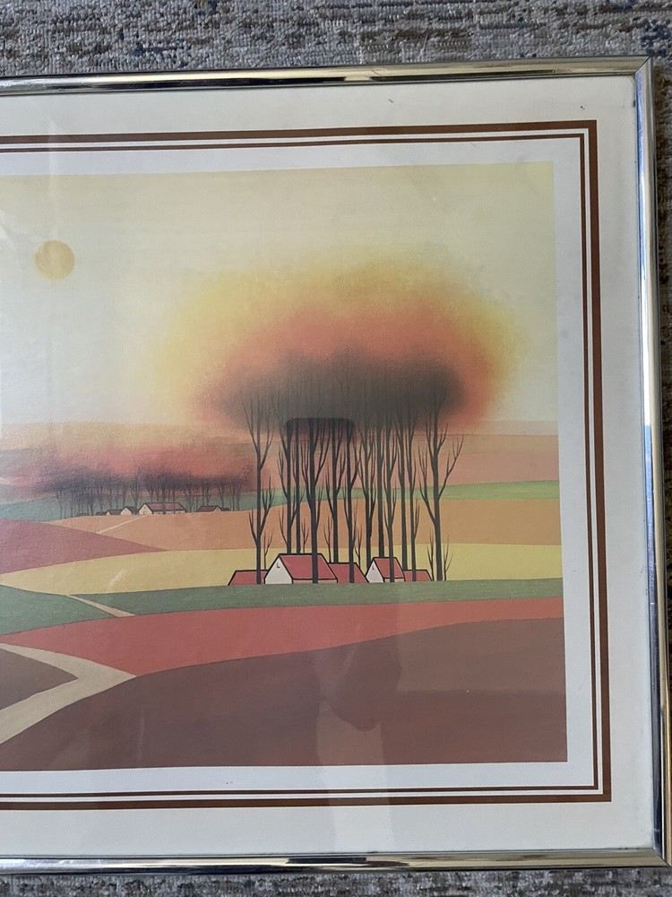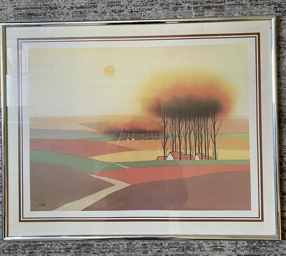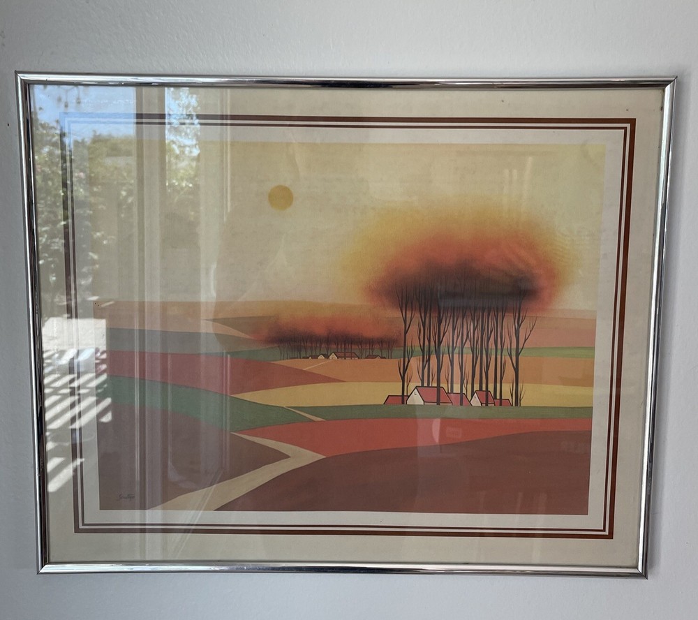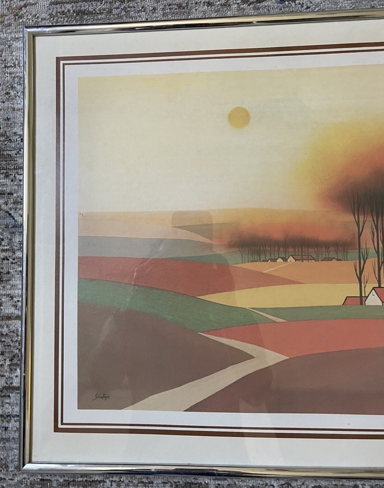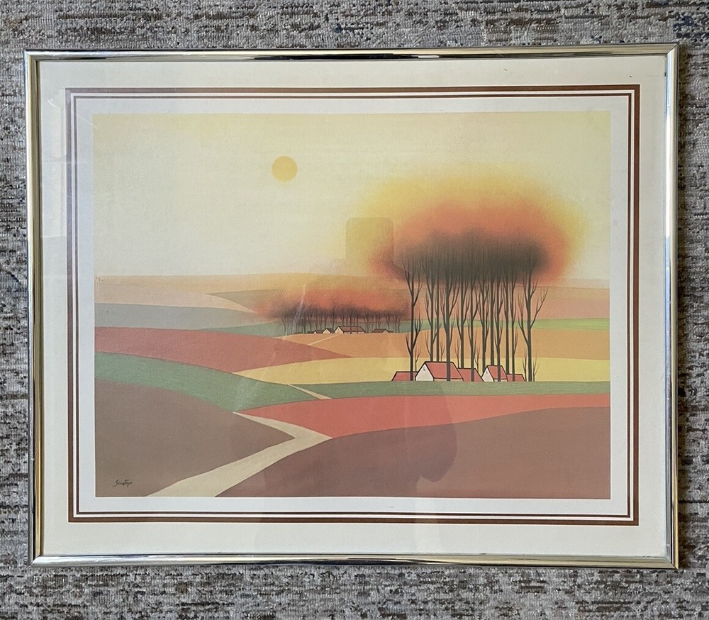 This vintage print by Victor Santoyo features a beautiful landscape in vibrant orange and brown colors. The print is framed and measures 16 inches in length and 20 inches in height, with a horizontal orientation. The artist's signature is prominently displayed and the print is made of high-quality paper material. The subject of the print is a stunning landscape, perfect for any room in your home. The style is mid-century and the theme is 1960s, making it a unique addition to your collection. This print is sure to add a pop of color and a touch of folk art to your decor.