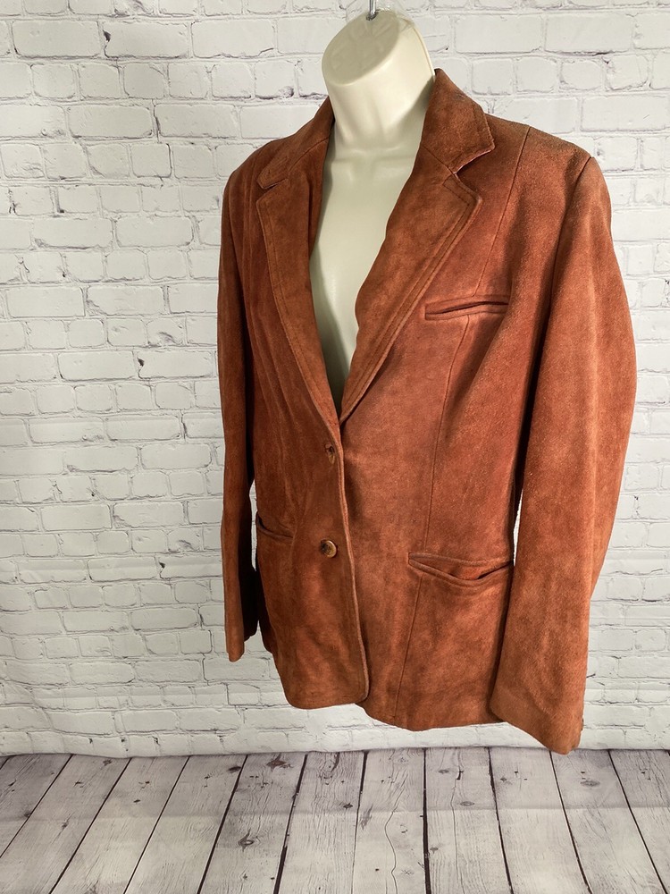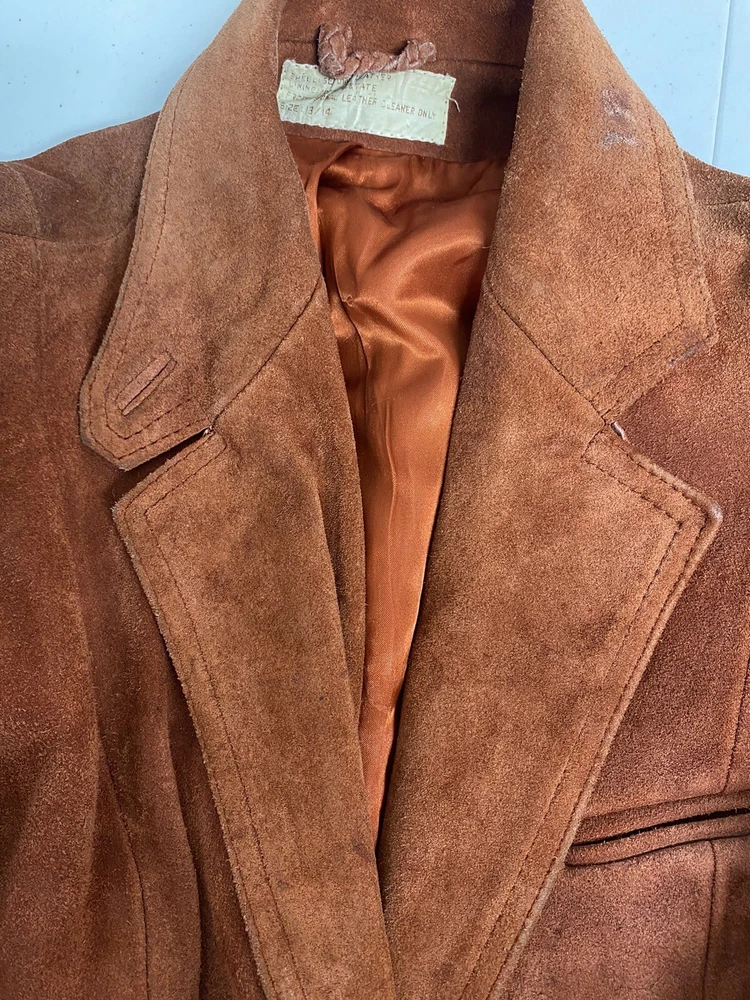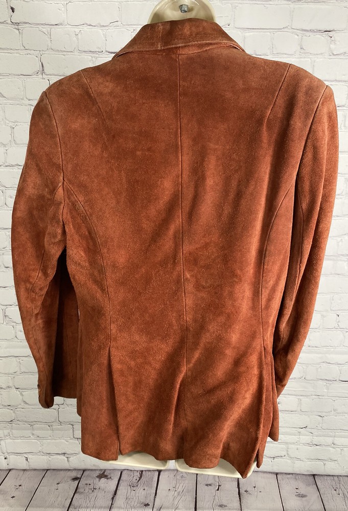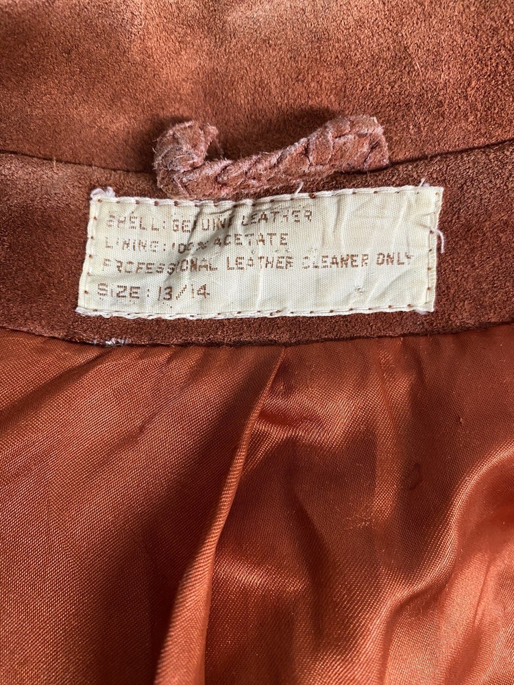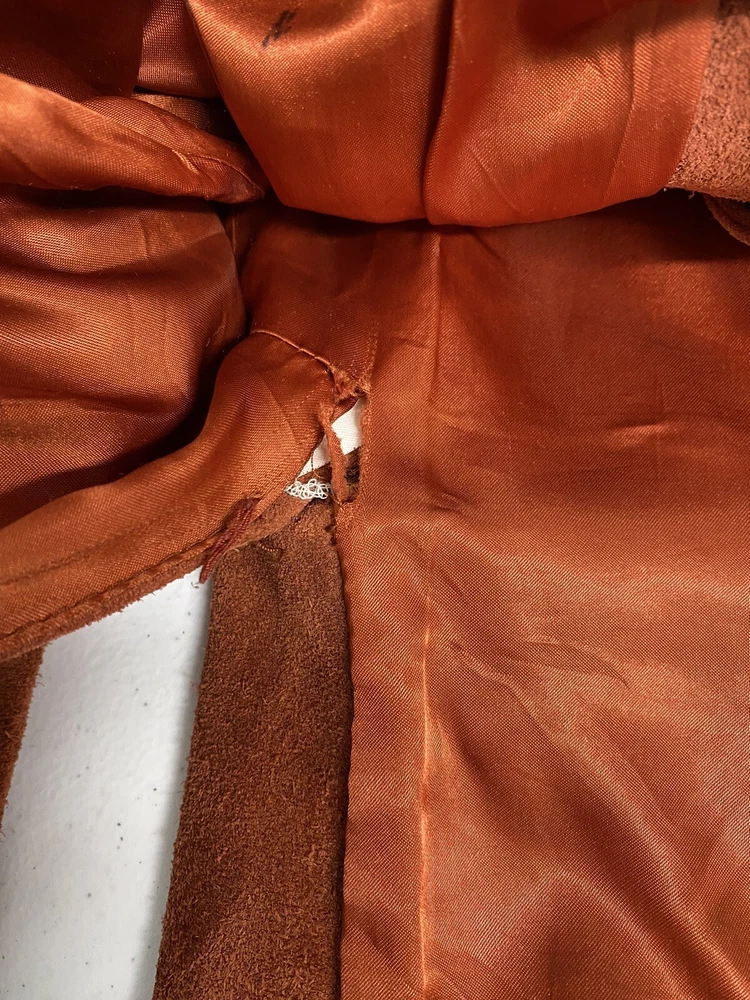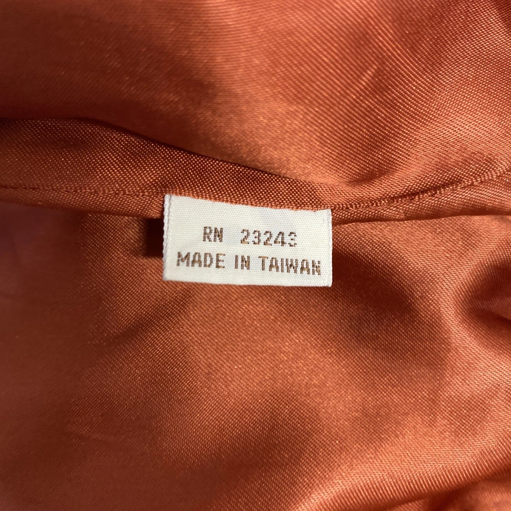Add a pop of color to your wardrobe with this vintage orange leather jacket. Made with high-quality leather and lined with acetate, this mid-length jacket features long sleeves, a collared neckline, and two button closures. The jacket also includes pockets for added convenience. Perfect for a casual occasion, this jacket is a must-have for any fashion-forward woman. Its solid pattern and hippie/outdoor/classic theme make it a versatile addition to your wardrobe. Professionally leather clean this jacket to maintain its quality. This jacket has been well loved and worn so it does have some defects. Discoloration on shoulders, collar, sleeve openings, and lower pockets. A few small stains. Tear in lining. See photos for reference. Pit to pit 19.5” Waist front 17.5” Shoulder to hem 26.5” Sleeve 23.5”