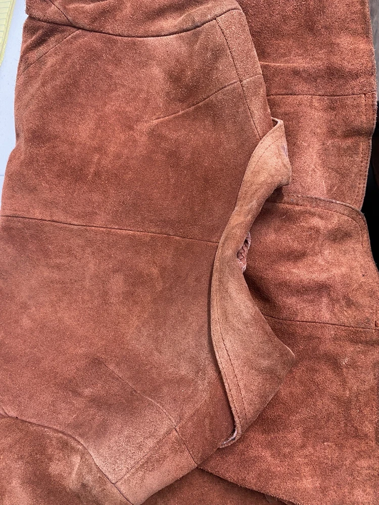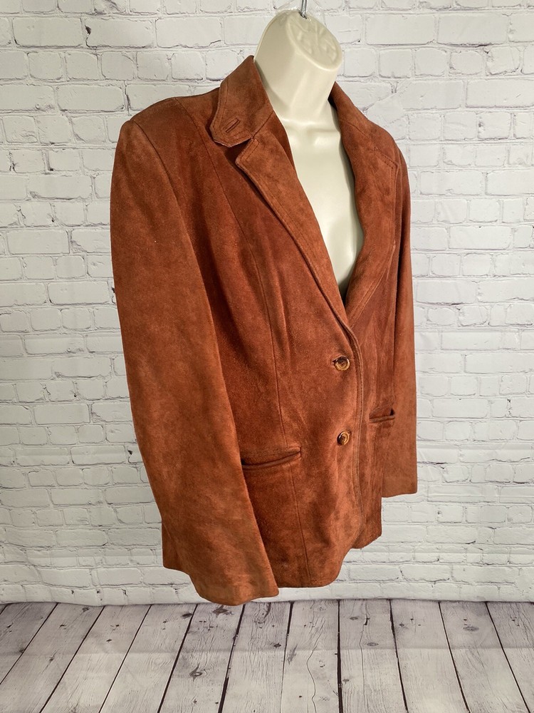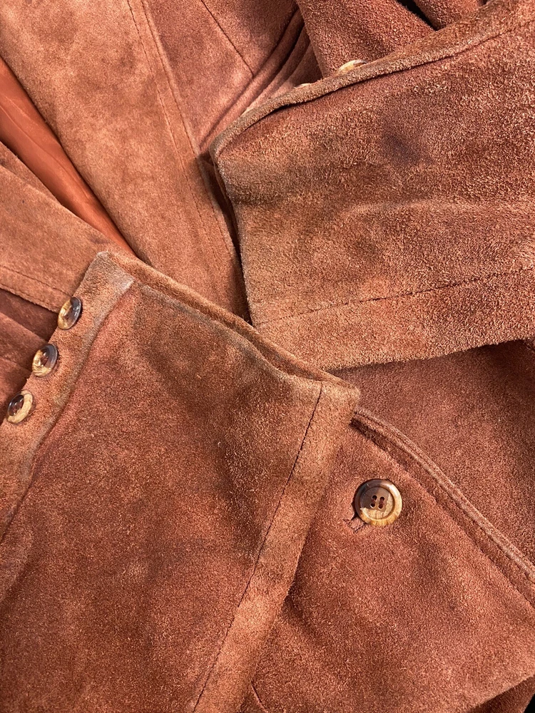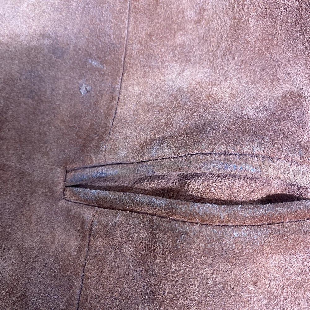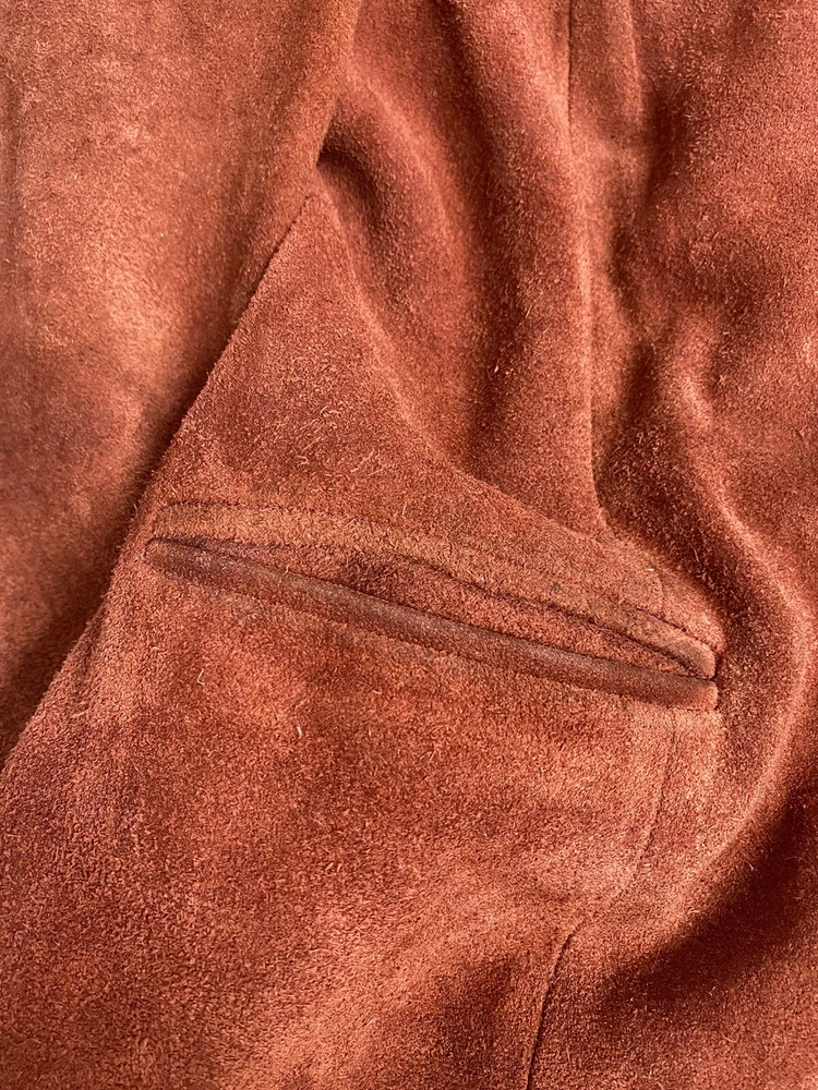 Add a pop of color to your wardrobe with this vintage orange leather jacket. Made with high-quality leather and lined with acetate, this mid-length jacket features long sleeves, a collared neckline, and two button closures. The jacket also includes pockets for added convenience. Perfect for a casual occasion, this jacket is a must-have for any fashion-forward woman. Its solid pattern and hippie/outdoor/classic theme make it a versatile addition to your wardrobe. Professionally leather clean this jacket to maintain its quality. This jacket has been well loved and worn so it does have some defects. Discoloration on shoulders, collar, sleeve openings, and lower pockets. A few small stains. Tear in lining. See photos for reference. Pit to pit 19.5” Waist front 17.5” Shoulder to hem 26.5” Sleeve 23.5”