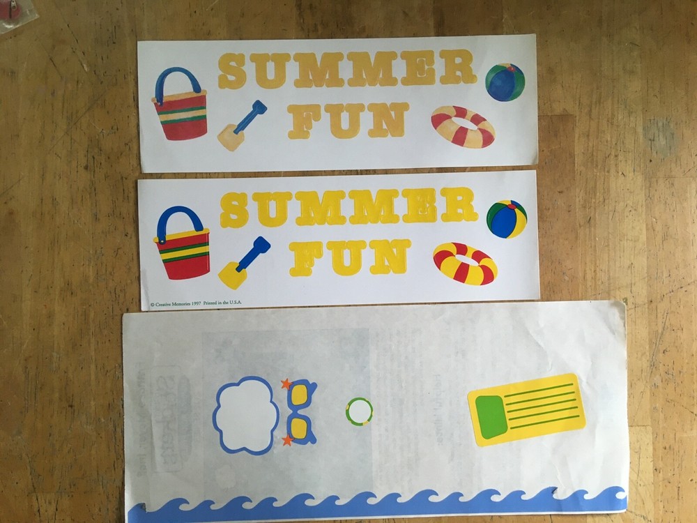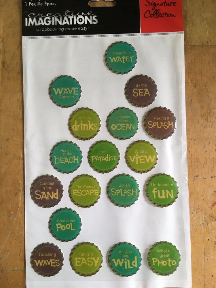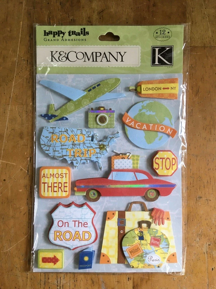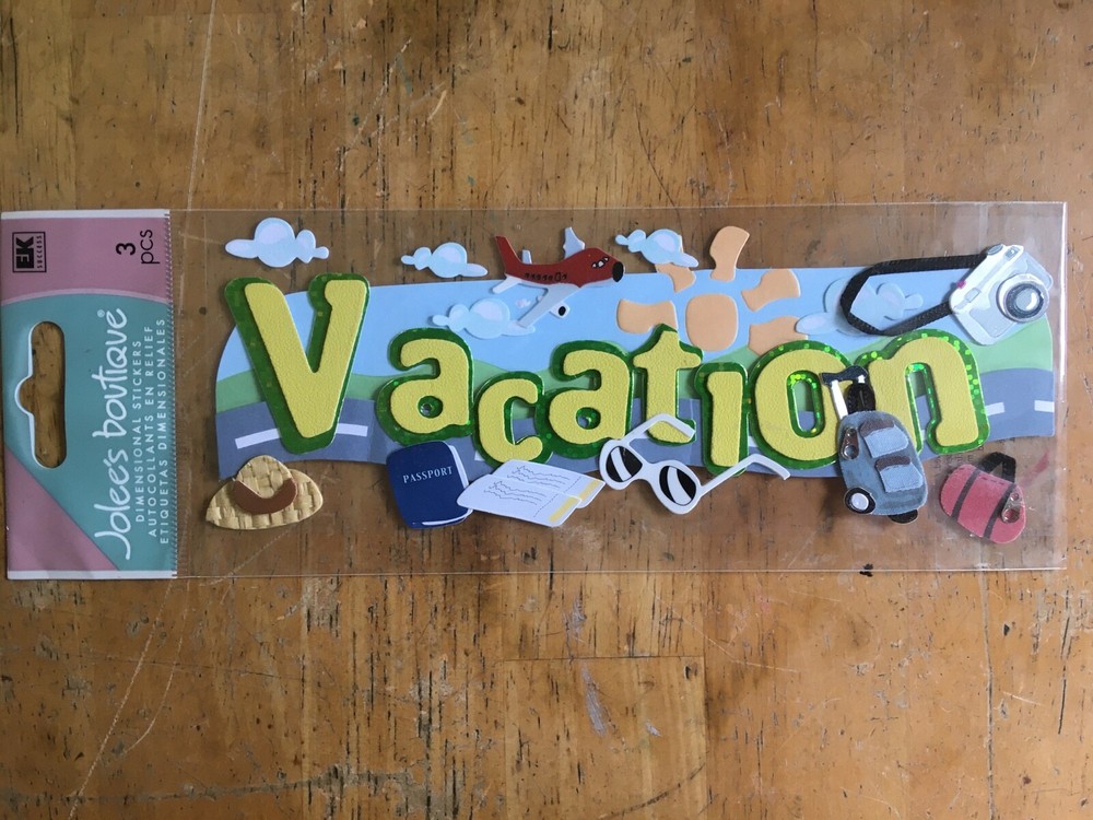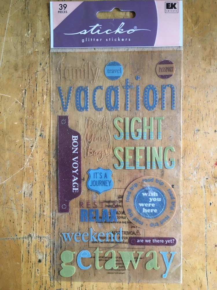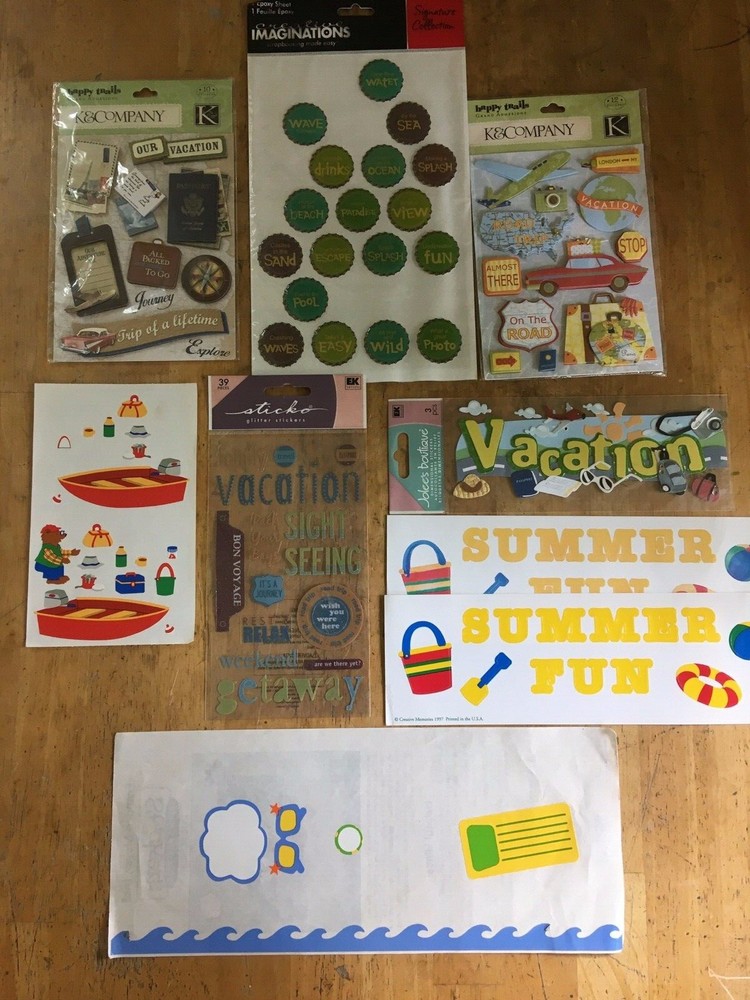 I am offering a lot of Vacation/Travel Themed Stickers, which are perfect for Scrapbooking and crafts. K&Company - 2 packs 3 D Happy Trails separate stickers- unopened Sticko glitter stickers - 13 words/phrases - unopened Jolee's Boutique - 7" Vacation strip - unopened Creative Imaginations - approx 1" bottle tops stickers with words - opened & some used Mrs. Grossman's - Fishing - opened & some used Creative Memories - 2 Summer fun, approx 9" - opened, not used Francis Meyer - water border - opened & some used Thanks for looking and happy bidding.