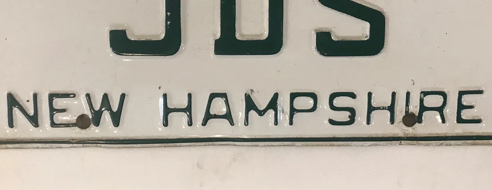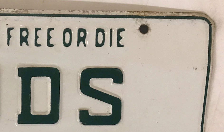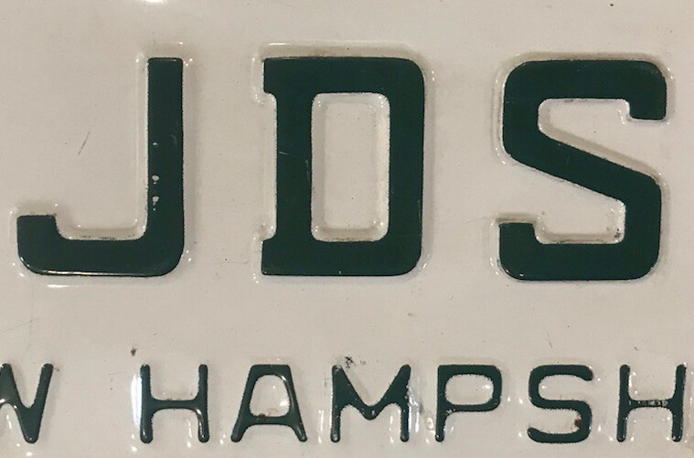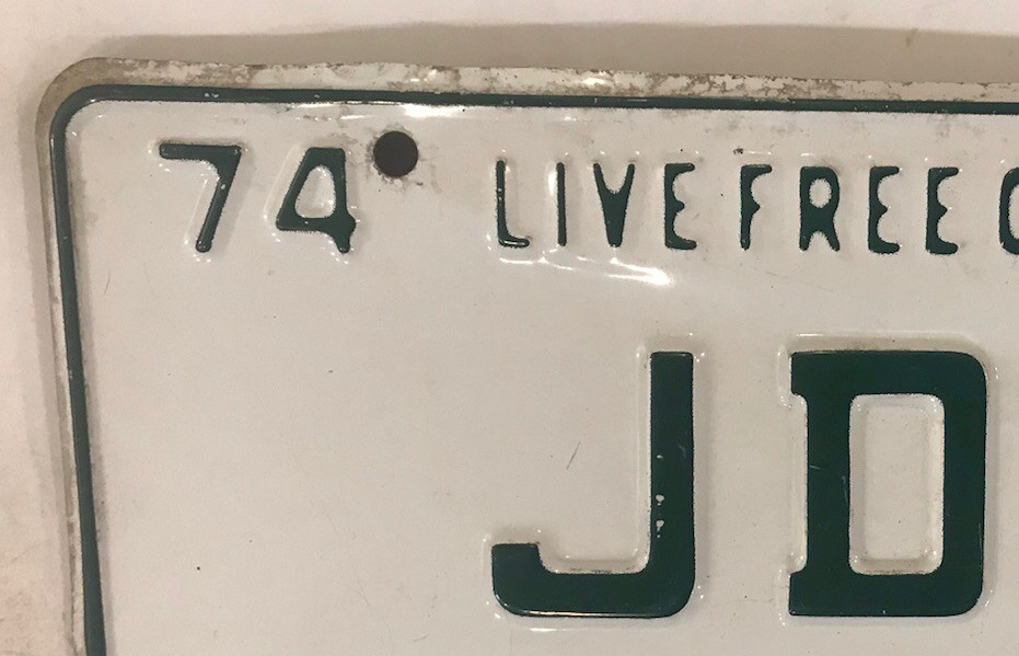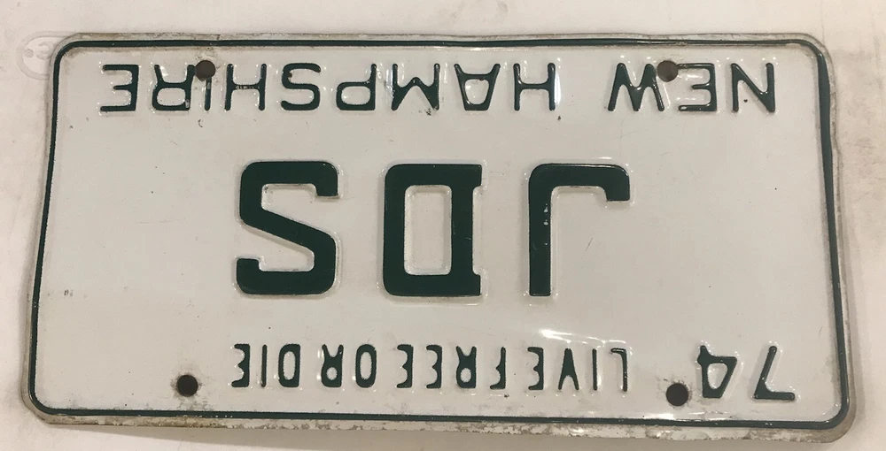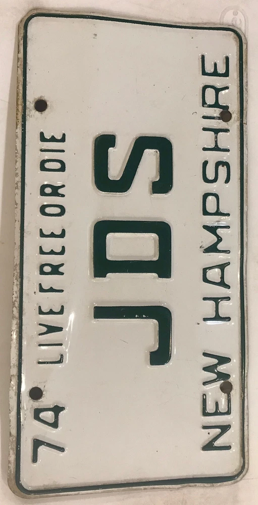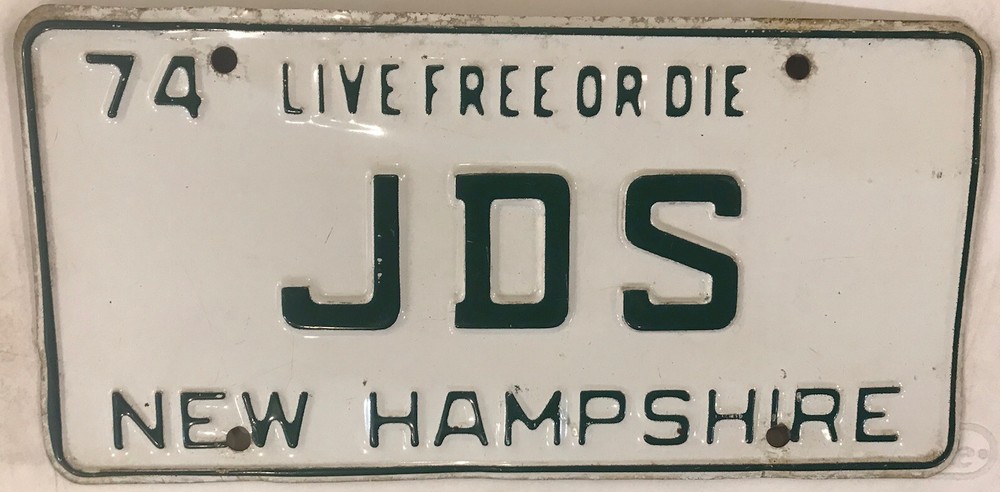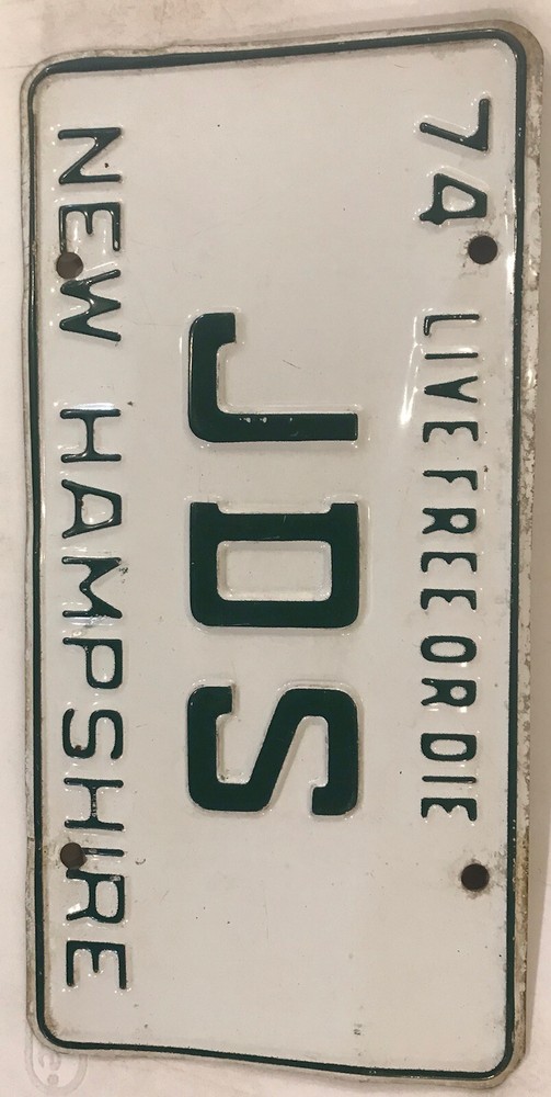 You are bidding on a vintage 1974 New Hampshire embossed “Live Free Or Die” style vanity “JDS” license plate previously issued to a New Hampshire motorist at an extra fee in the amount of $31.00 for a personalized tag (in addition to regular registration charges) by the New Hampshire DMV. The license plate listed is for collecting/display purposes only, and fully complies with all eBay listing policies.It is no longer valid and is at least three years old. It is sold as a collectible, hobby or souvenir item and never for display on any type of motor vehicle. All buyers must agree to not misrepresent their intent in making this purchase and further agree to not misuse this license plate in any way that will violate any state, federal or local laws, statutes and/or ordinances. International bidders welcome - $6.95 shipping for USA - WE ARE HAPPY TO COMBINE auctions to save you postage so long as they are paid for in one payment, and will reduce postage costs for auctions over 3 plates if we can send more economical. Please include item numbers and pay for all orders within 20 days, as it is difficult and time consuming to pull up long past auctions. I have an almost complete FIRST NAME PERSONALIZED & NEW HAMPSHIRE OPTIONAL pl8 collection for sale. Feel free to ask for other designs. Estimated delivery dates - include seller's handling time, and will depend on shipping service selected and receipt of cleared payment. Delivery times may vary, especially during peak periods.