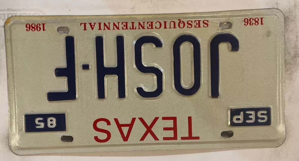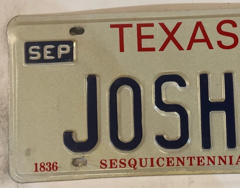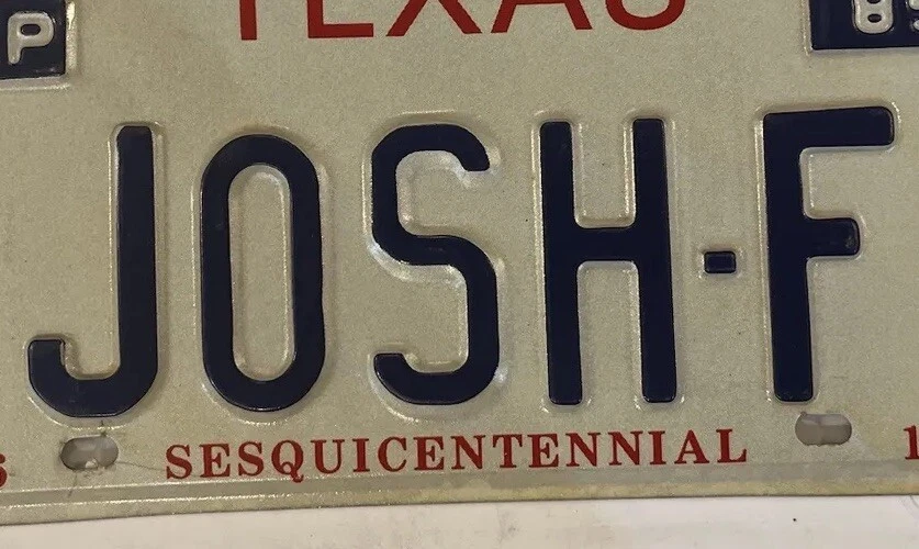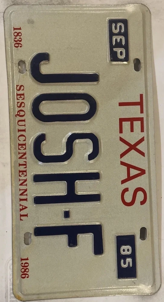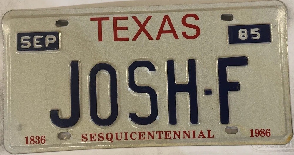 You are bidding on a vintage 1985 Texas embossed Sesquicentennial style vanity “JOSH F“ license plate (made of heavy steel) previously issued to a Texas motorist at an extra fee in the amount of $70.00 for a personalized tag (in addition to regular registration charges) by the Texas DMV. The license plate listed is for collecting/display purposes only, and fully complies with all eBay listing policies.It is no longer valid and is at least three years old. It is sold as a collectible, hobby or souvenir item and never for display on any type of motor vehicle. All buyers must agree to not misrepresent their intent in making this purchase and further agree to not misuse this license plate in any way that will violate any state, federal or local laws, statutes and/or ordinances. International bidders welcome - $8.95 shipping for USA - WE ARE HAPPY TO COMBINE auctions to save you postage so long as they are paid for in one payment, and will reduce postage costs for auctions over 3 plates if we can send more economical. Please include item numbers and pay for all orders within 20 days, as it is difficult and time consuming to pull up long past auctions. I have an almost complete FIRST NAME PERSONALIZED & TEXAS OPTIONAL pl8 collection for sale. Feel free to ask for other designs. Estimated delivery dates - include seller's handling time, and will depend on shipping service selected and receipt of cleared payment. Delivery times may vary, especially during peak periods.