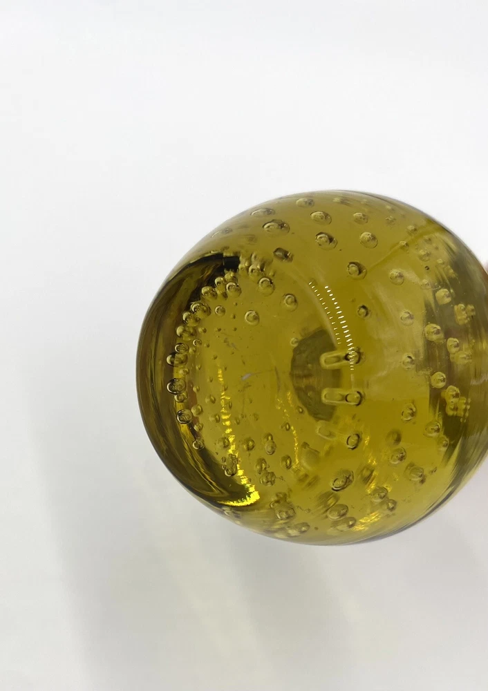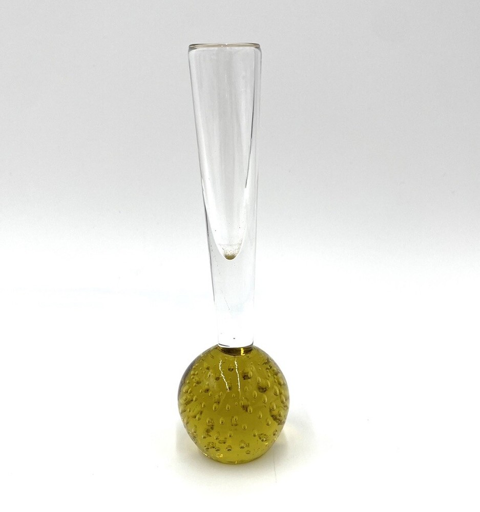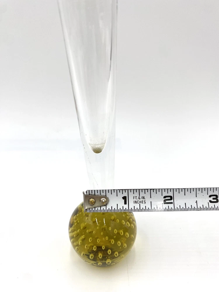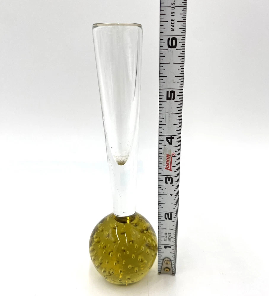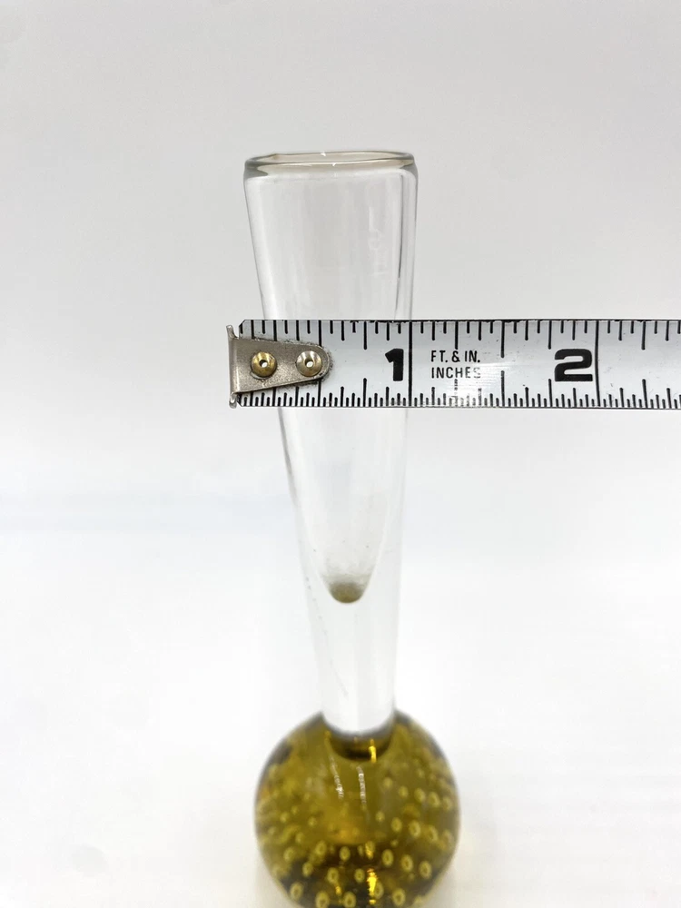 Vase Bud Vase Vintage Mid Century Glass Amber Controlled Bubble Art Glass. This stunning Amber glass vase is a true work of art, with its mid-century vintage design and intricate controlled bubble details. The handcrafted piece exudes elegance and charm, perfect for adding a touch of sophistication to any home décor. Its unique design and high-quality glass material make it a must-have for any art enthusiast or collector.