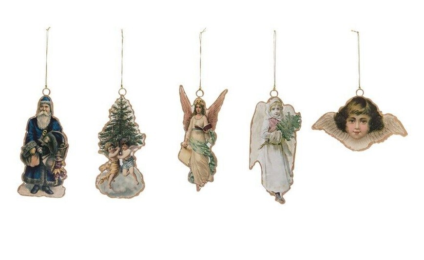 Metal Ornaments xm5206a Victorian era art of various Angels and Santa have been added to metal to create these charming old fashioned ornaments. Image is on both sides of the ornament, they are 3 to 5" with gold painted trim. New Powered by