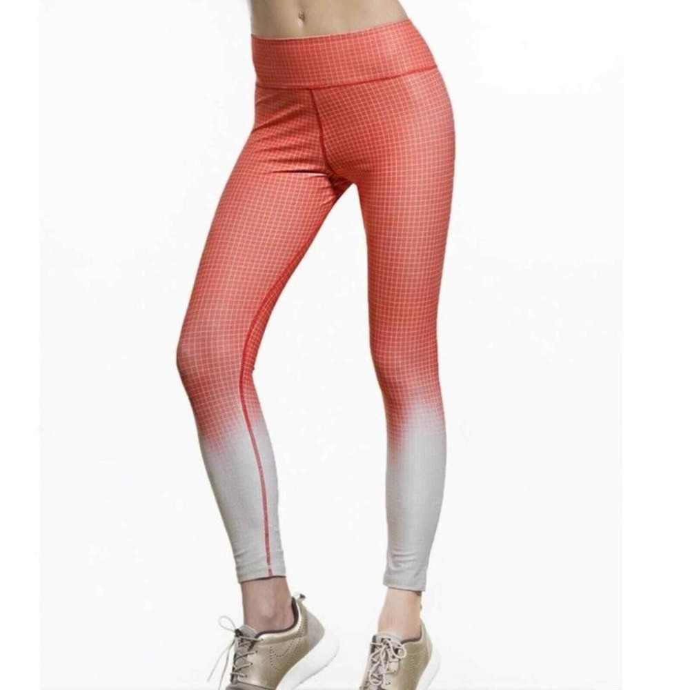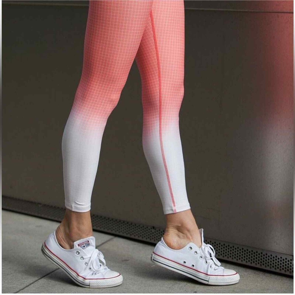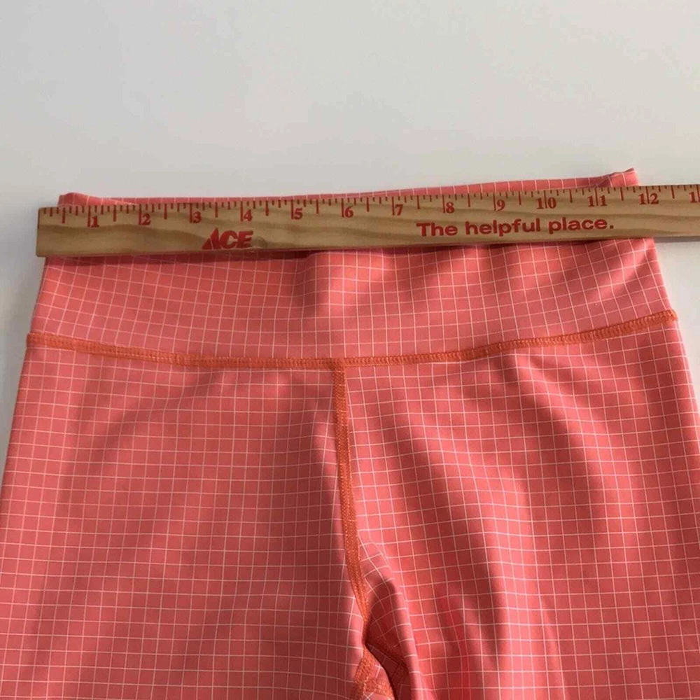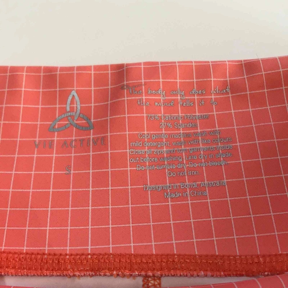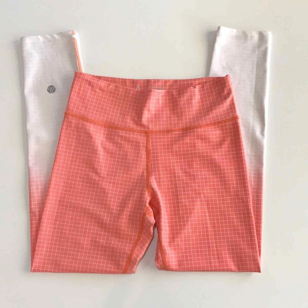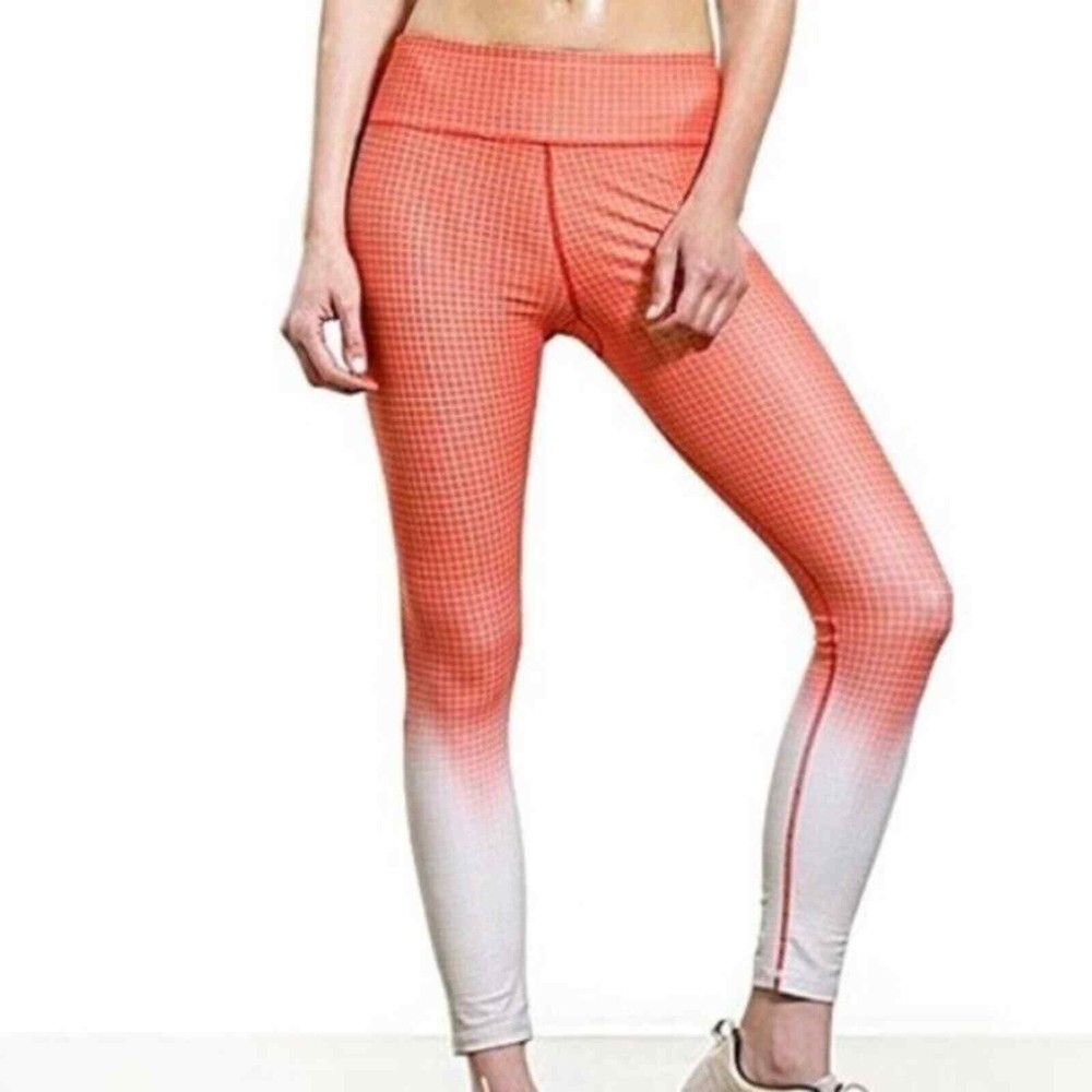 <![CDATA[<div>Vie Active Coral Ombre Grid Legging Rockell Grid Pattern Size Small Bright tangerine orange color gradient tights White dip-dyed cuffs Overlaying thin stripe checkered print Mid-rise Slightly cropped 7/8 length Skinny leg Wide flat tummy-control waistband Lifts booty & flattens stomach Sweat & moisture wicking Quick drying 4-way stretch Anti-microbial odor-resistant Soft breathable knit Luxe high-performance compression fabric Cationic Polyester/Spandex tags: Legging Pilates Yoga Pant Athletic Athleisure Pickleball Active Exercise Workout Gym