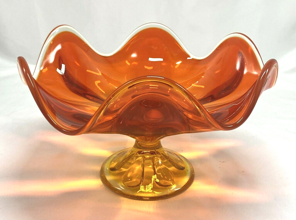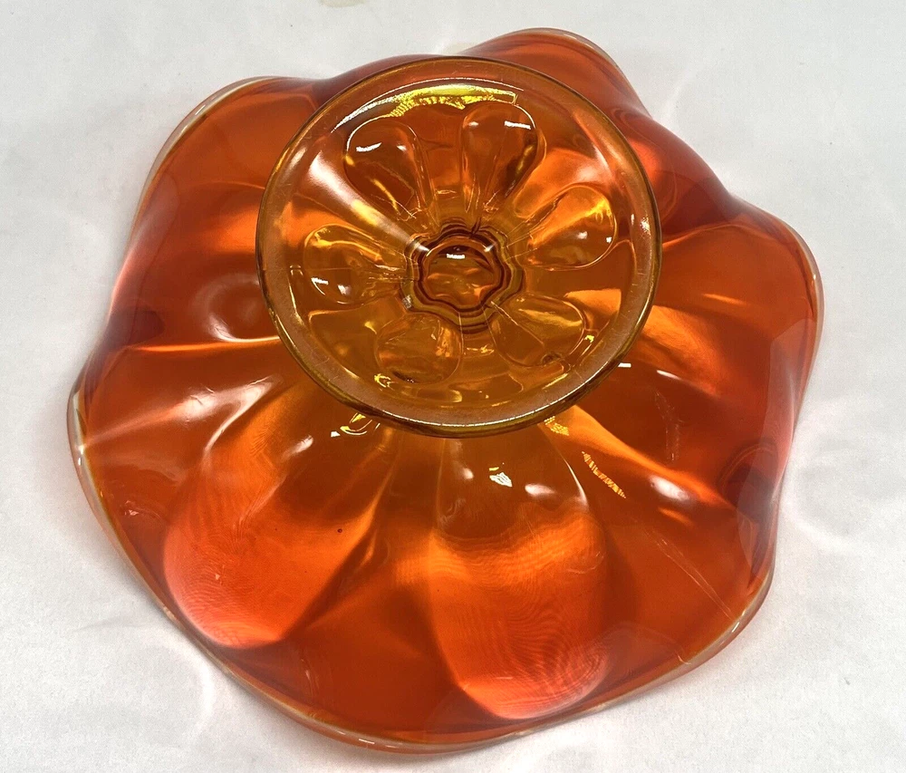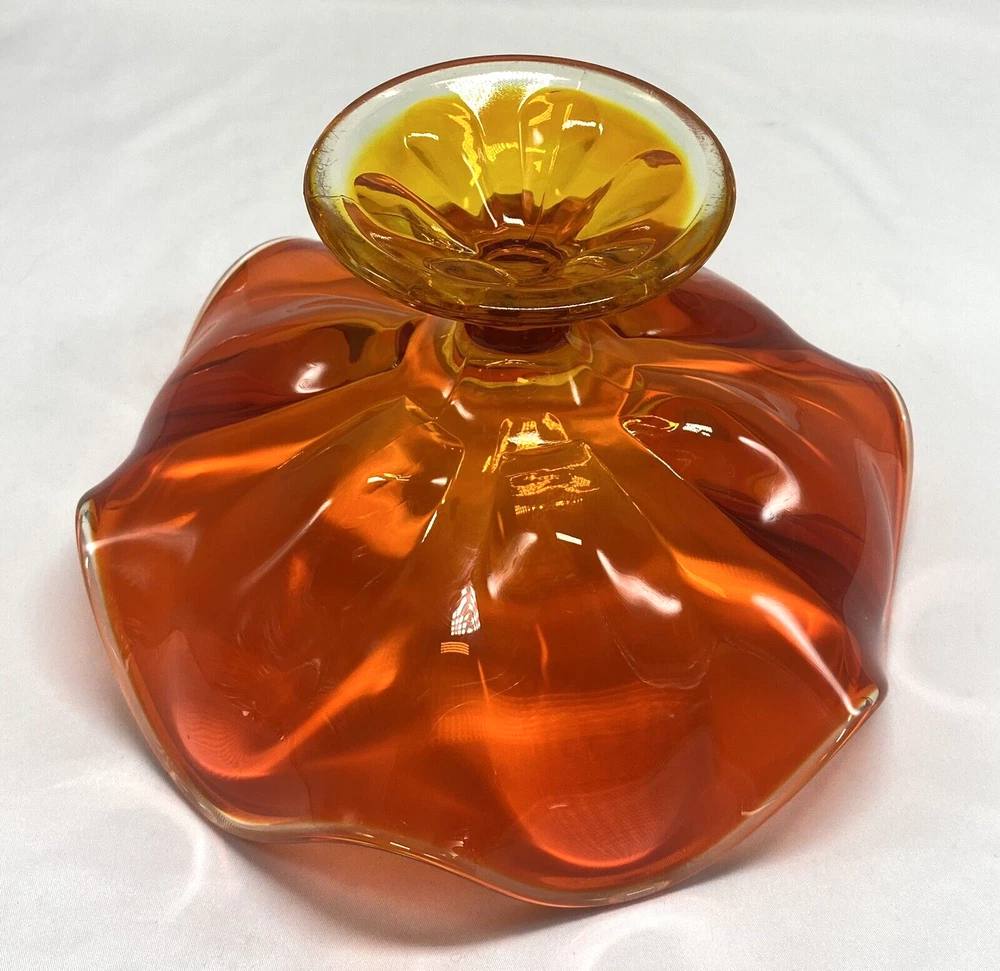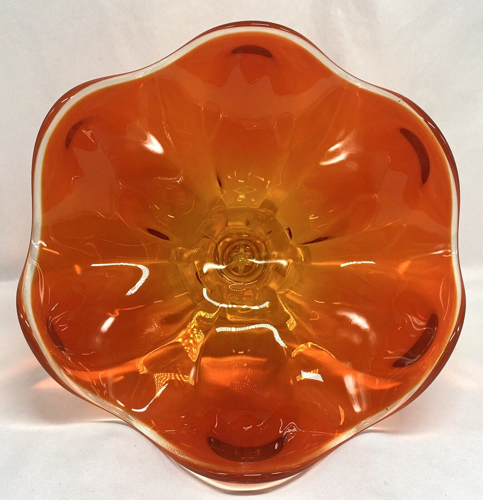 Viking Art Glass Bowl Compote Orange Amberina Clear Edge 6 Petal. 9 1/4" wide x approx 6" high Condition is used in good shape no chips or cracks Shipped with USPS Priority Mail