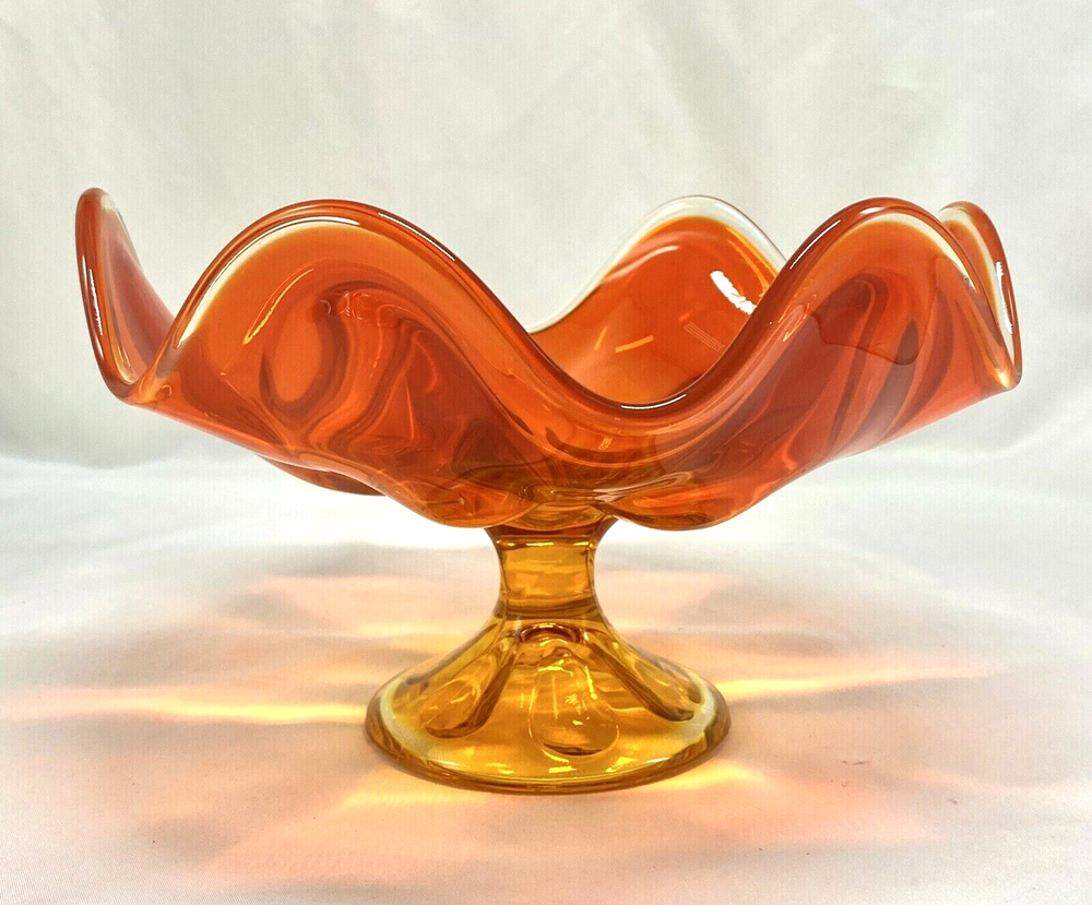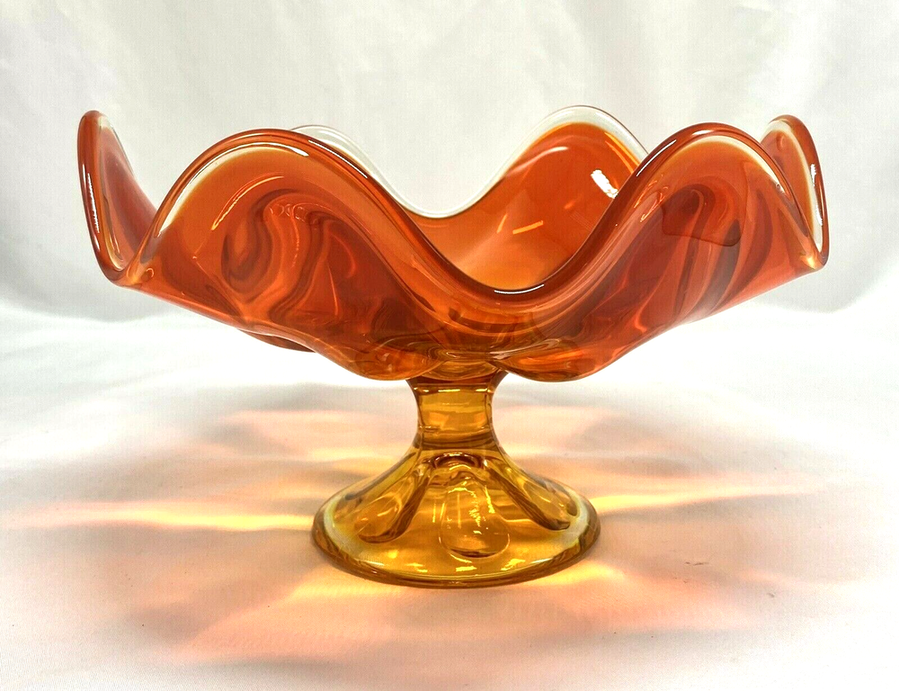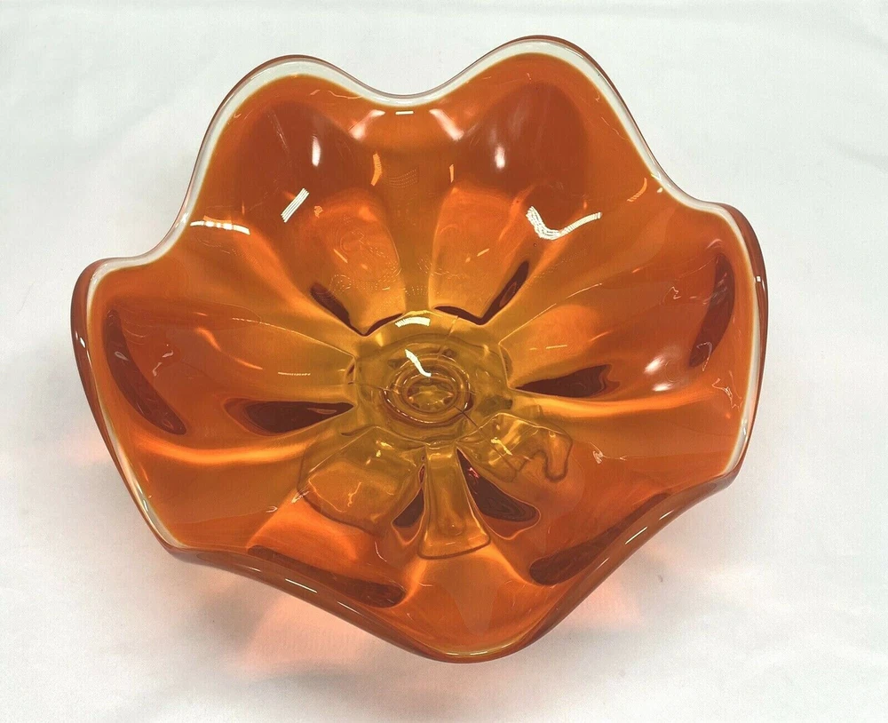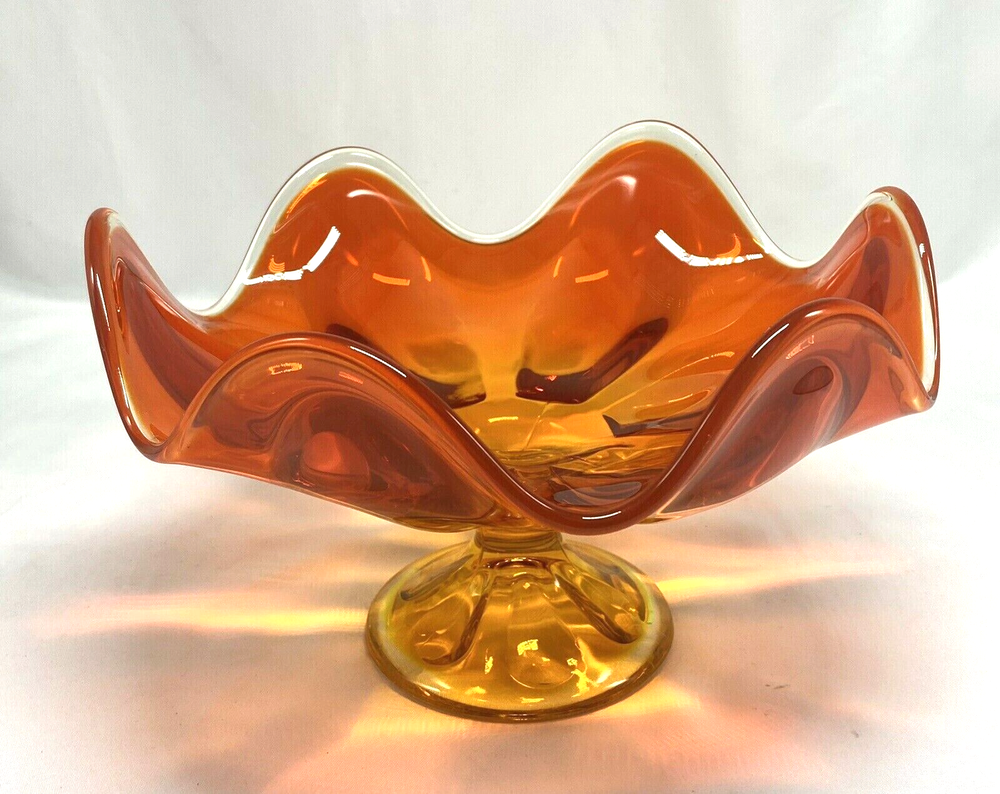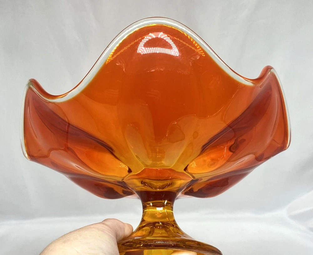 Viking Art Glass Bowl Compote Orange Amberina Clear Edge 6 Petal. 9 1/4" wide x approx 6" high Condition is used in good shape no chips or cracks Shipped with USPS Priority Mail