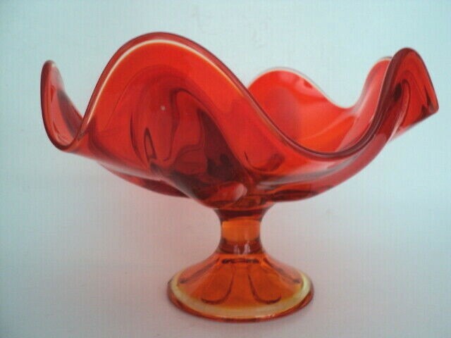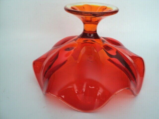 Really cool Vintage 6 petal footed compote bowl in orange amberina made by Viking. 9" wide and 6 1/8" tall. Nice condition with no nicks,chips,cracks,metal marks or repairs. Sent Priority mail with tracking and insurance. Since this is a large fragile item, we would not be able to combine same day wins. BUT we gladly refunf any excess poostage over $1.00. Sent priority mail. Thanks for looking!