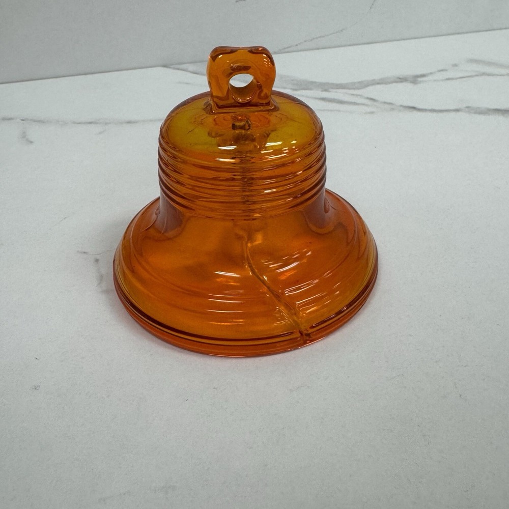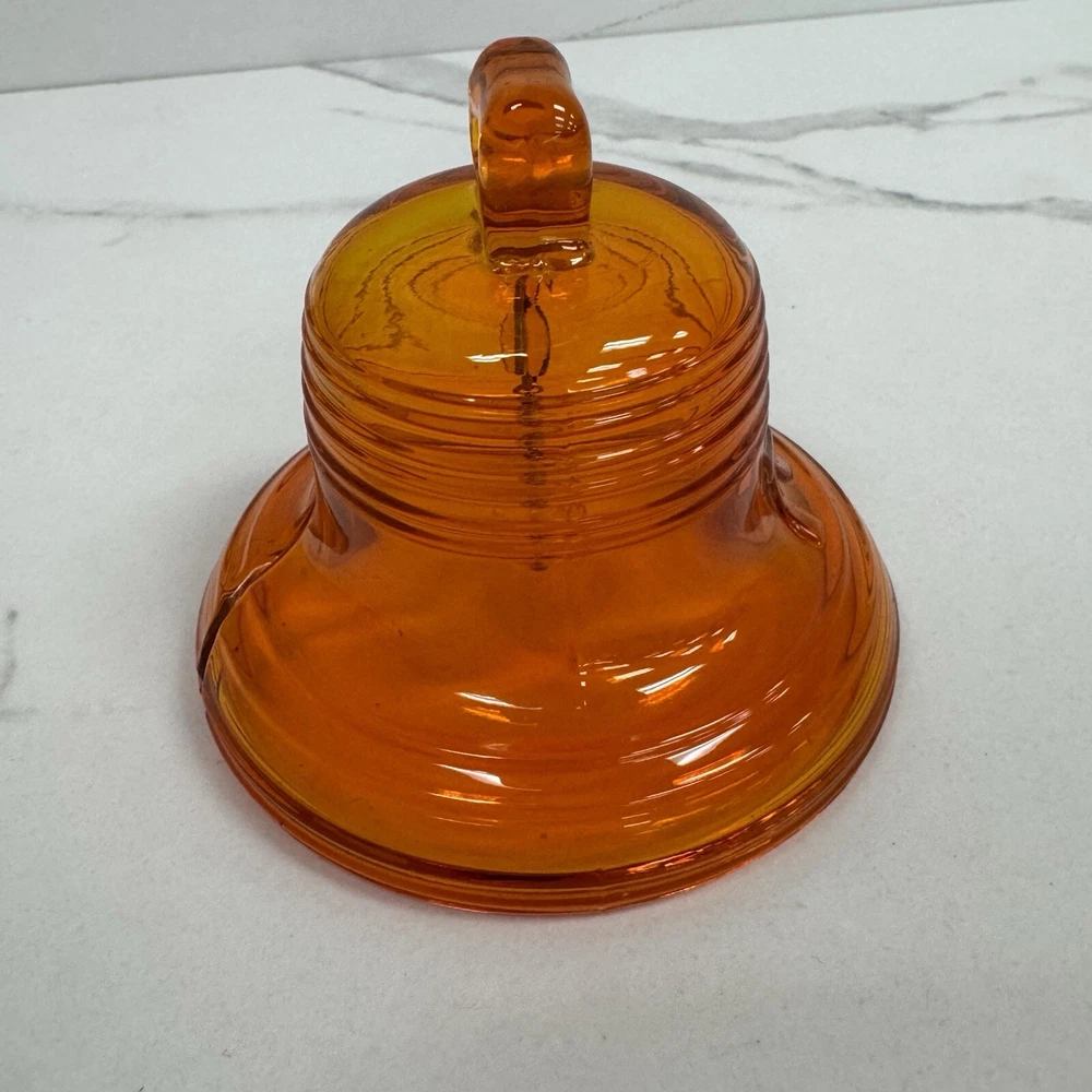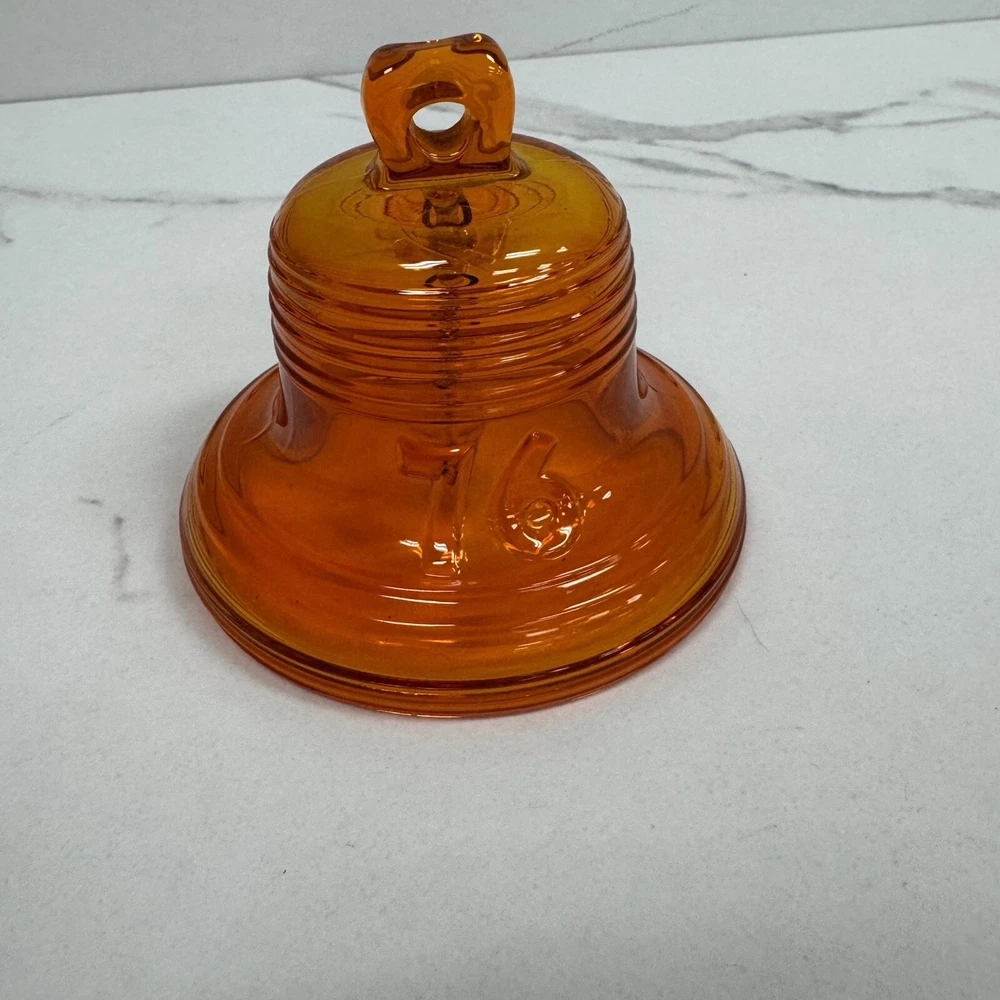 This Viking Epic Mid Century Modern Persimmon Orange Art Glass Liberty Bell is a vintage bell originating from the Americas in the late 20th century. It features a glossy finish and a Mid-Century Modern style, making it a decorative piece with a unique design. Made of glass, it embodies the artistic production style of the era, showcasing the intricate artistry of the time.