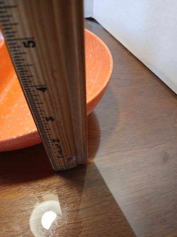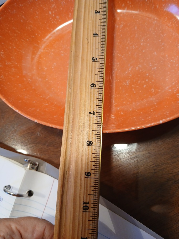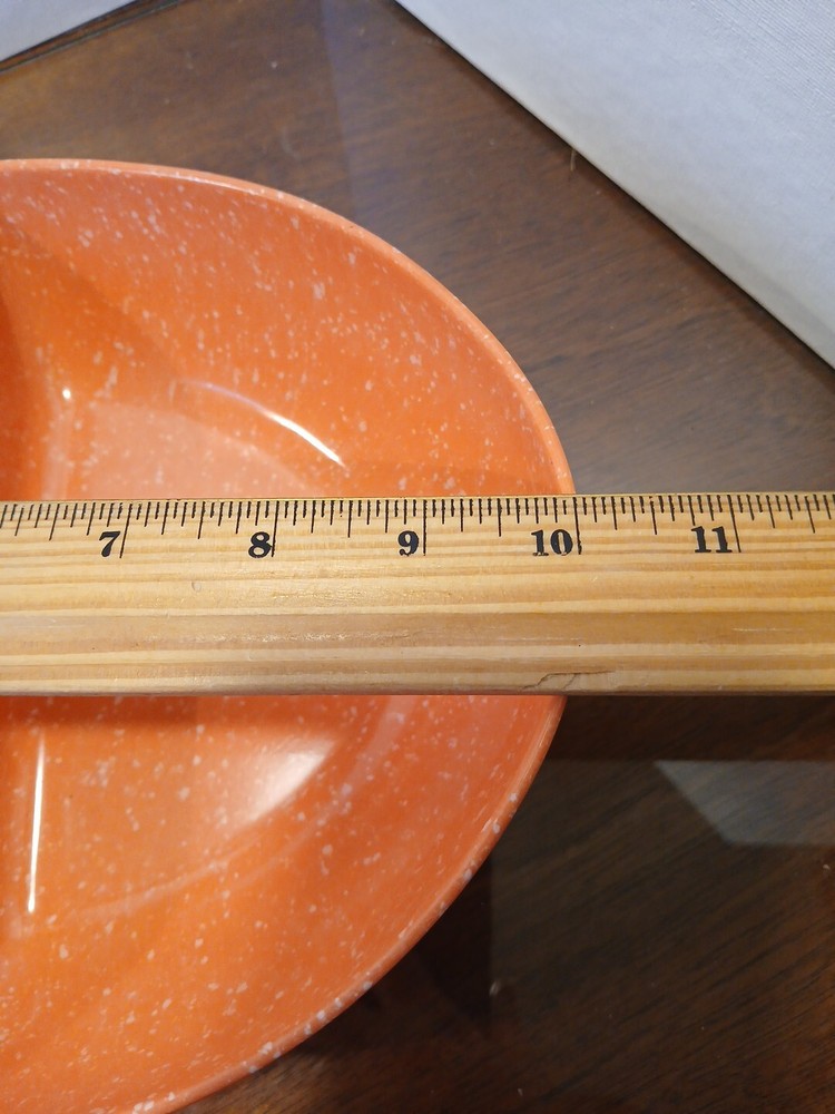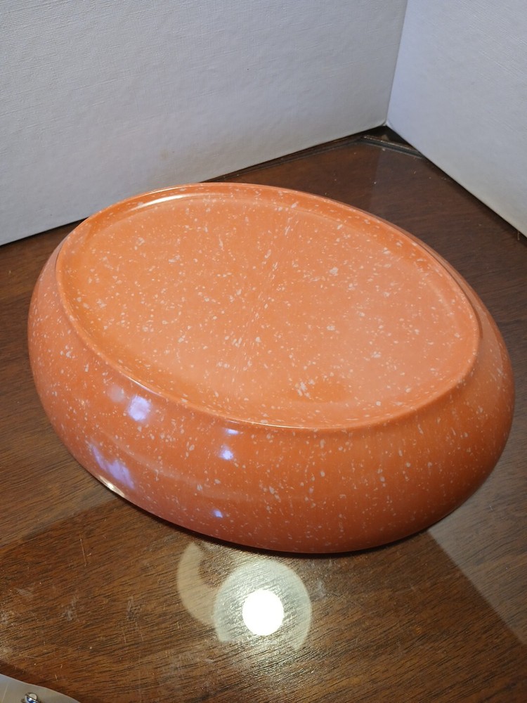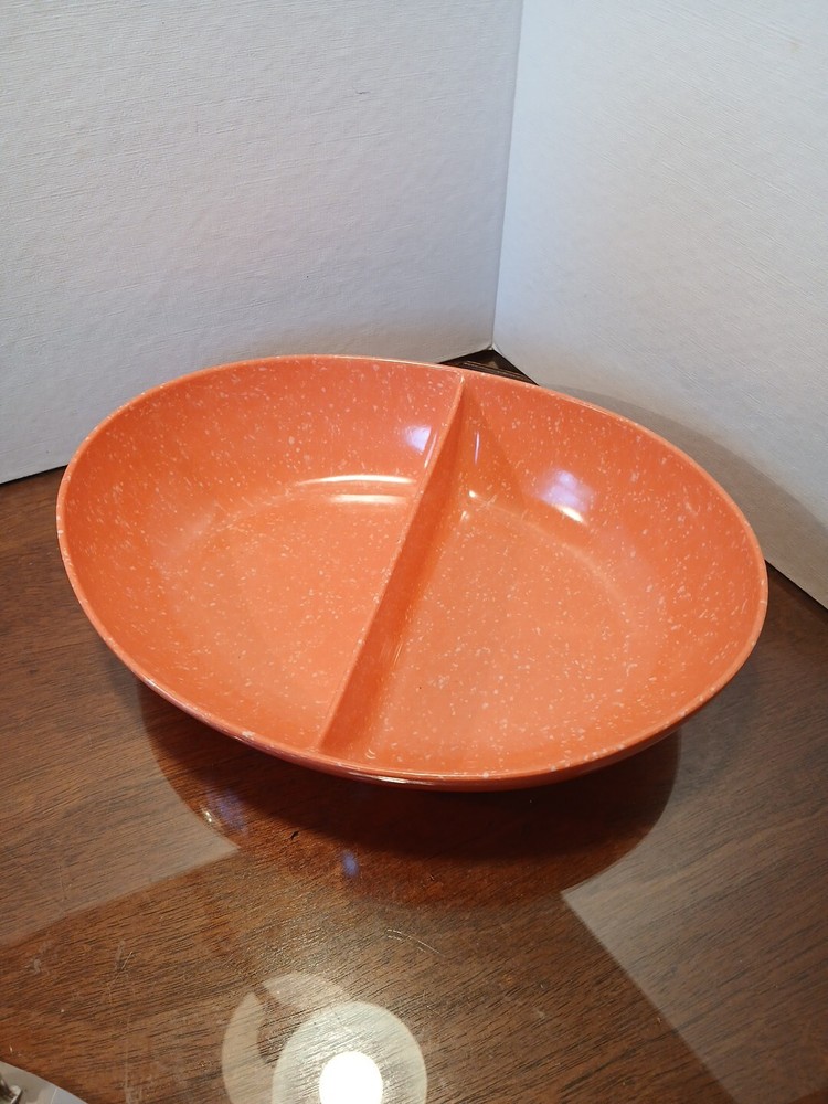 This vintage melamine serving bowl is a must-have for any MCM enthusiast. The oval shape and speckled orange color make it a unique addition to any kitchen or dining room. With two compartments, this bowl is perfect for serving salad or other dishes, and its 10" L x 8" W x 2.5" H dimensions ensure that it will hold up well on any table. Crafted from durable melamine material, this original piece is not a licensed reproduction, but it is a high-quality serving dish that will last for years to come. Whether you're using it for a special occasion or just for everyday meals, this bowl is sure to impress your guests. 4a