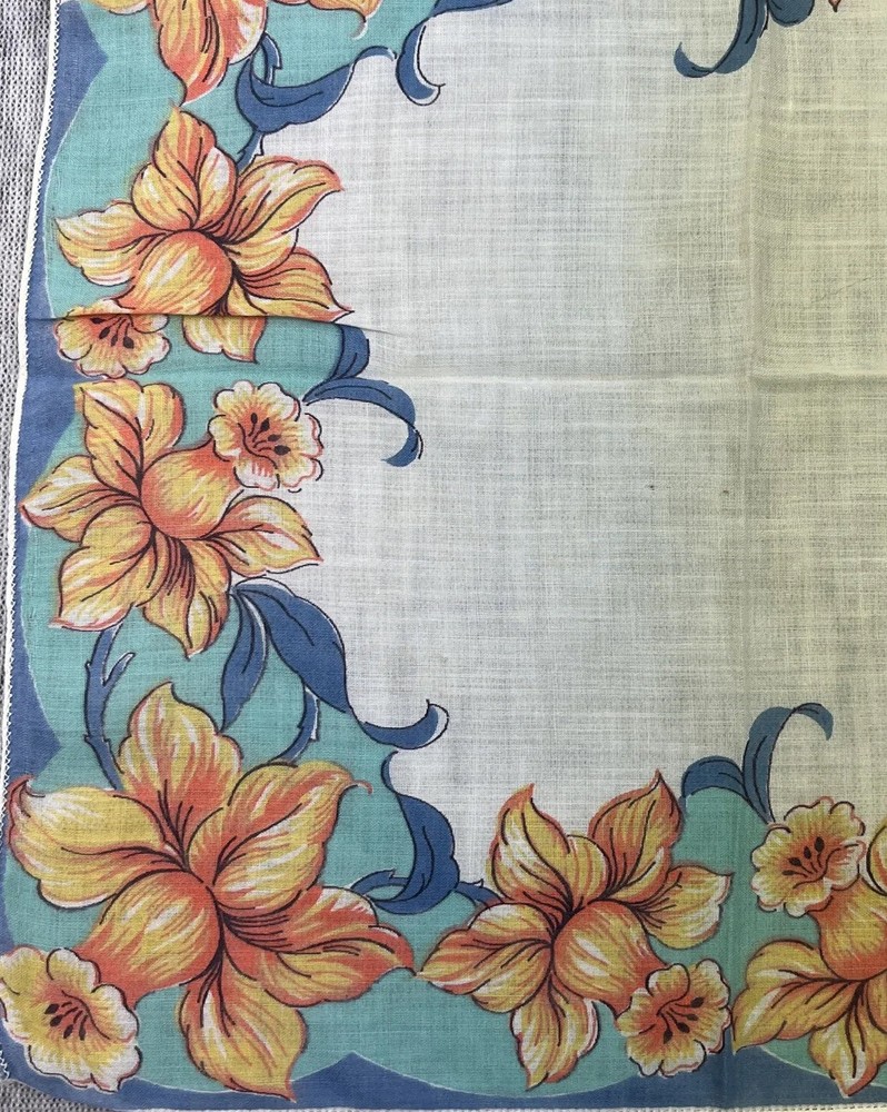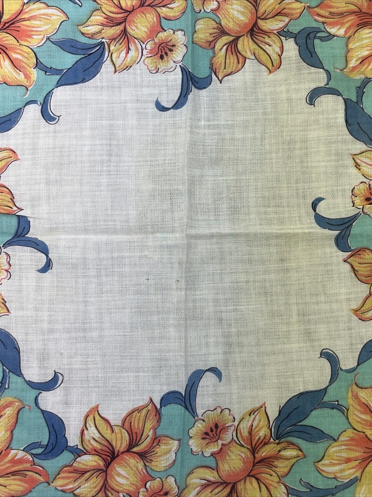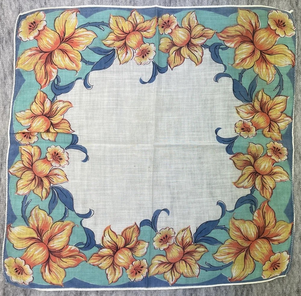 Vintage 12” Lady’s Mid century HANDKERCHIEF Orange Flowers Blue Border Hanky. Condition as shown. White part is dingy. Please see pictures for full description. Shipped with USPS GROUND Advantage.