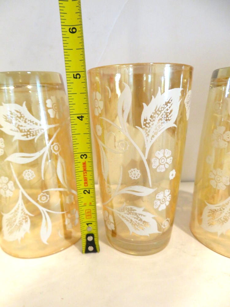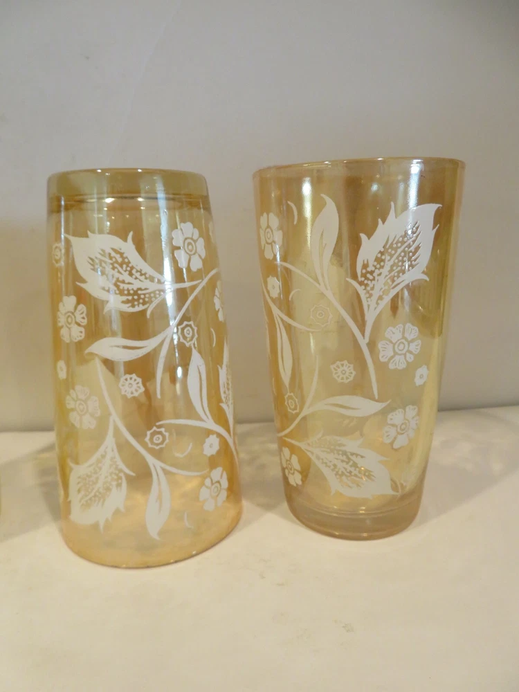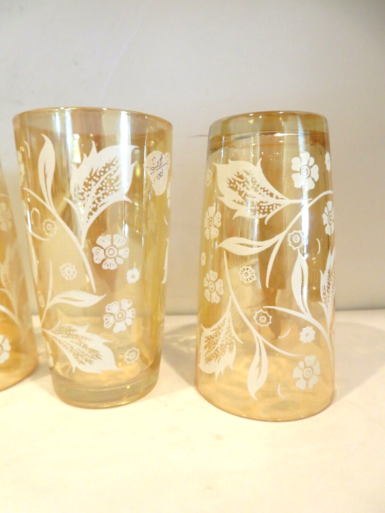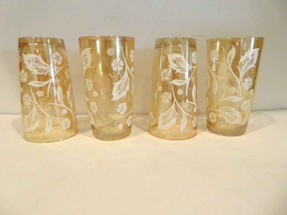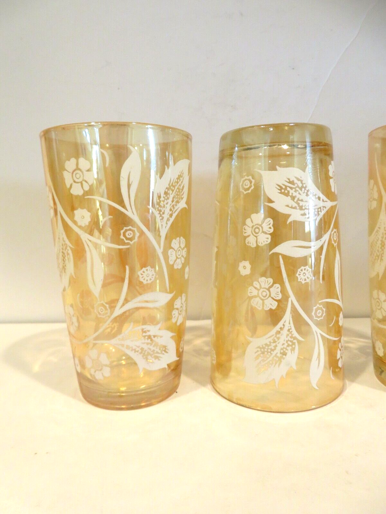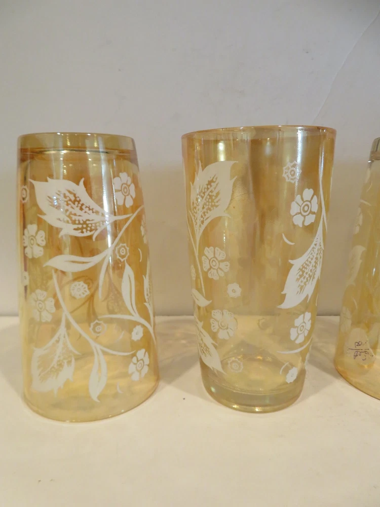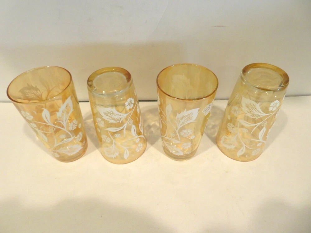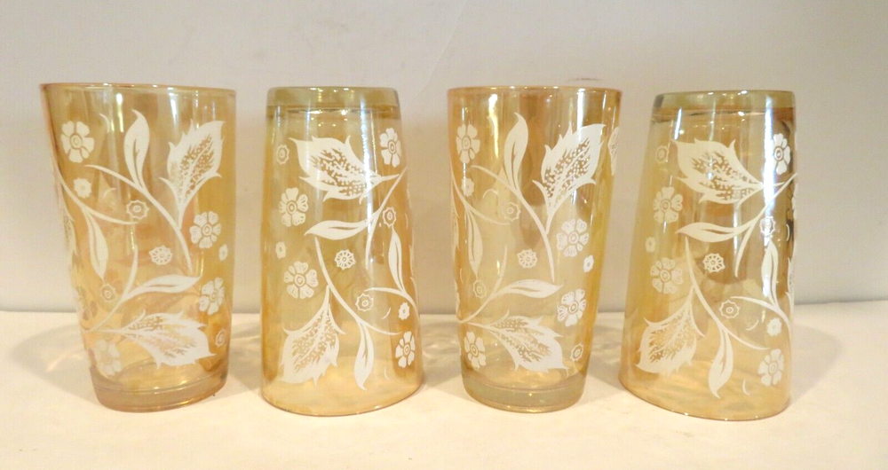 Vintage (1940s) Jeannette Marigold Iridescent Carnival Highball Glasses, set of 4. They are 5.125 inches tall and 2.75 inches wide at top rim. There are no noted areas of concerns, no chips, cracks, breaks, repairs, or modifications. USPS Ground is preferred (cheaper) method of shipping and normally arrives in same amount of time as USPS Priority Mail, but you decide. Description is done to the best of our knowledge and ability. - Please review all pictures carefully, as they are part of the description. If you need more pictures or have questions, please contact us. - Shipping is Monday thru Friday within three business days of payment thru PayPal. - No Stock Photos. Pictures you see are of the item we are selling and shipping to you from Phoenix, AZ 85037. - We will combine shipping if you are purchasing more than one item, just ask for an invoice when done shopping. - Thank you for looking and please check out our store for other great collectibles, and fun, unusual, or unexpected items.