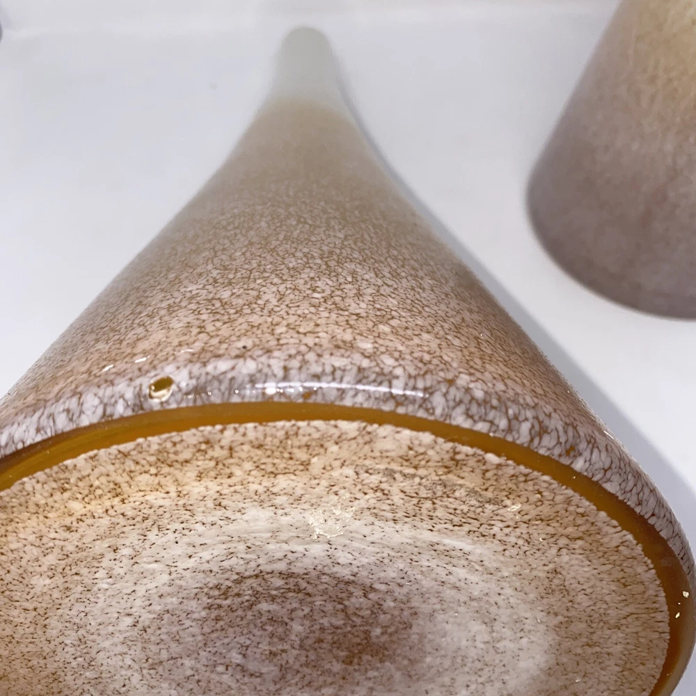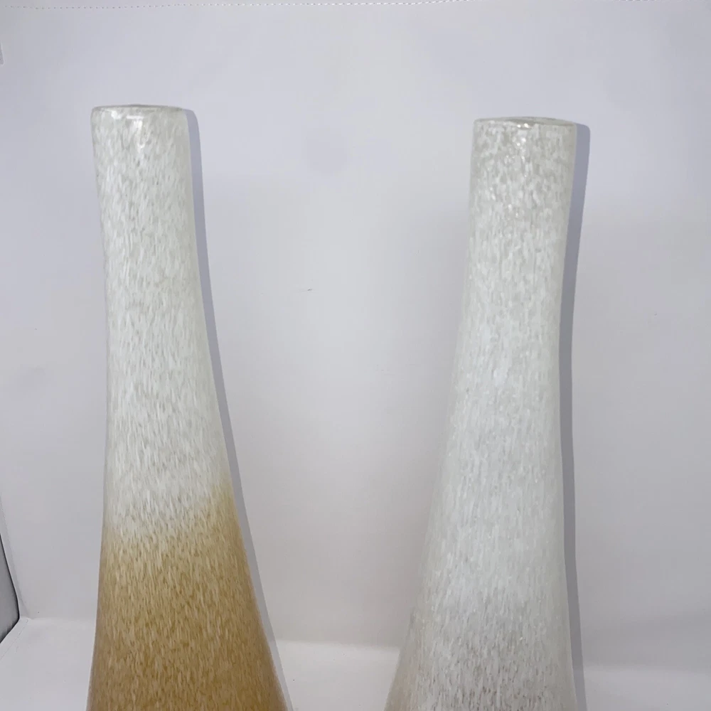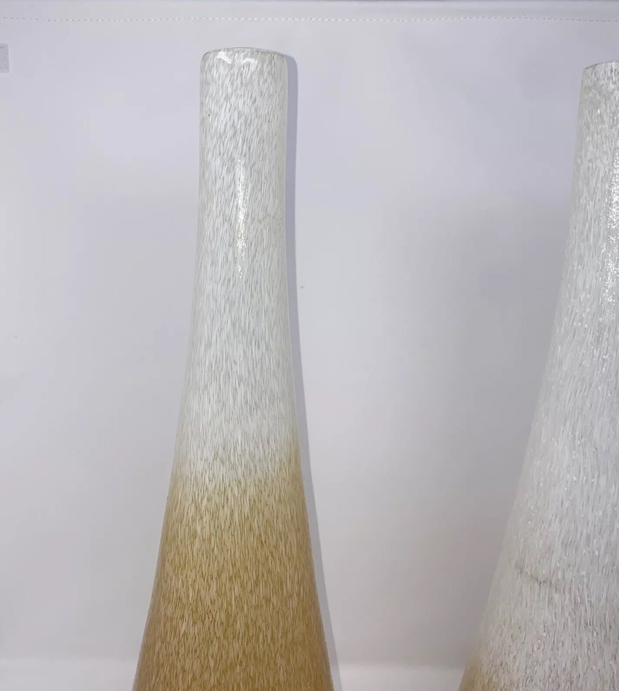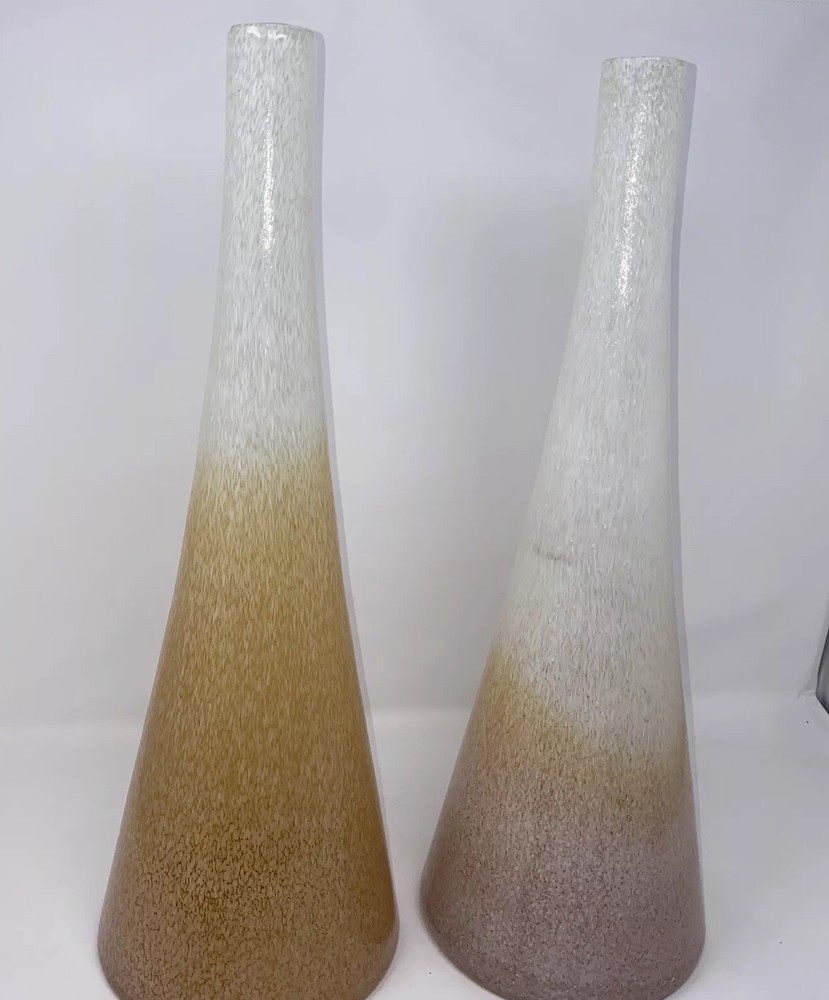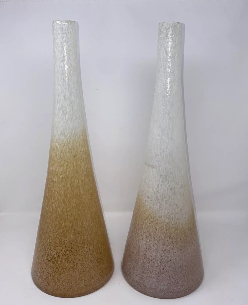This stunning pair of vintage Italian blown glass vases is a must-have for any collector. The beautiful orange and pink color combination adds a pop of brightness to any room. The vases measure 19.5 inches in height and are crafted from high-quality glass material. The intricate details and Italian theme make these vases a unique addition to any decorative pottery and glassware collection. Perfect for displaying fresh flowers or as a standalone decorative piece, these vases are sure to impress. 1 has small piece of white finish has fallen off see photo