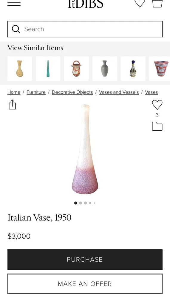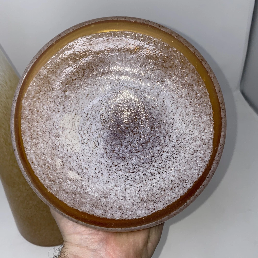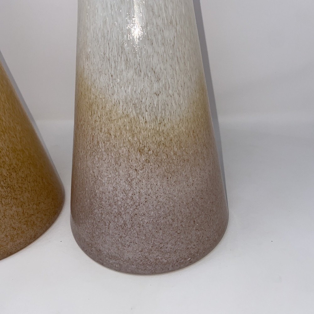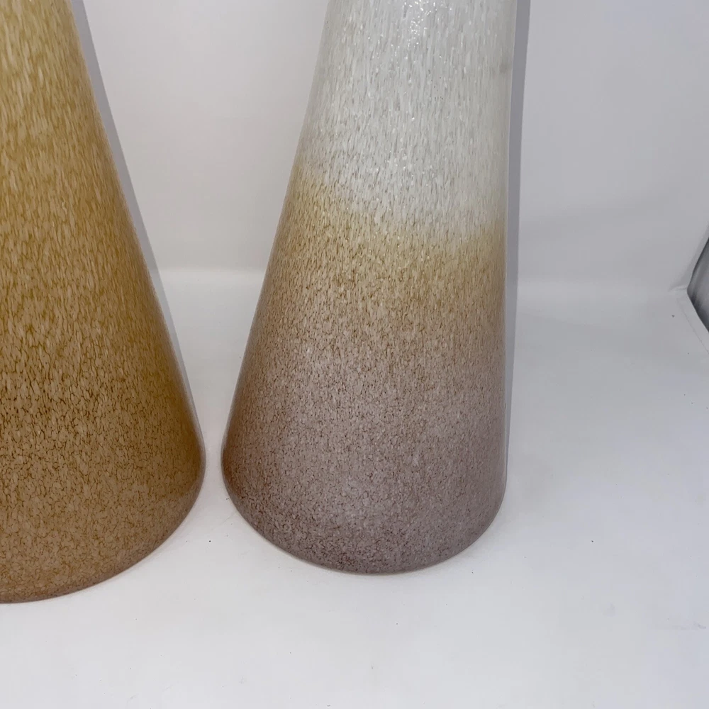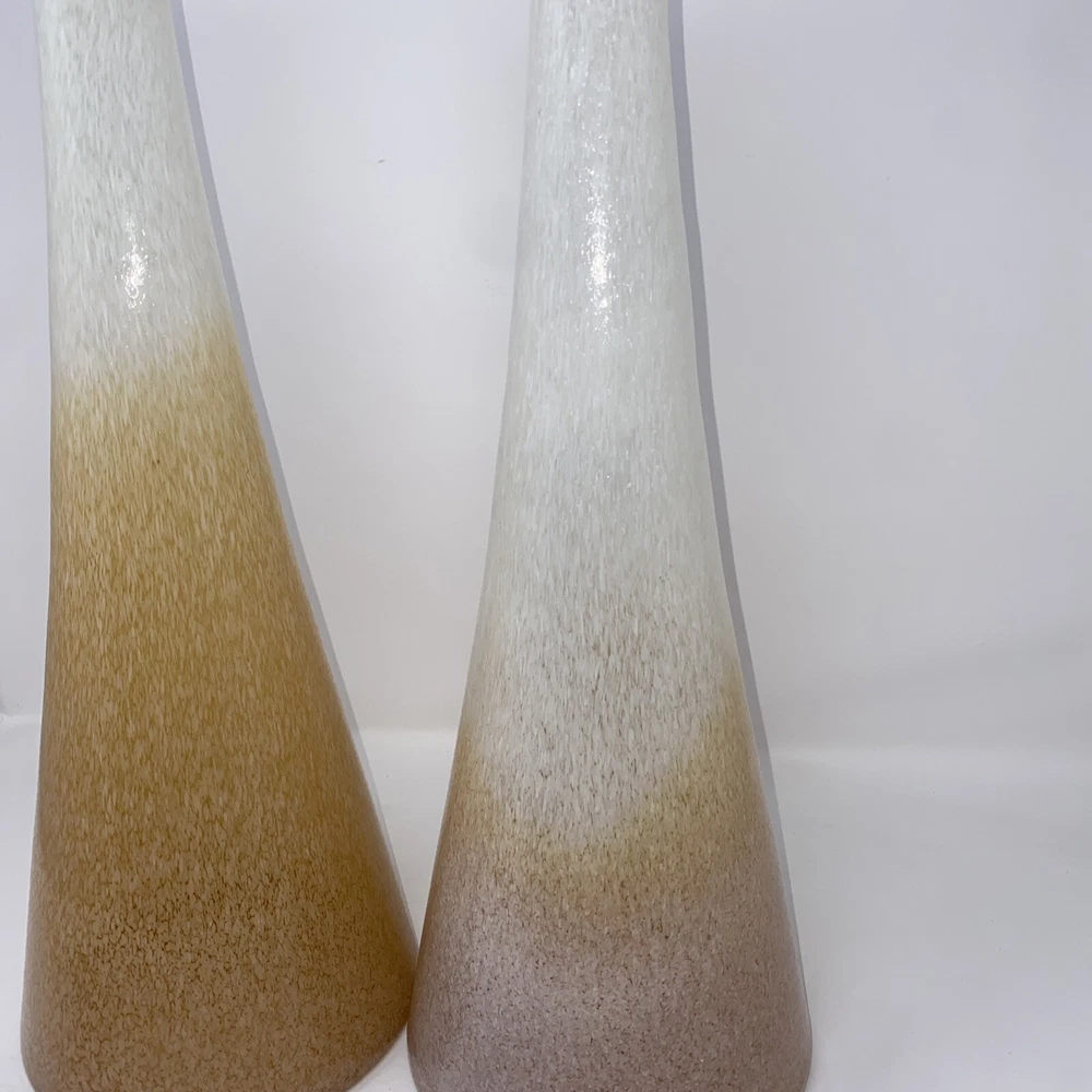 This stunning pair of vintage Italian blown glass vases is a must-have for any collector. The beautiful orange and pink color combination adds a pop of brightness to any room. The vases measure 19.5 inches in height and are crafted from high-quality glass material. The intricate details and Italian theme make these vases a unique addition to any decorative pottery and glassware collection. Perfect for displaying fresh flowers or as a standalone decorative piece, these vases are sure to impress. 1 has small piece of white finish has fallen off see photo
