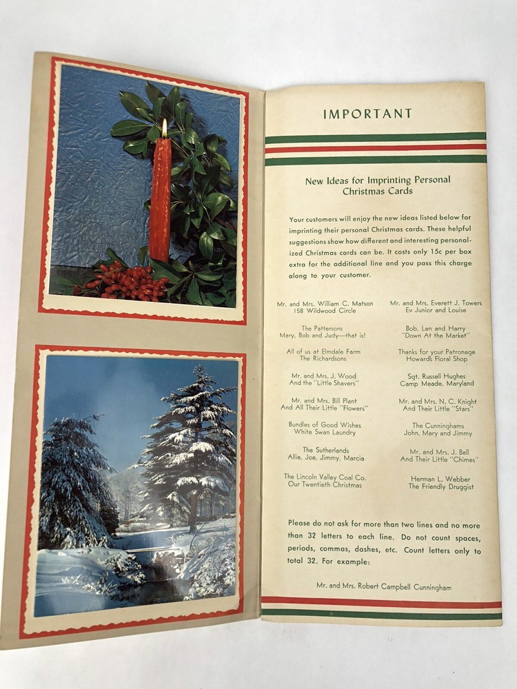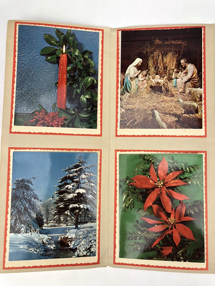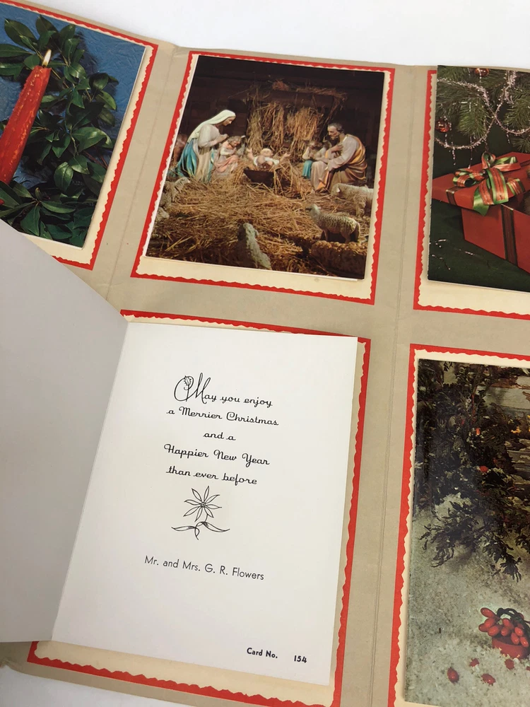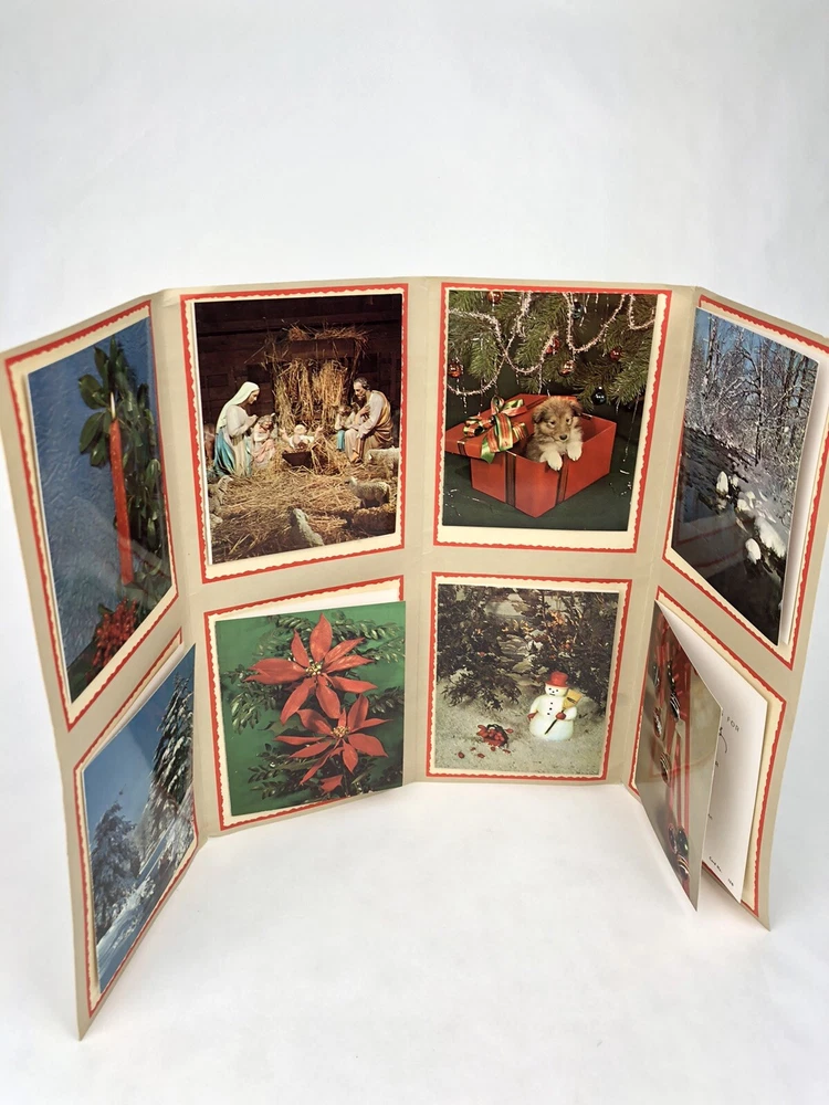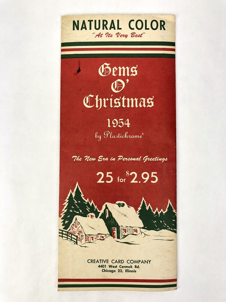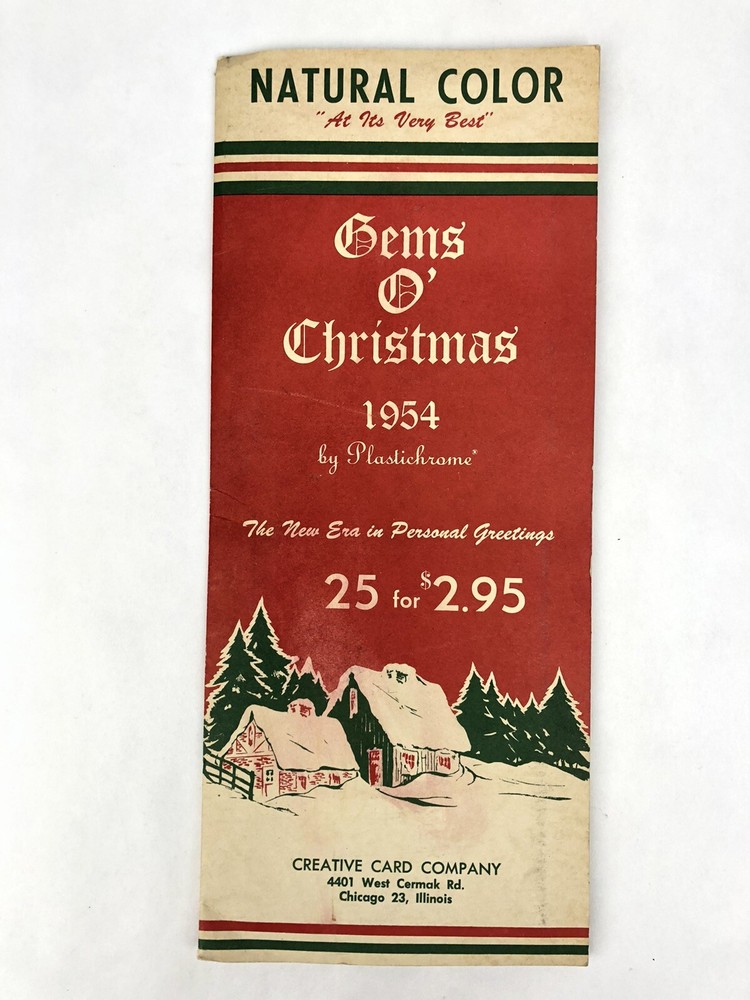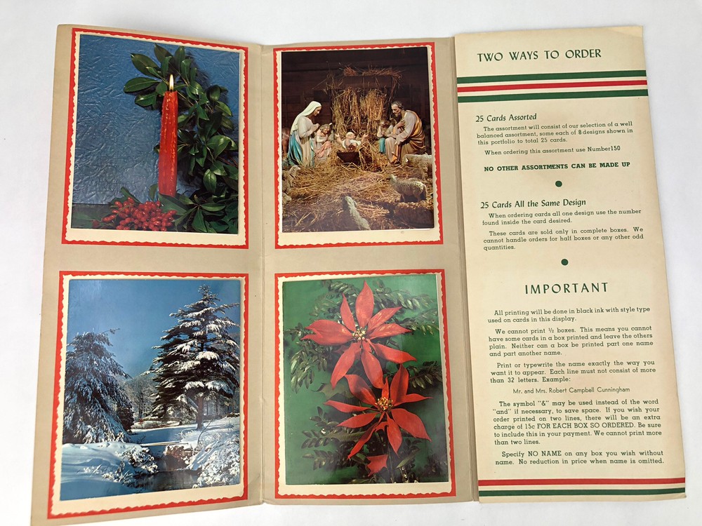 Vintage 1954 Gems O’ Christmas Plastichrome Greeting CARDS SAMPLE BOOK by Creative Card Company Chicago, Ill. 4-fold folder, opens up to reveal 8 different Plastichrome Christmas greeting card samples, with sales info inside. Measures 13” x 5 1/2” closed. CONDITION : Excellent, vintage pre-owned condition. Some light wear to cover. Cards like new inside. See photos for details. Please message for any questions, thanks.