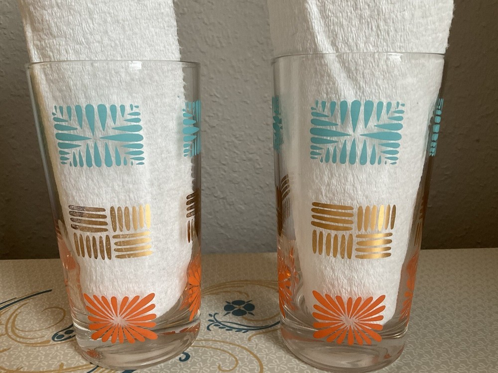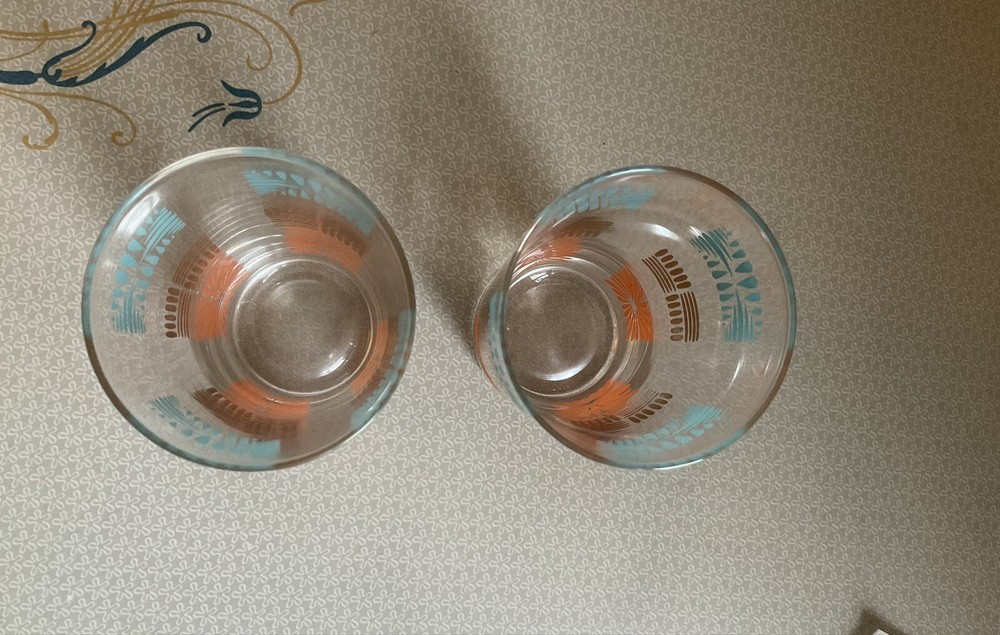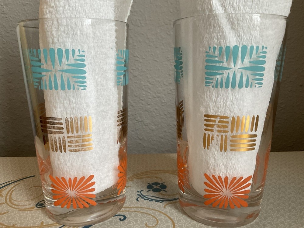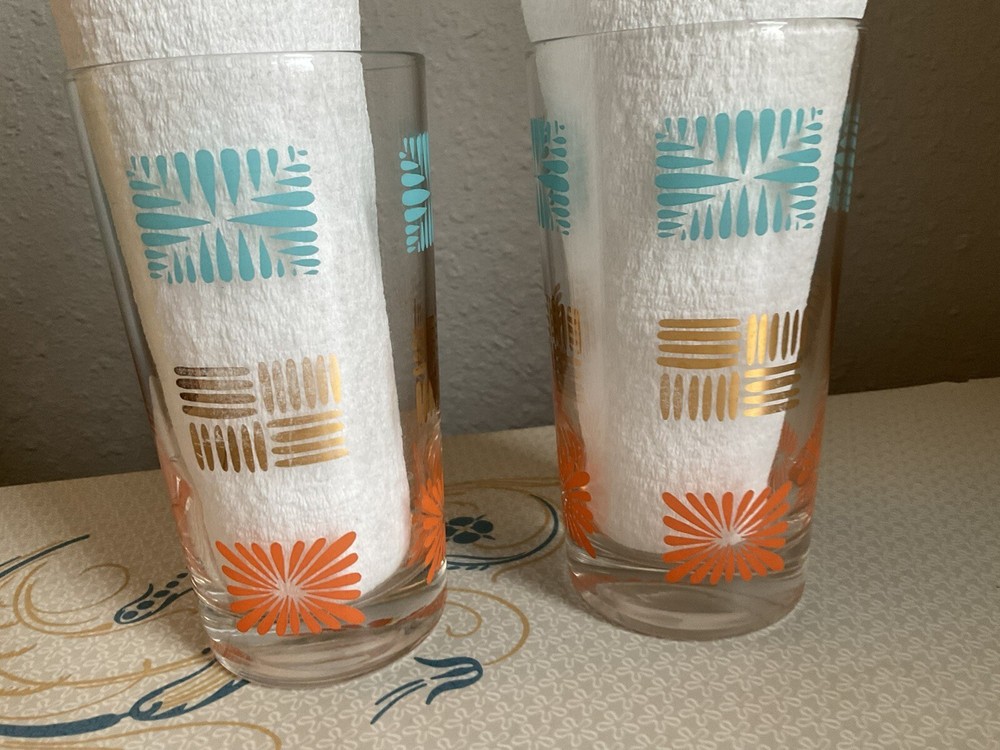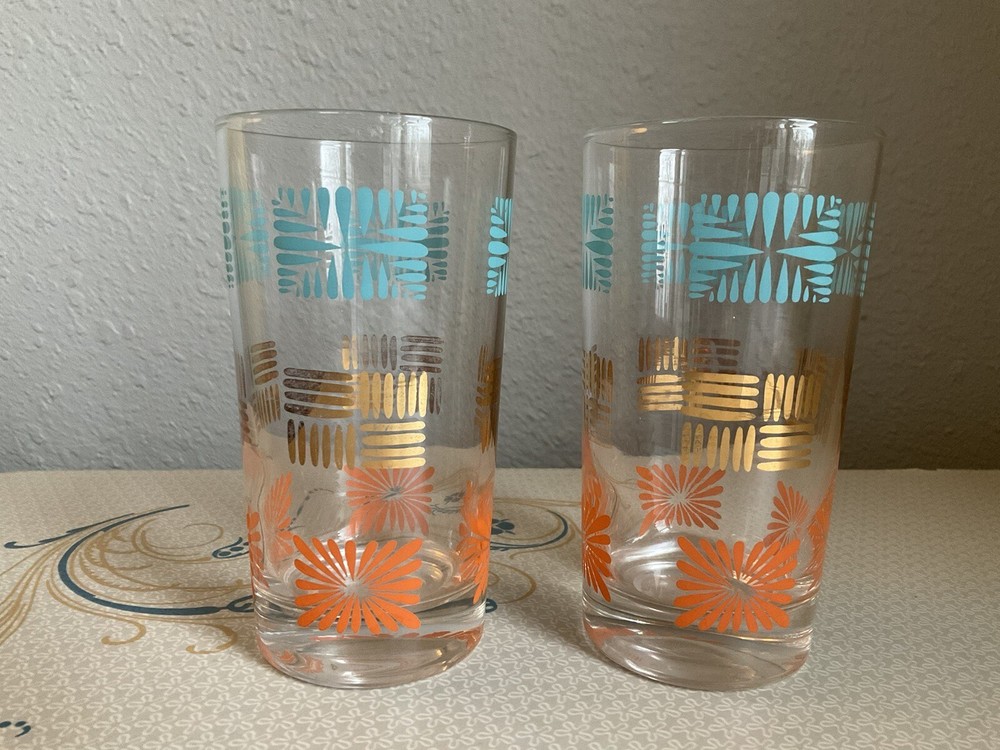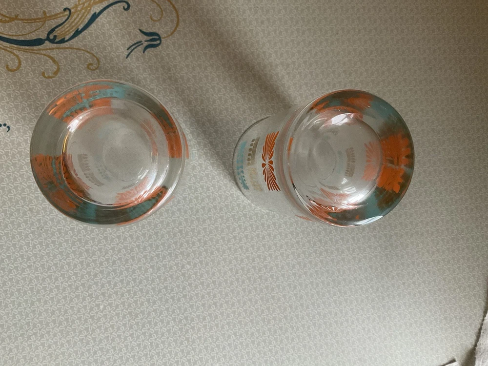 Introducing a vintage set of mid-century cocktail glasses that exude atomic vibes. These stunning tumblers have a unique orange, gold, and blue color scheme that is sure to impress. Their design is a perfect representation of the 1960s era and will add a touch of nostalgia to your barware collection. Crafted with great attention to detail, these glasses are perfect for any cocktail lover who appreciates the finer things in life. The gold on the tumblers in a couple spots has some slight gentle fade. They still have a beautiful vintage look and vibe! Don’t forget to view other vintage tumbler’s in my other items shop, thanks for viewing!