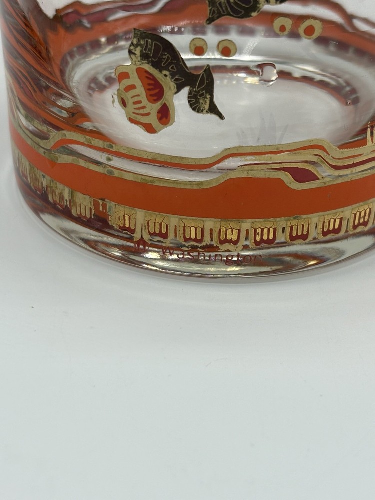 Vintage 1960’s Pisinski Washington Red Orange Floral 22K Gold Trimmed Glasses set of 6. They measure 3.25” tall and 3” across. Some of the gold finishing has worn off but they still display nicely. Overall good condition. Comes from a smoke free home.