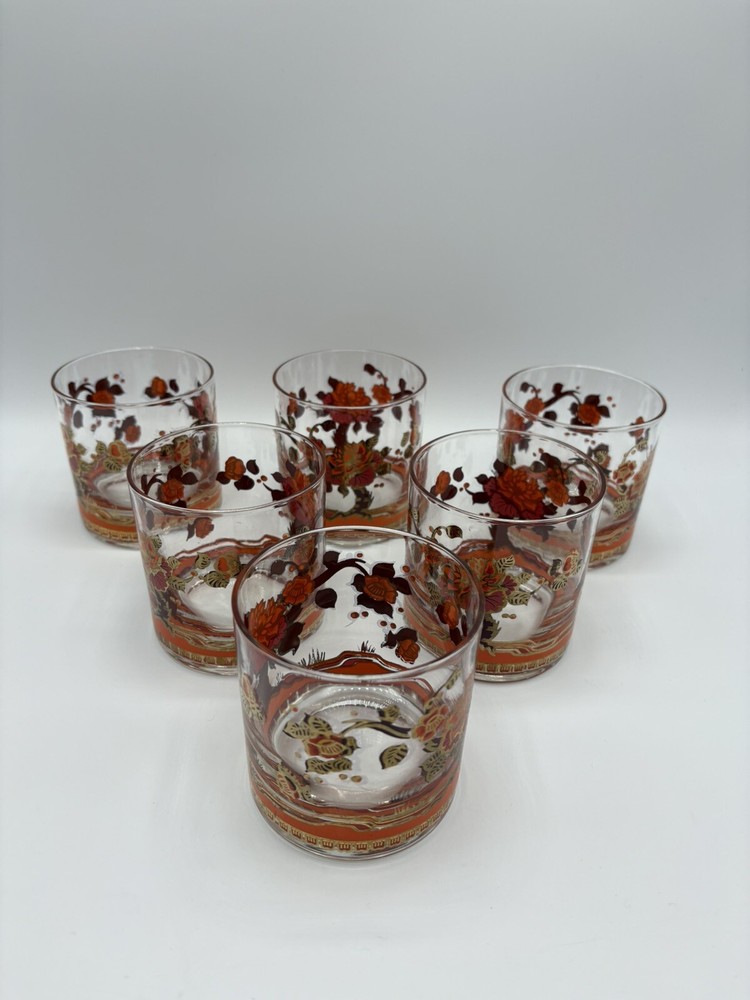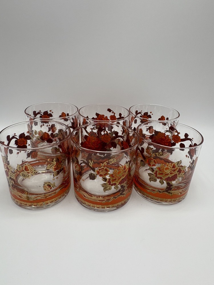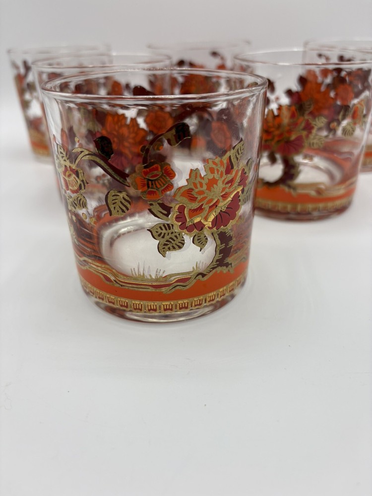These gorgeous vintage glasses add instant retro charm! The bold floral design and 22K gold trim make them stand out, even with some slight wear. Perfect for display or use—great condition and beautifully unique. Love the pop of red and orange!