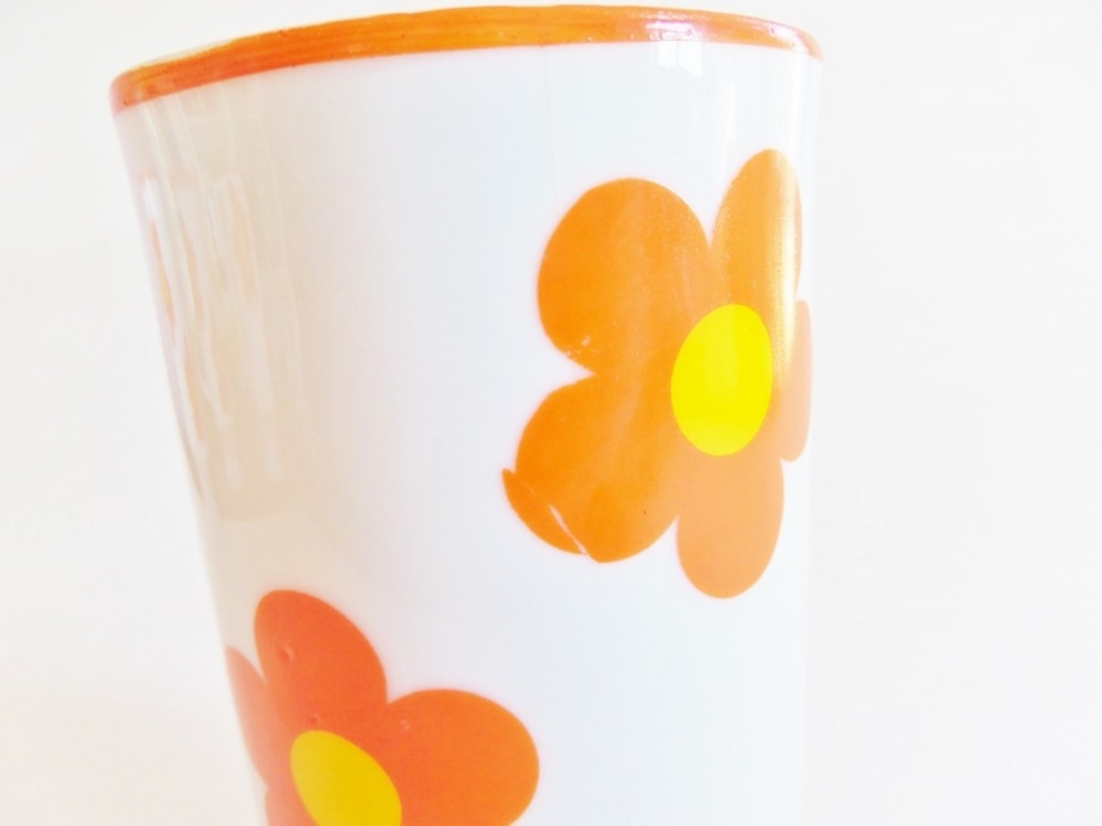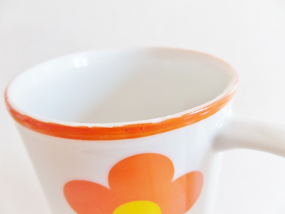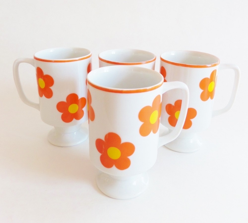 This is a fun set of 4 retro footed coffee cups, this style was often used for Irish coffee in the 1960s and 1970s. The mugs are ceramic with bright orange flowers and sunny yellow centers. They would make any morning cheery! This set is in good condition with age appropriate wear. One of the mugs has a transfer that slipped a little during the application at the factory. Another has a flaw on the bottom, but it looks like it was done at the factory because there is clear glaze in the crack. One of the mugs does have a couple of flea bites on the edge; see the last picture. The mugs measure 4.75" high X 4" wide including the handle. They hold 8 ounces.
