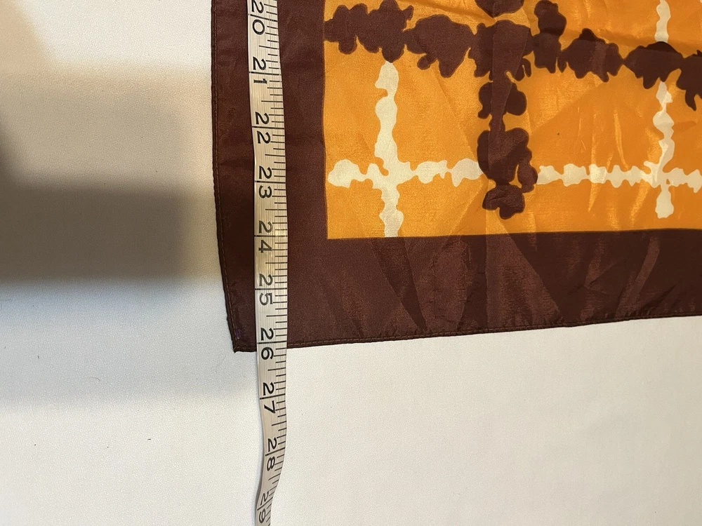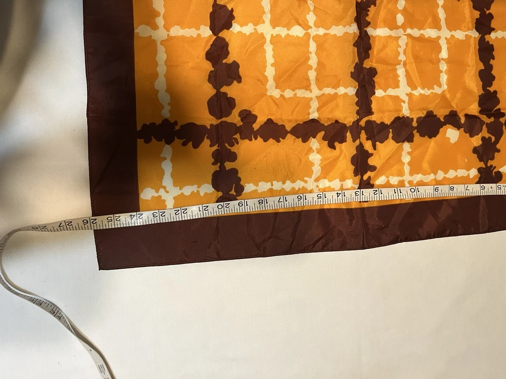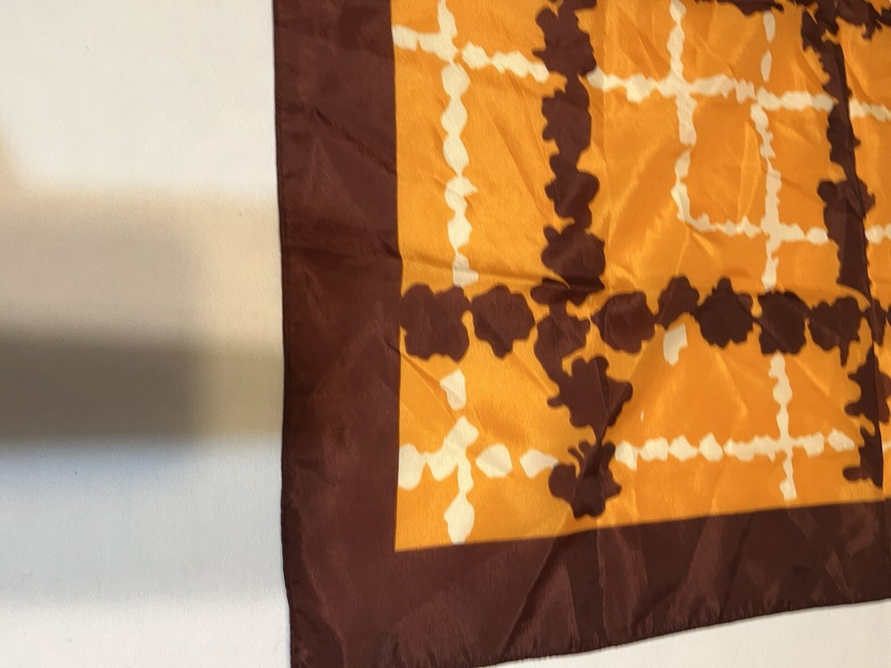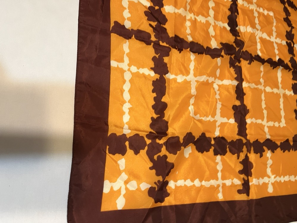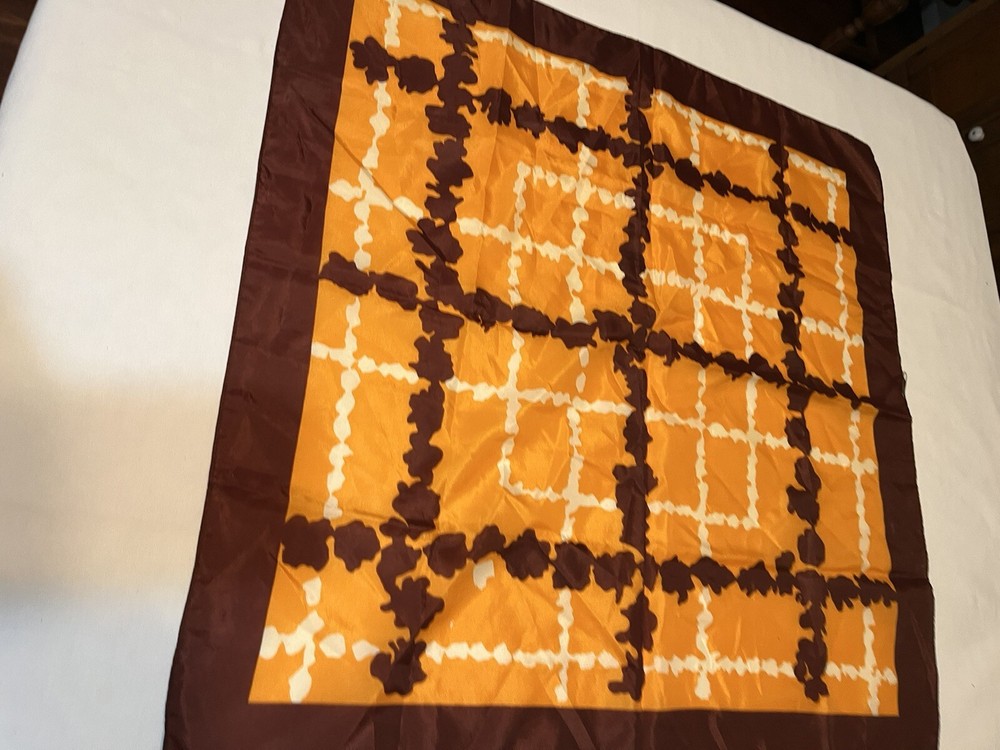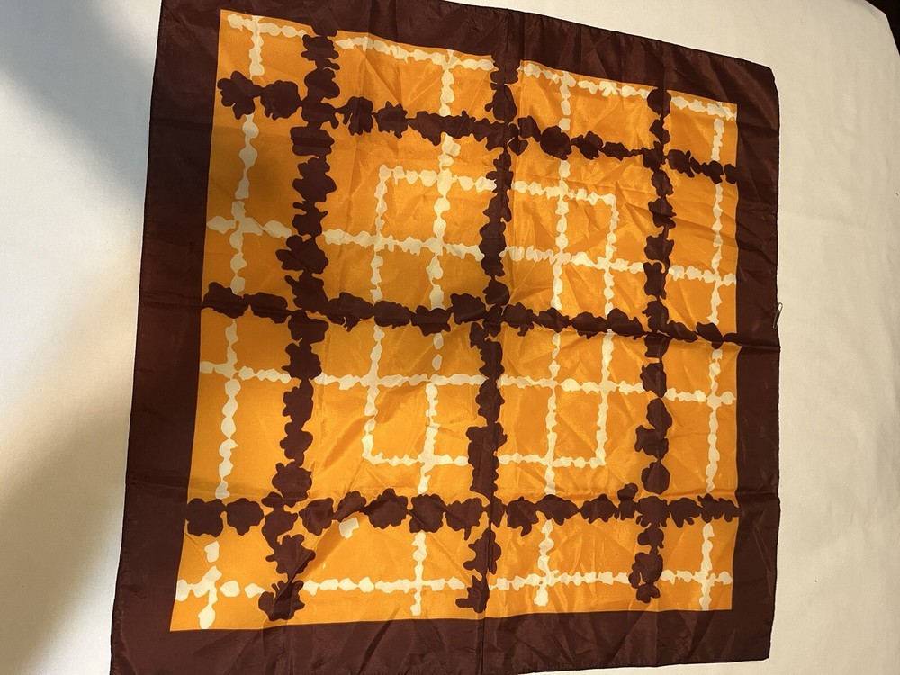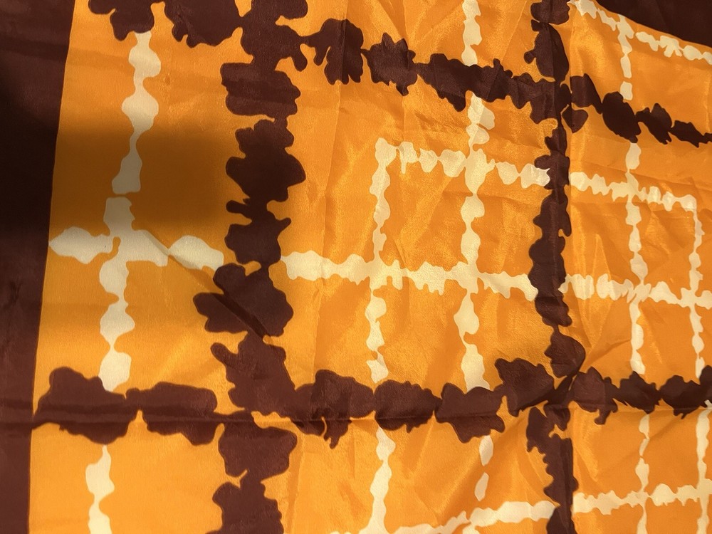 Vintage scarf 1960-1970s Mid Century Modern Favorite color combo of brown, gold orange --harvest gold and Coppertone were the terms we used back in the day Now retiring Downsizing. No need for so many lovely items so no returns Excellent but vintage condition; nothing perfect from that long ago but saw no major flaws Please enlarge the pics so you can see clean, pet and smoke-free home