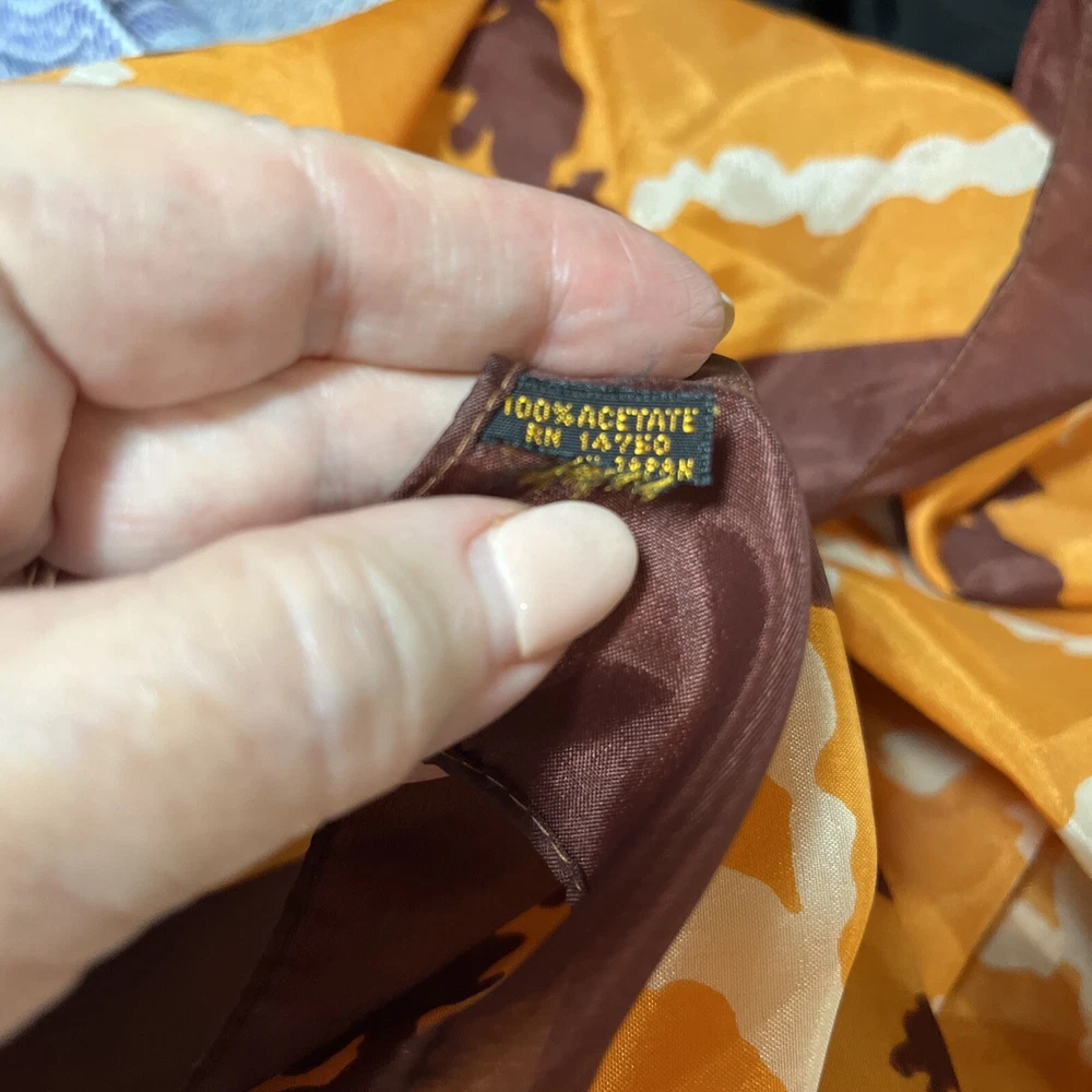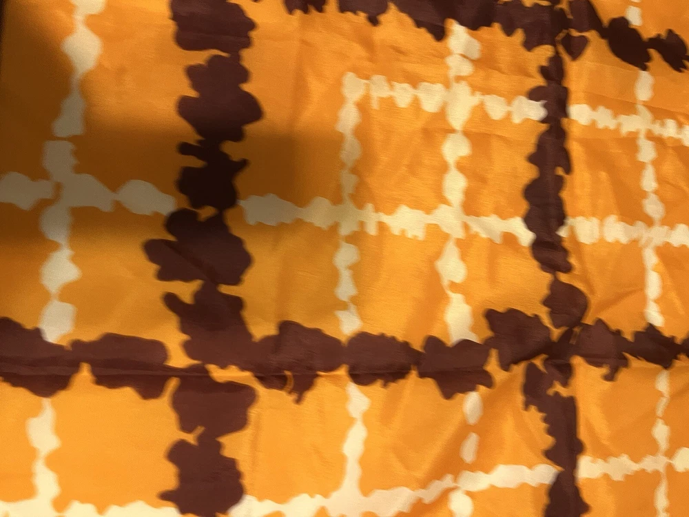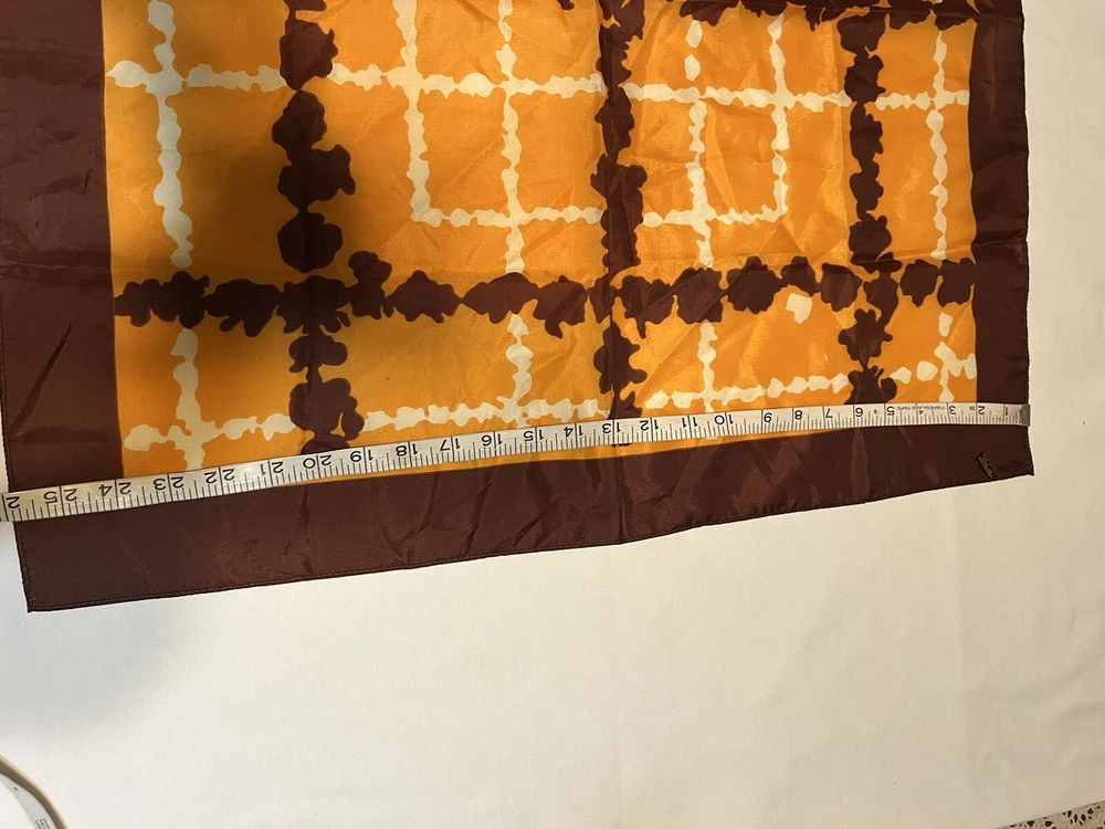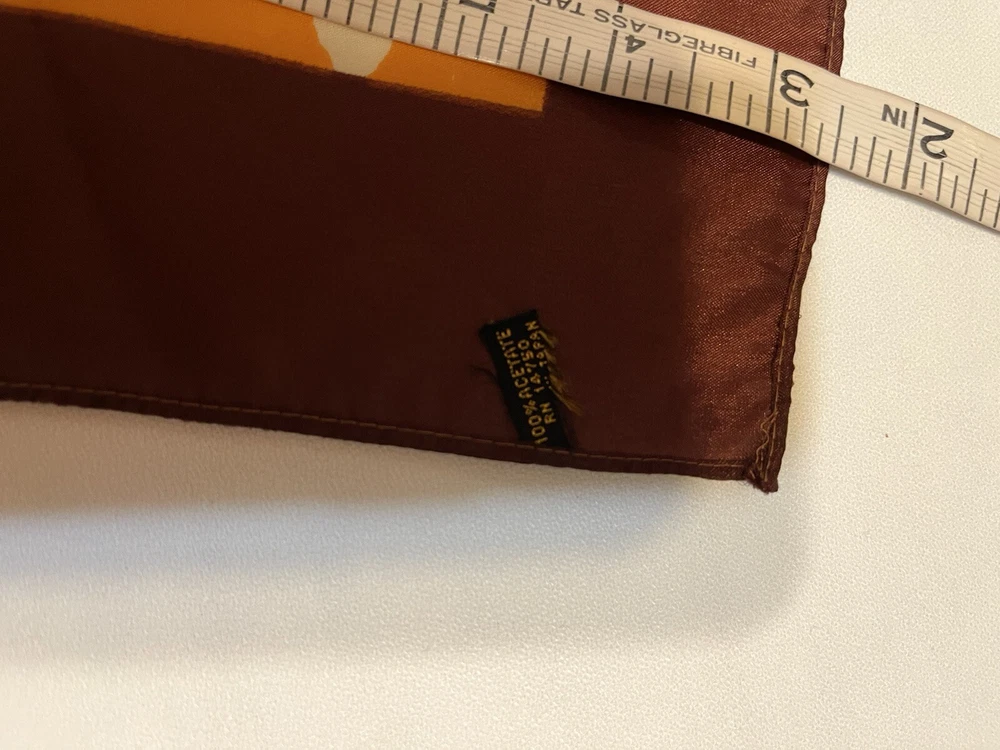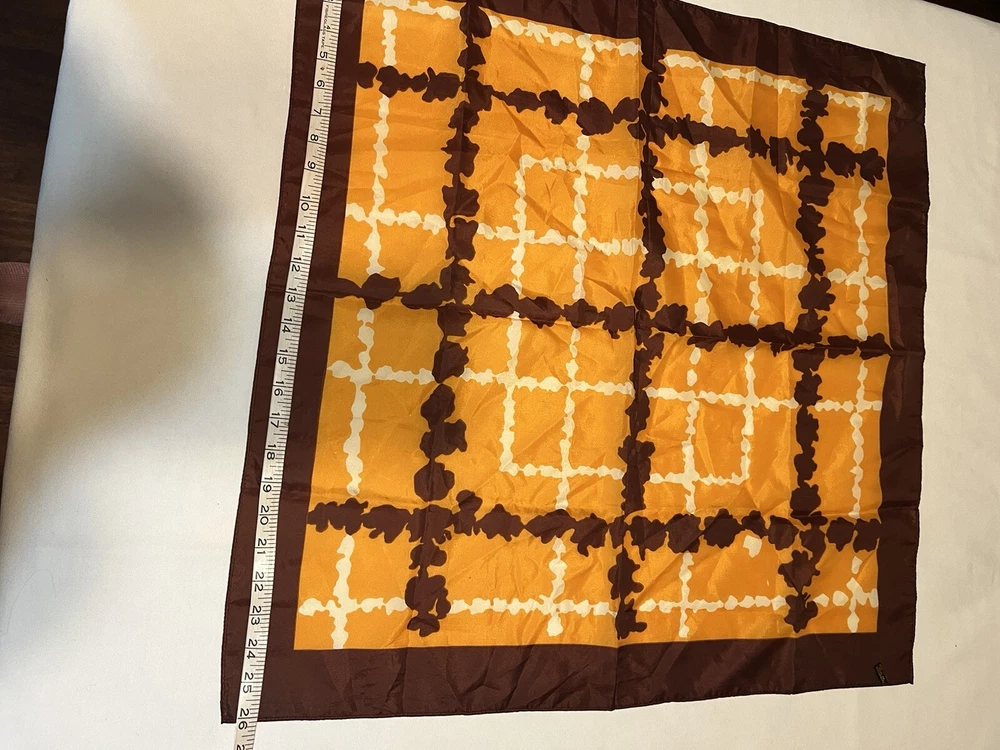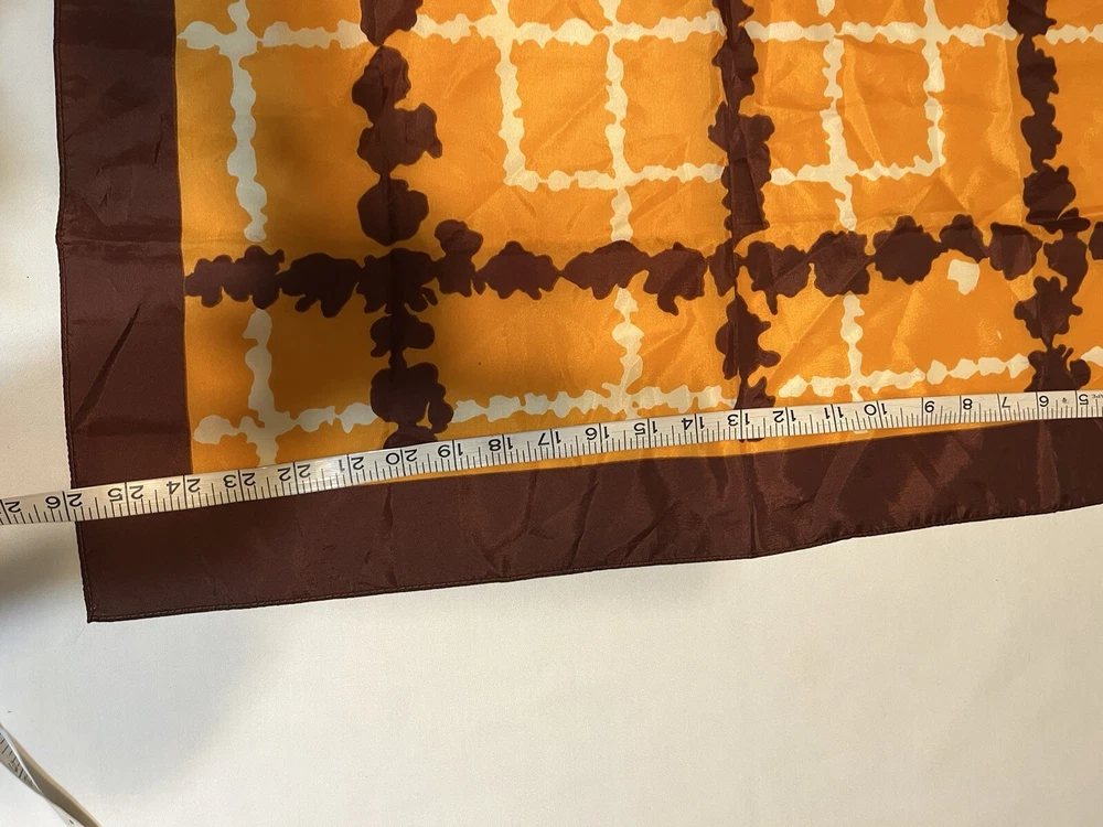 Vintage scarf 1960-1970s Mid Century Modern Favorite color combo of brown, gold orange --harvest gold and Coppertone were the terms we used back in the day Now retiring Downsizing. No need for so many lovely items so no returns Excellent but vintage condition; nothing perfect from that long ago but saw no major flaws Please enlarge the pics so you can see clean, pet and smoke-free home
