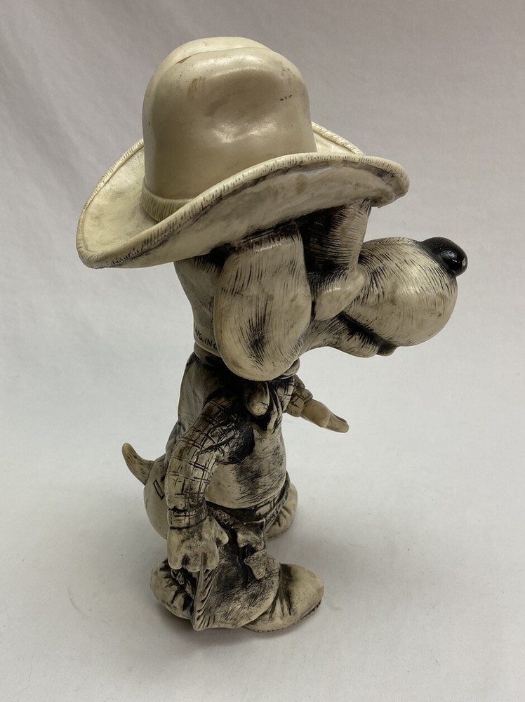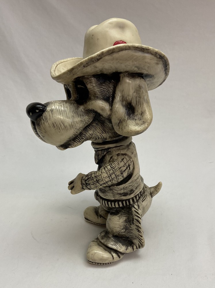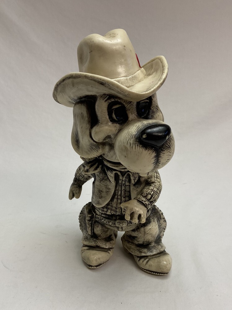 Vintage 1977 Hound Dog Cowboy Bank Creative MFG Hard Plastic 10" Tall. Bottom of foot has red sharpie on it that won’t come off.