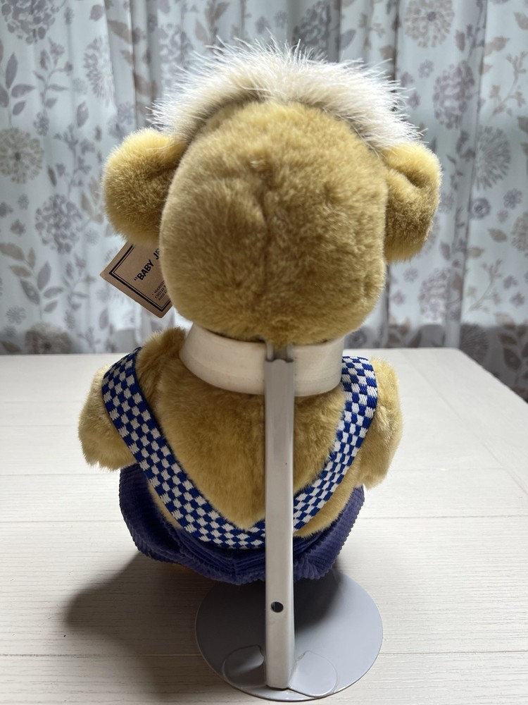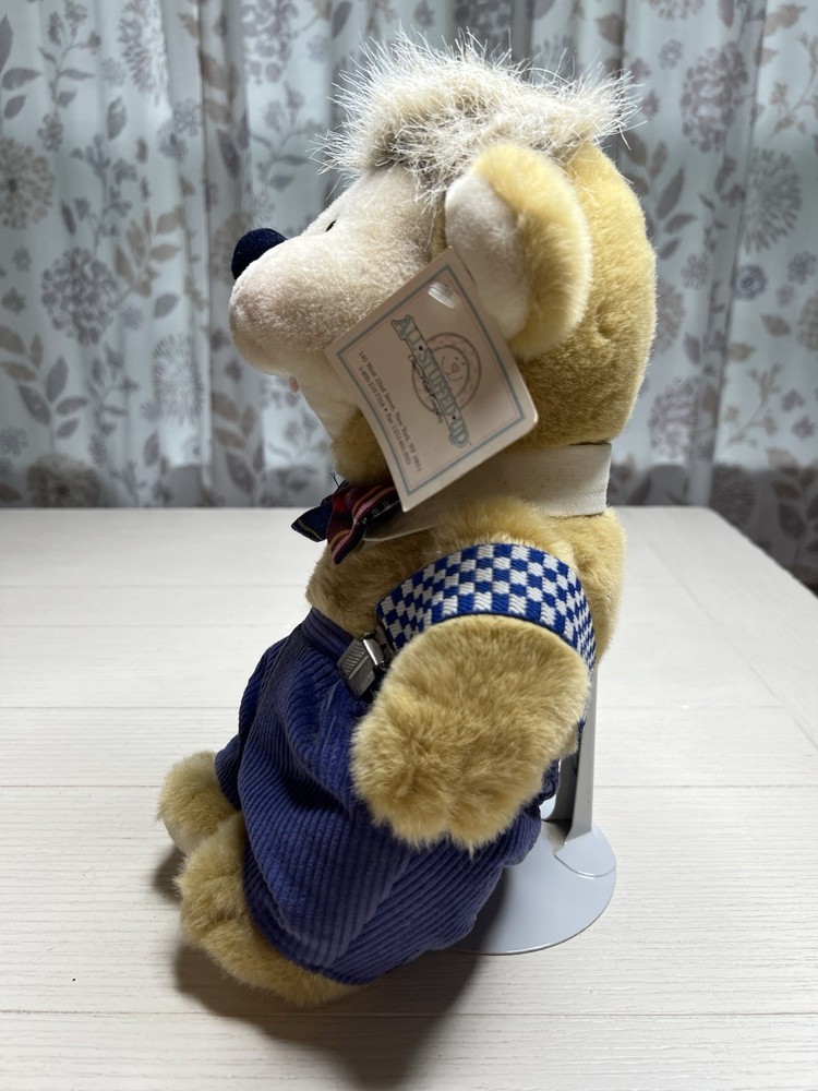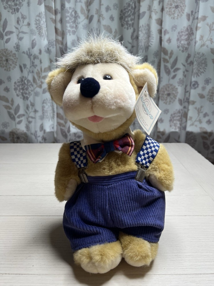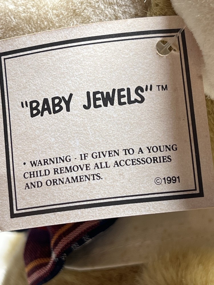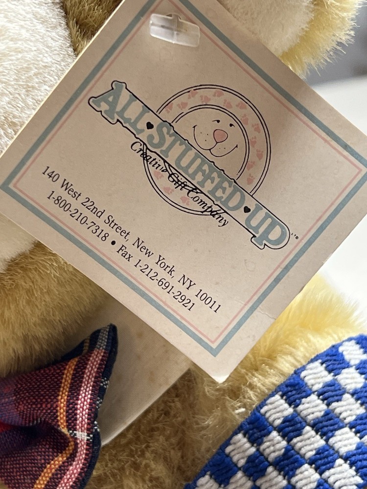 This vintage 1991 All Stuffed Up Bear is a must-have for any collector of unique and charming stuffed animals. The bear, named "Baby Jewels," comes with corduroy pants and suspenders, adding to its adorable appearance. Measuring at 12 inches in size, it is perfect for cuddling or displaying as a decorative piece. The bear is in great condition and is sure to bring joy to anyone who adds it to their collection. Creative Gifts Co. brand produced this delightful item which is a perfect gift for anyone who loves vintage stuffed animals or bears. Don't miss out on the chance to own this lovely piece of history. 12” With Stand