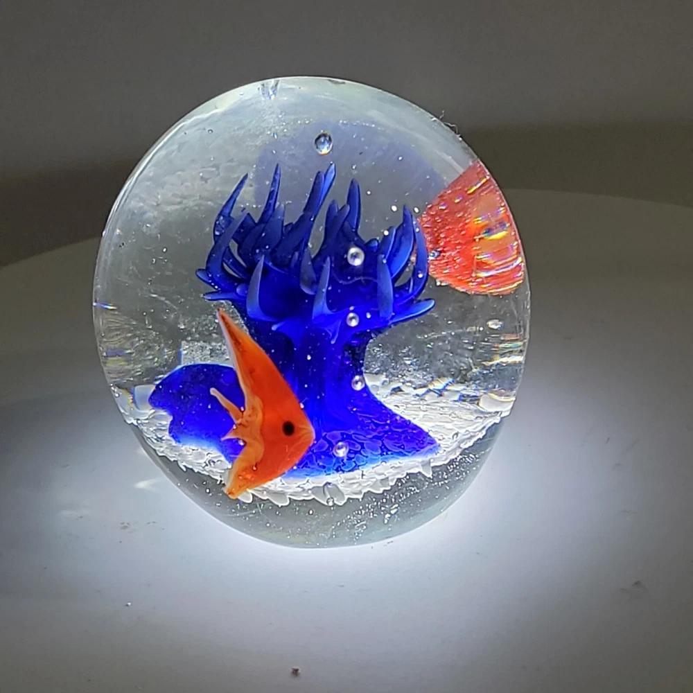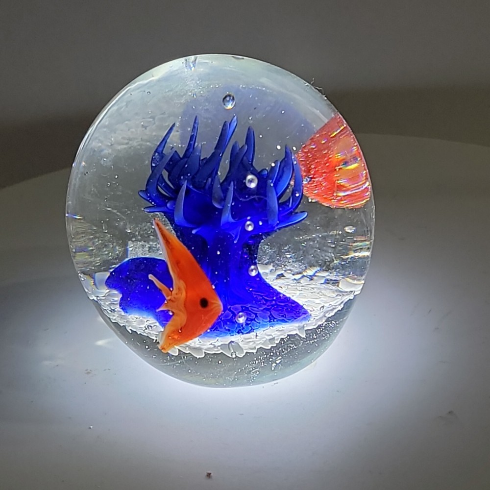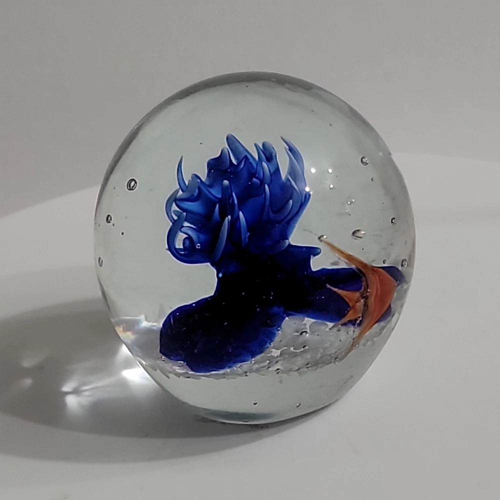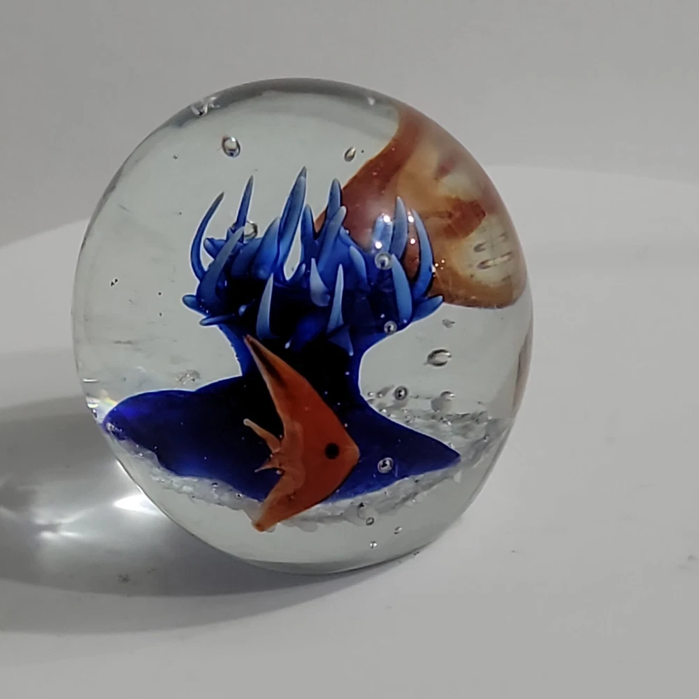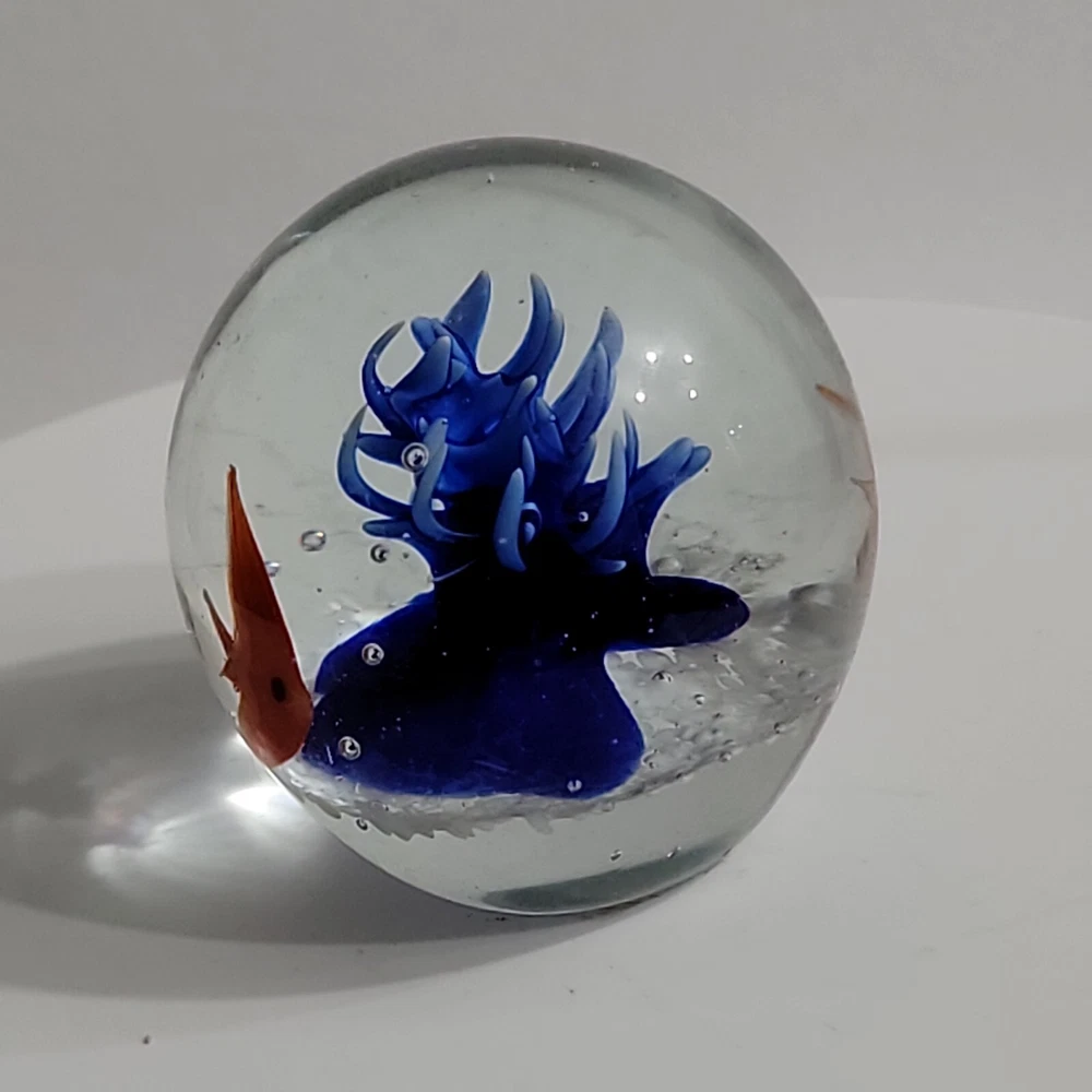 Vintage 2 Orange Angel Fish Glass Paperweight Focus swimming around Blue Coral in a sphere Please join us for many other wonderous finds like this one at Southern General Store. We are constantly adding to our inventory to include something to interest anyone and everyone.