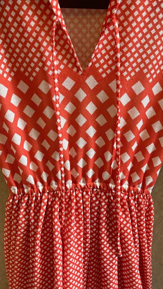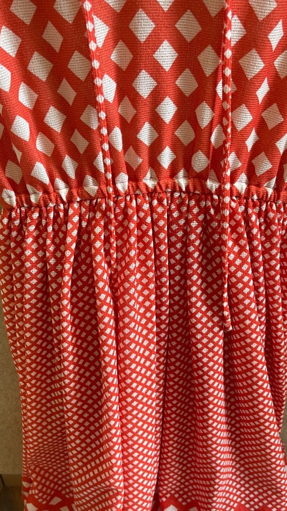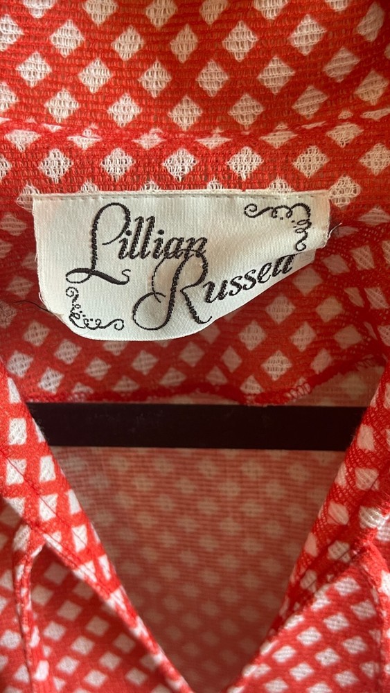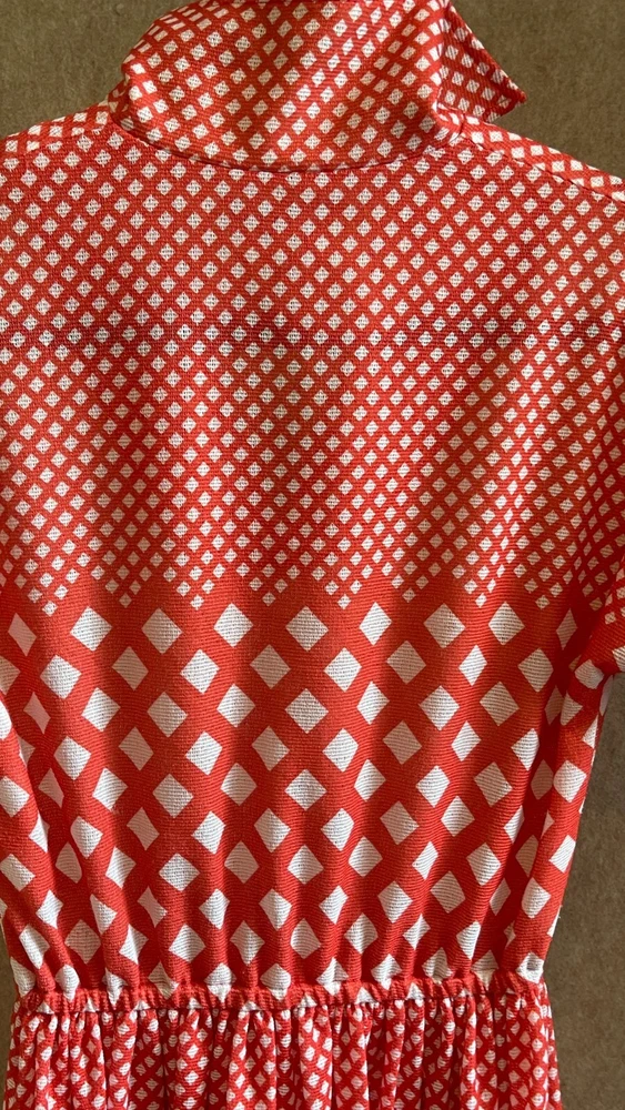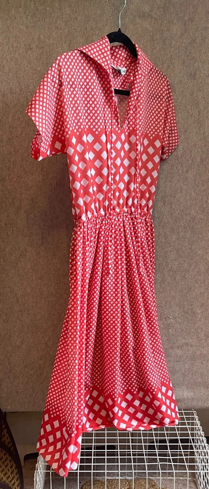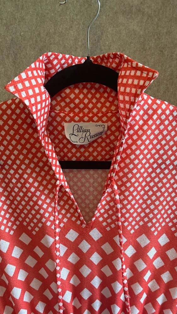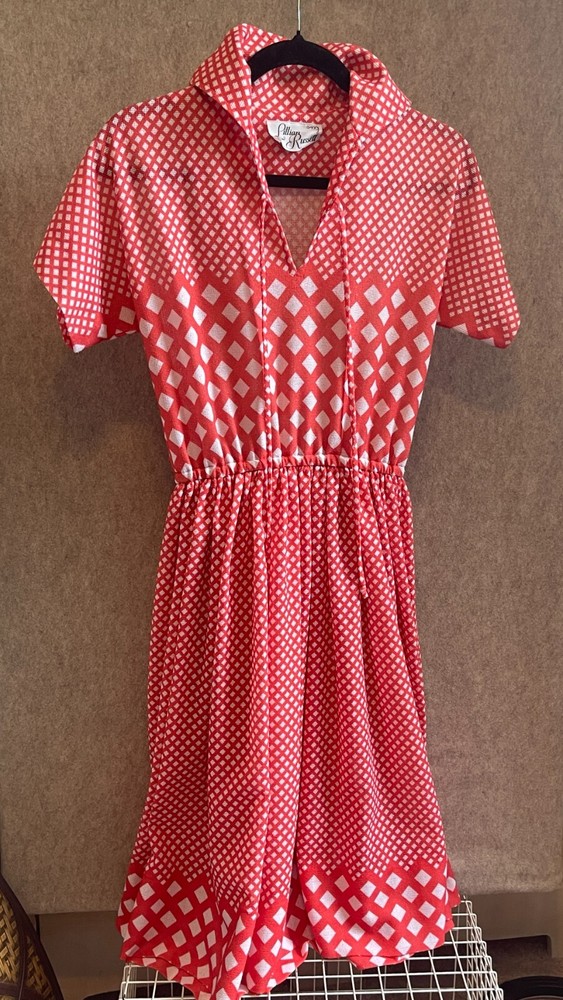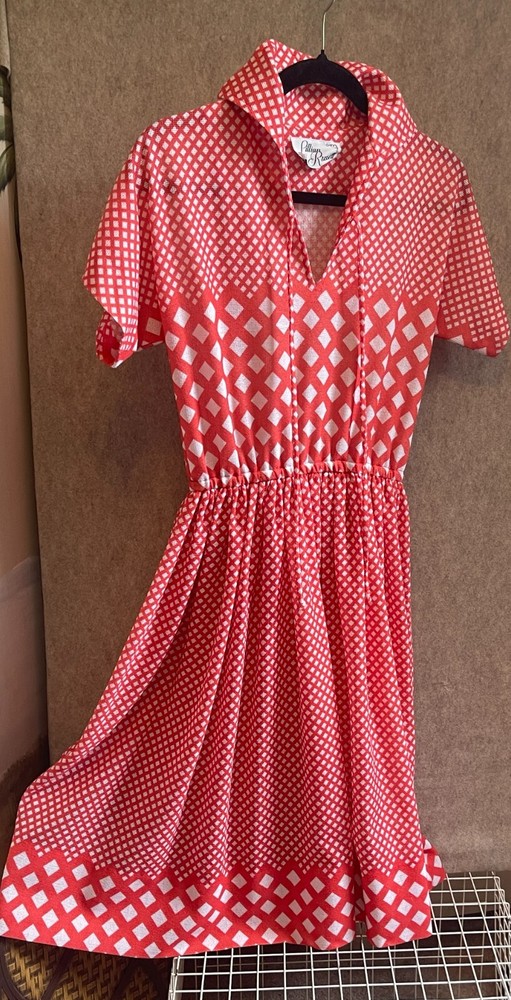 Step back in time with this vintage Lillian Russel checker board dress from the 1960s. The white and orange geometric pattern is eye-catching and perfect for any occasion. Made of polyester, this mid-length dress is comfortable and easy to wear. It's a women's size medium and has a regular fit. The dress is perfect for anyone who loves vintage clothing or wants to add a touch of retro style to their wardrobe. Whether you're going to a party or just want to make a statement, this dress is sure to turn heads. Don't miss out on the opportunity to own a piece of fashion history. The dress features a butterfly collar and a sinched waist line that does stretch about 2 extra inches if needed. It is a super fun and flirty dress. Oh yeah, Its a wonderful twirl dress as well. It hits right below knee length. ( I am 5.9") What a great dress to add to your collection. Hope you like it. Questions please message me. This is a vintage dress. It is in great condition. No stains No snags