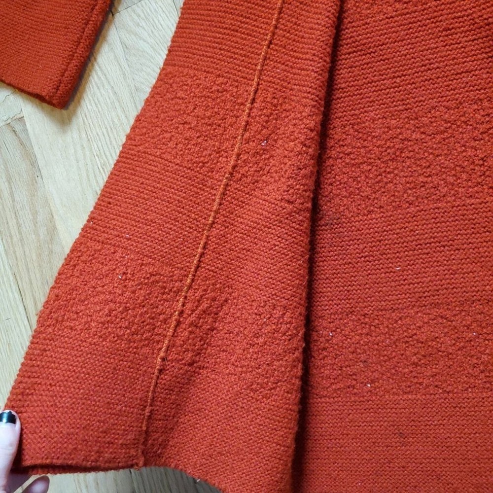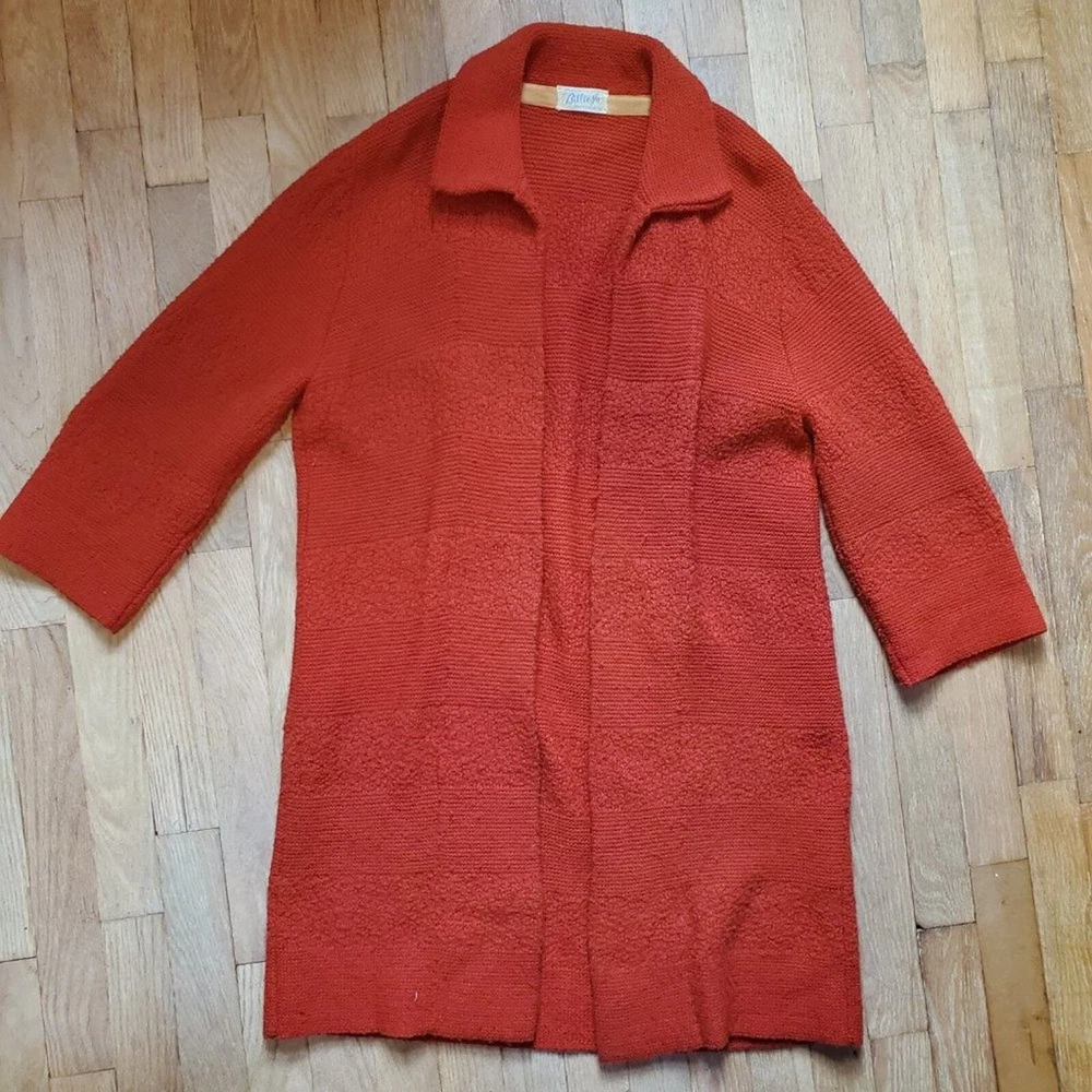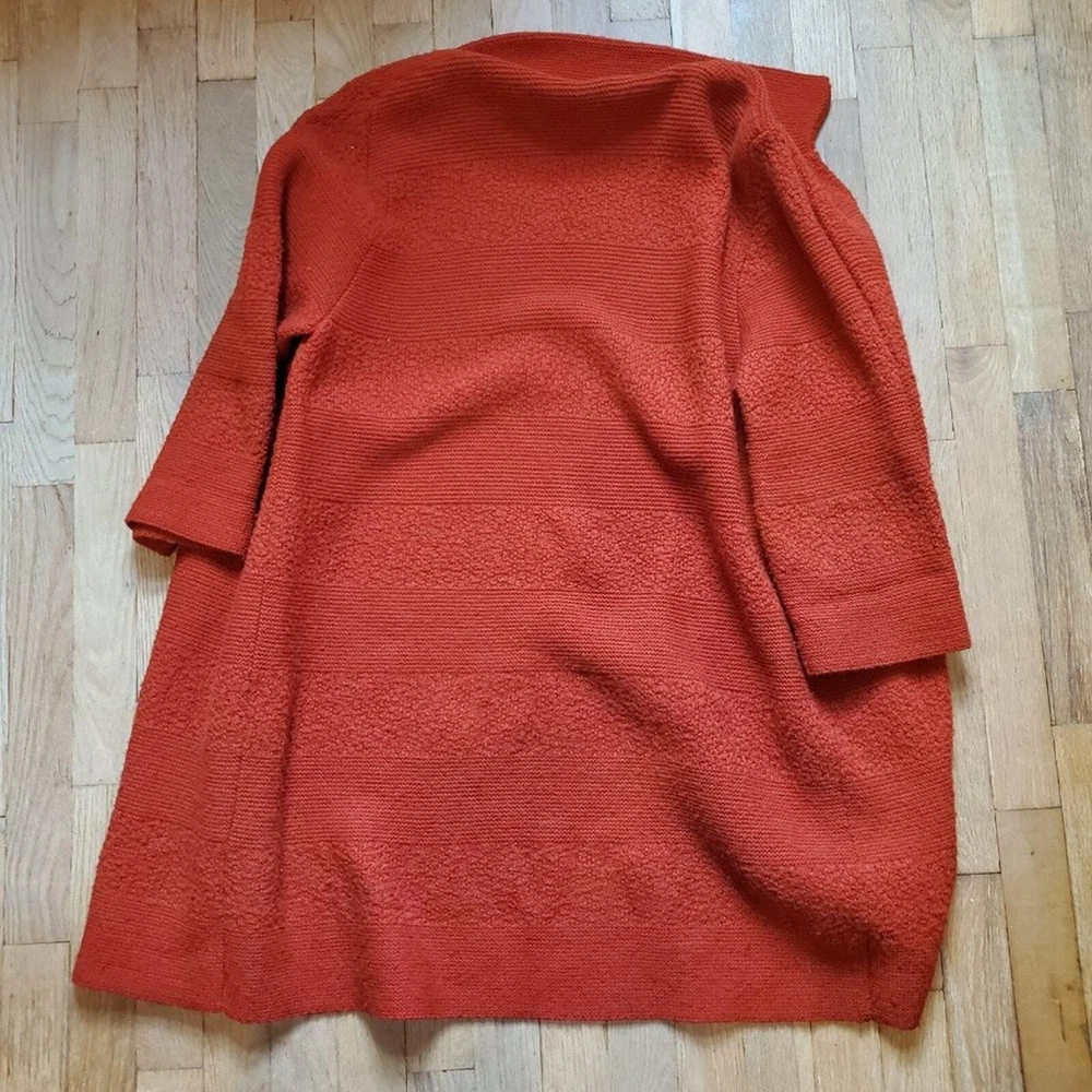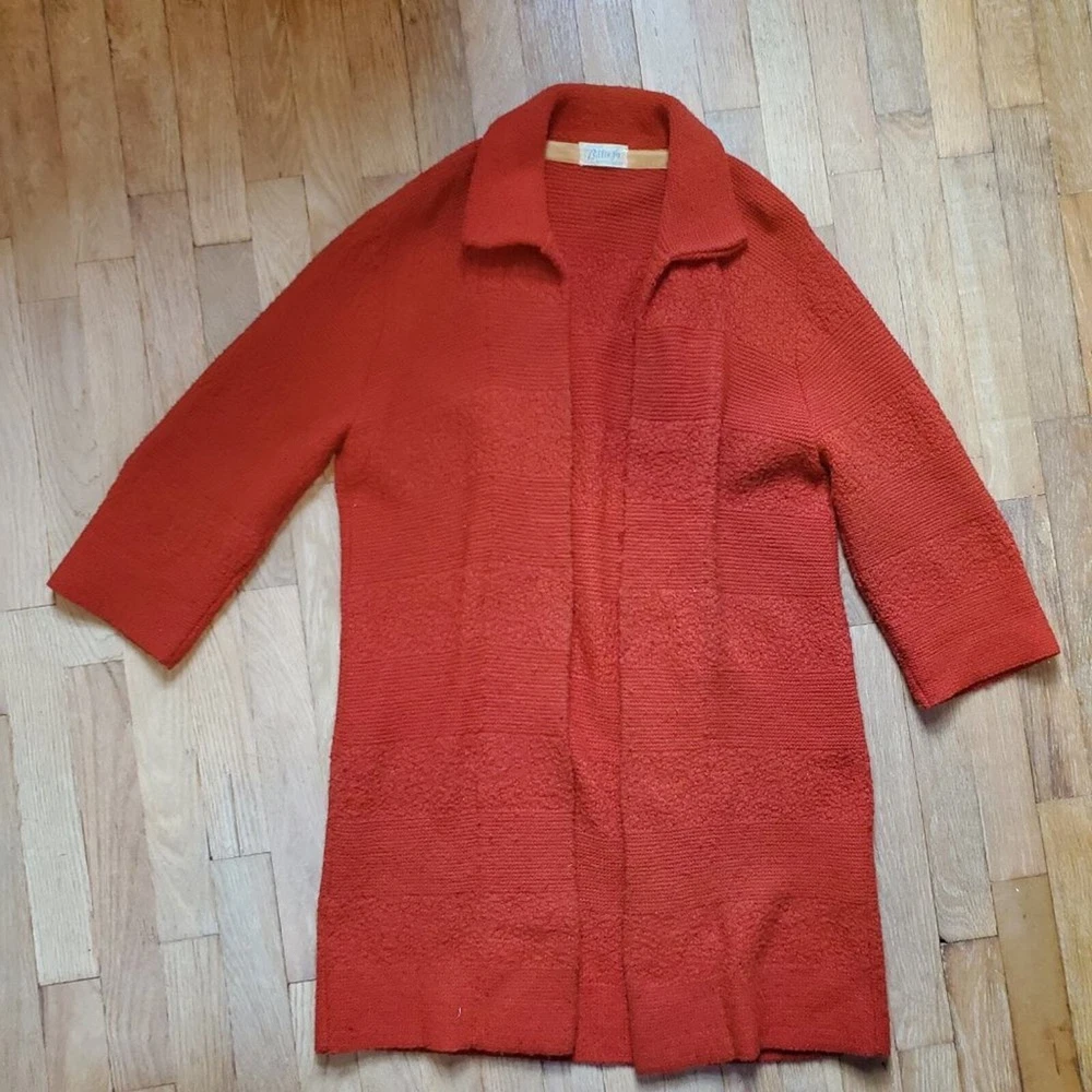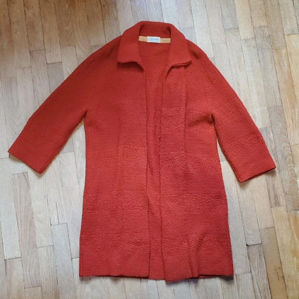 <![CDATA[<div>Vintage 60s Retro Burnt Orange Mid Century Long Line Open Front Cardigan Sweater 3/4th length long sleeves Open front with a collar No size, but it is open front. I marked it as a size medium - please check measurements before purchase 20.5" pit to pit 35" length Longer length cardigan perfect for layering with leggings for fall Perfect fall autumnal colored cardigan! Retro, mod, 60s, 70s, boho chic, bohemian vibes No holes or stains Offers and bundles are welcome!!