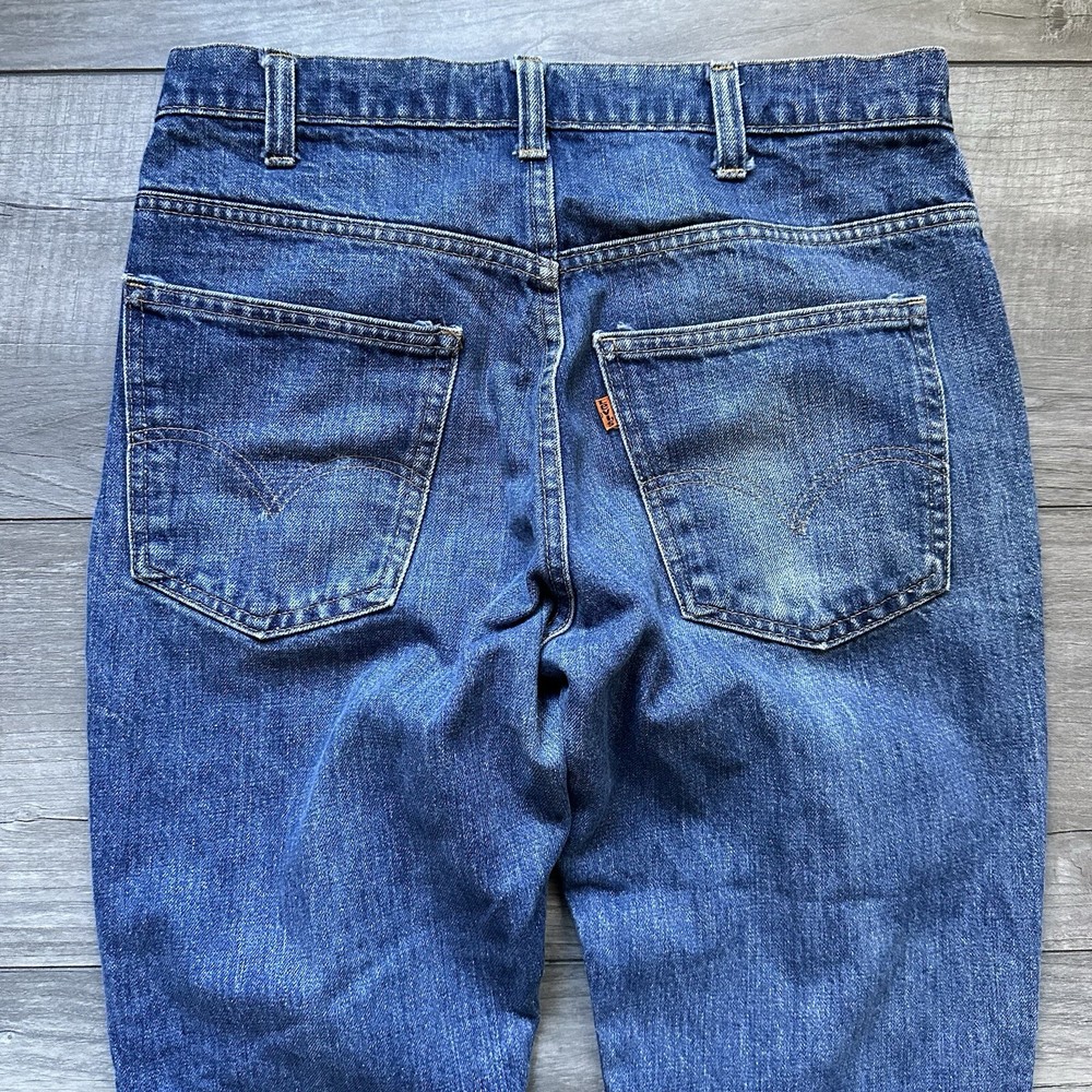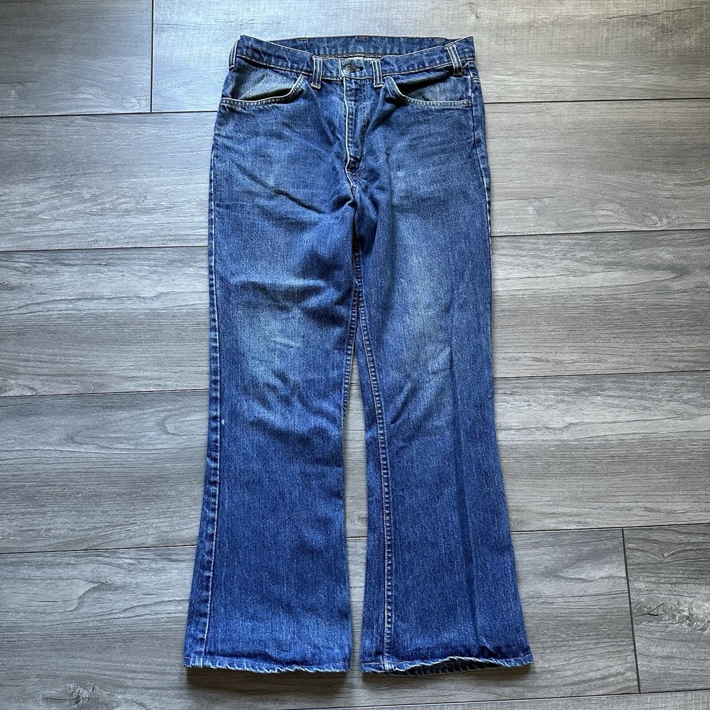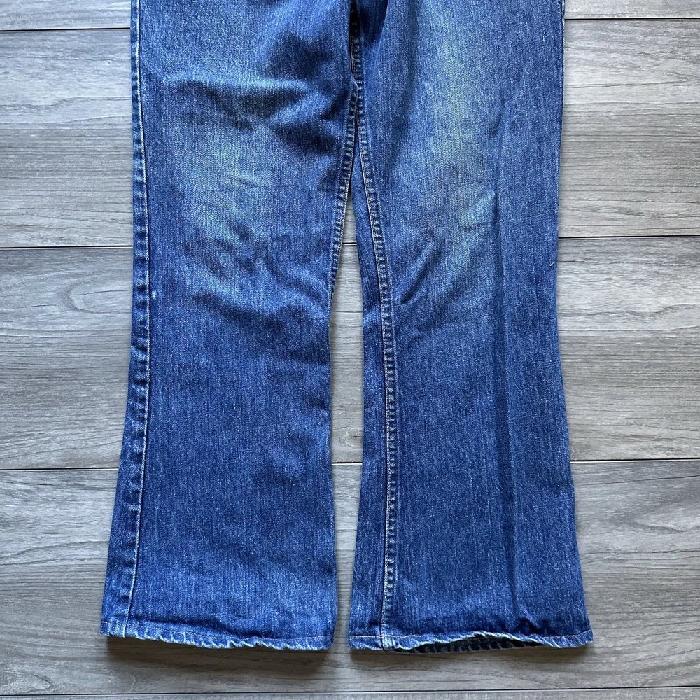 Upgrade your denim collection with these vintage Levi's 646 Orange Tab bellbottom flare jeans. The faded denim and dark wash make them a perfect fit for any casual occasion. These jeans feature a zip and button closure, with a Talon 42 Zipper accent that adds a touch of uniqueness to the design. The mid-rise and regular size type make them suitable for men looking for a comfortable and stylish pair of jeans. The inseam measures 29 inches, and the waist size is 32 inches. The Levi's brand is known for its quality and durability, making these jeans a great addition to your wardrobe. Get a piece of American history with these 70s-inspired jeans, perfect for any hippie or USA-themed party.