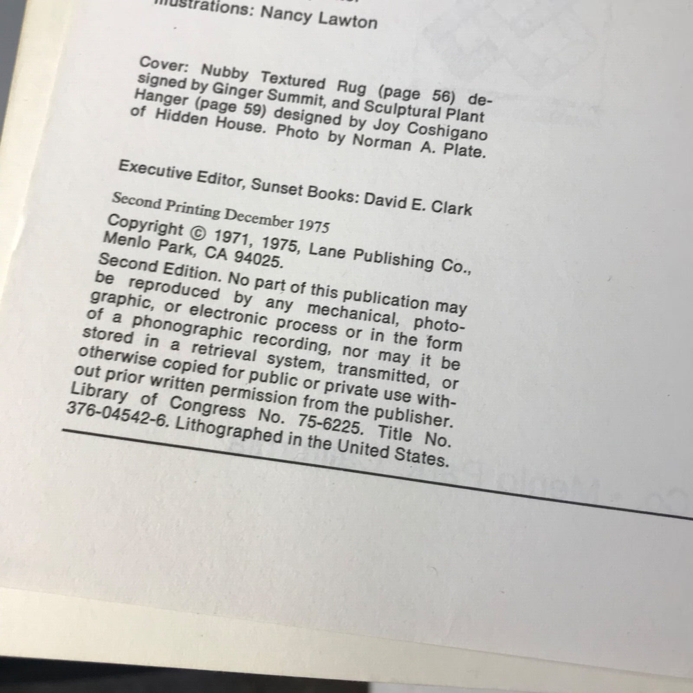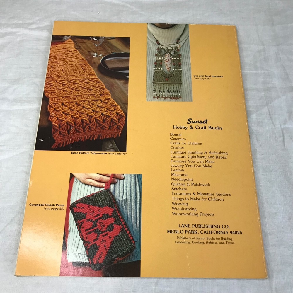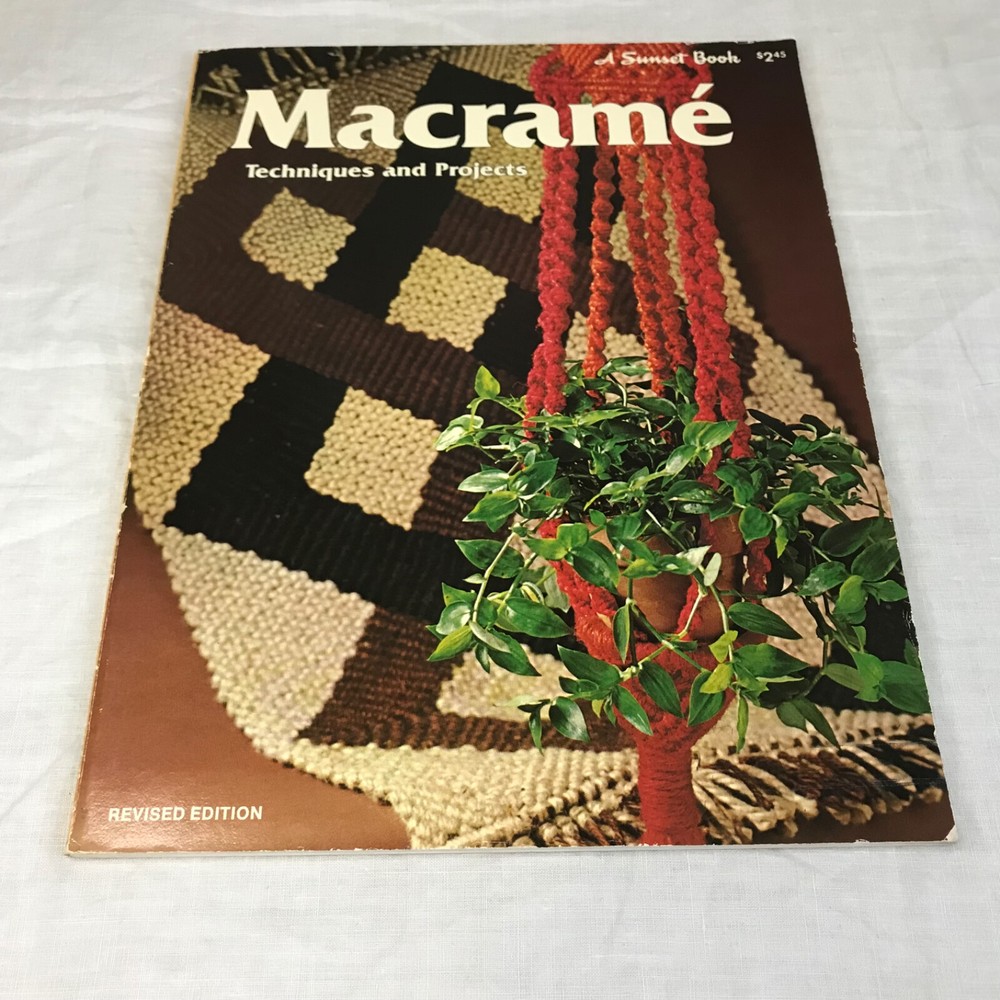 Explore the world of macrame with this vintage book published in 1975. Written by Alyson Smith Gonsalves, the book titled 'Macrame Techniques Projects Sunset Books 1975 Creative Craft Knots' features 80 pages of instructions and inspiration to create unique knots, patterns and designs. The book is a trade paperback format and belongs to the genre of crafts and hobbies.The book is in English language and was published by Lane Publishing Co. under the publication name of Sunset Books. If you are a fan of vintage crafts and want to learn about the macrame techniques of the 70s era, this book is a must-have for you. there is a personal library sticker on the inside front cover