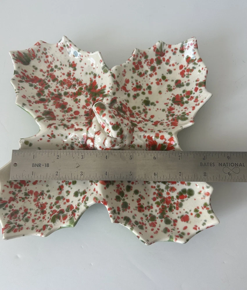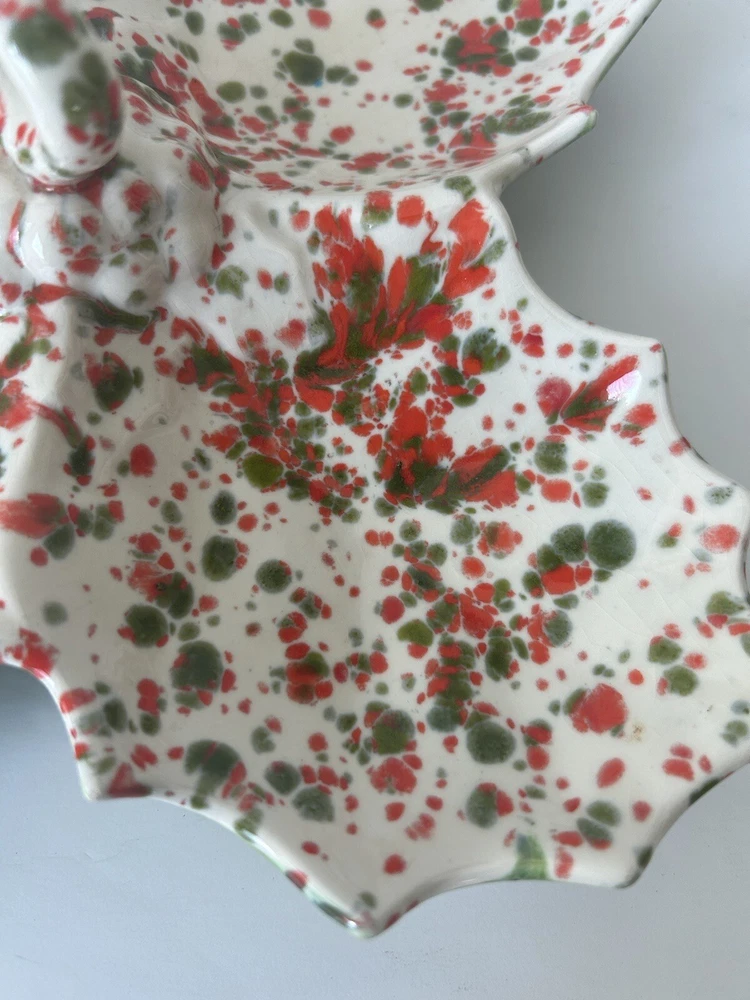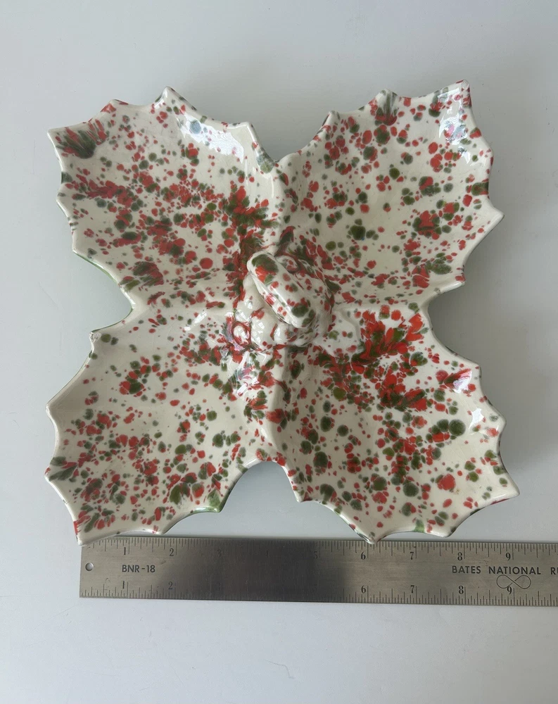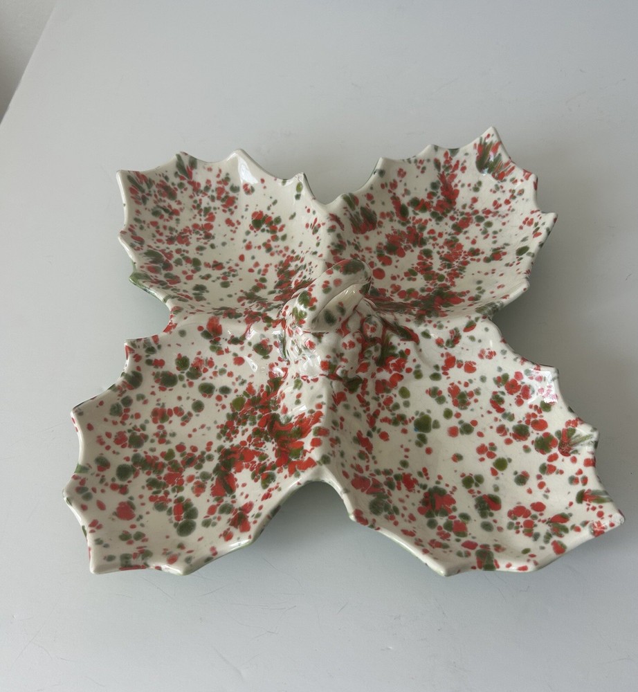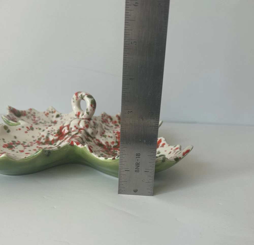 Gently used appetizer dish with 4 sections. Speckled orange and green. A couple minor chips on the points of the leaves, otherwise no cracks. See photos for detail and measurements.