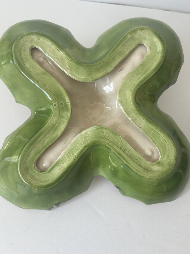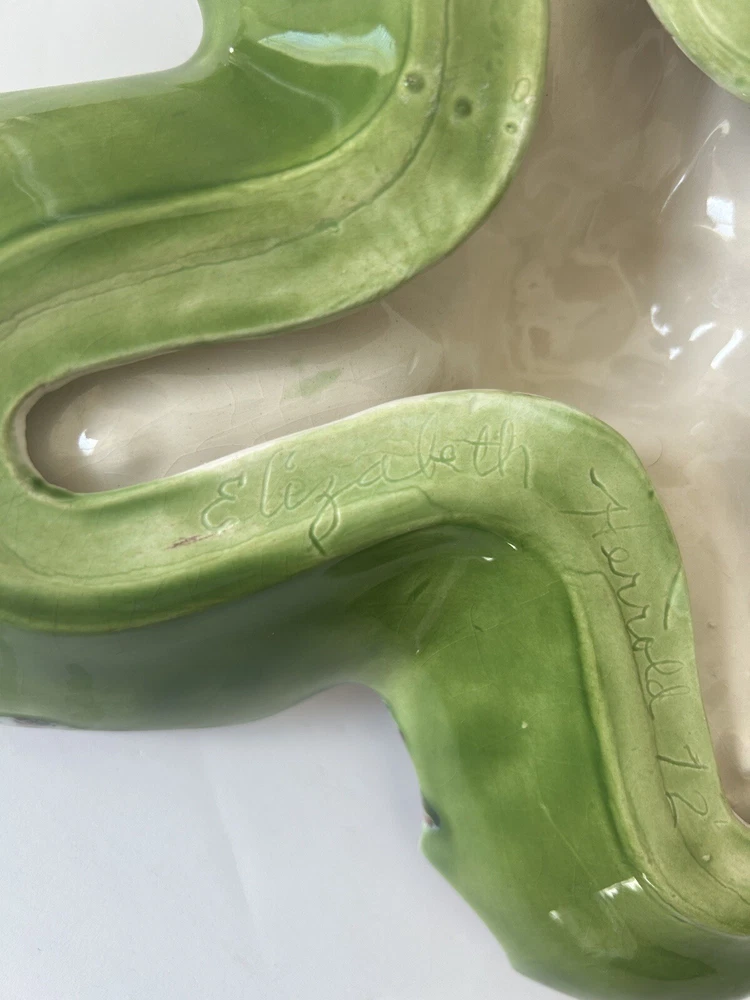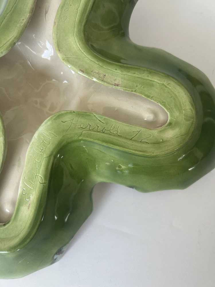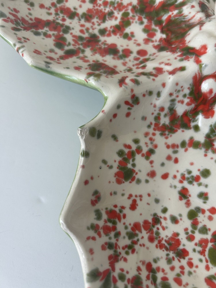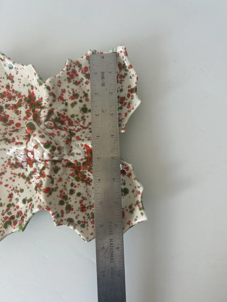 Gently used appetizer dish with 4 sections. Speckled orange and green. A couple minor chips on the points of the leaves, otherwise no cracks. See photos for detail and measurements.
