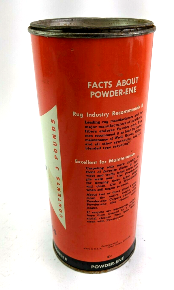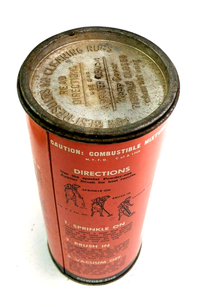 Vintage Advertising Can Powder-ENE 3 lbs Mid Century Rug Cleaner 1957 Buy it NOW or Make an Offer!! All offers considered, with quick response… CONDITION: GOOD Please inspect photos carefully. Know what you are buying. Sold As Pictured and Described. See fotos. Item may show natural weathering, scratches, minor dents, spotting, flaking or fading, fraying edges, along with other signs of aging and wear. TEXAS RELICS offers excellent, 100% trusted service! Take a trip through our store. New unusual items listed every week. We are happy to answer any questions you may have. Check our feedback, and should you like this item, make sure to add it to your watch list and click save this seller. Thanks for shopping with us! Returns are accepted for 30 days. NO Refunds for any pictured or declared defects. Payment is requested at time of purchase. eBay manages and accepts most forms of payment. Applicable State Sales tax is automatically added by eBay. Please Contact us through eBay email if you have any questions regarding the item you purchased. We will work hard to resolve any issue. Texas Relics is careful to follow all eBay selling rules and recommended policies. Thank you.