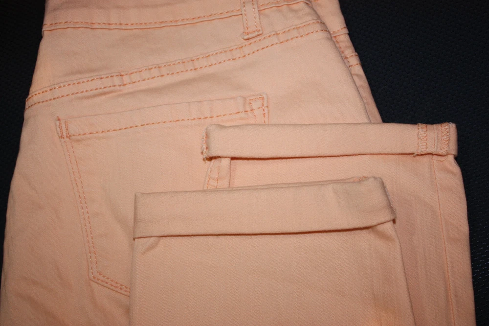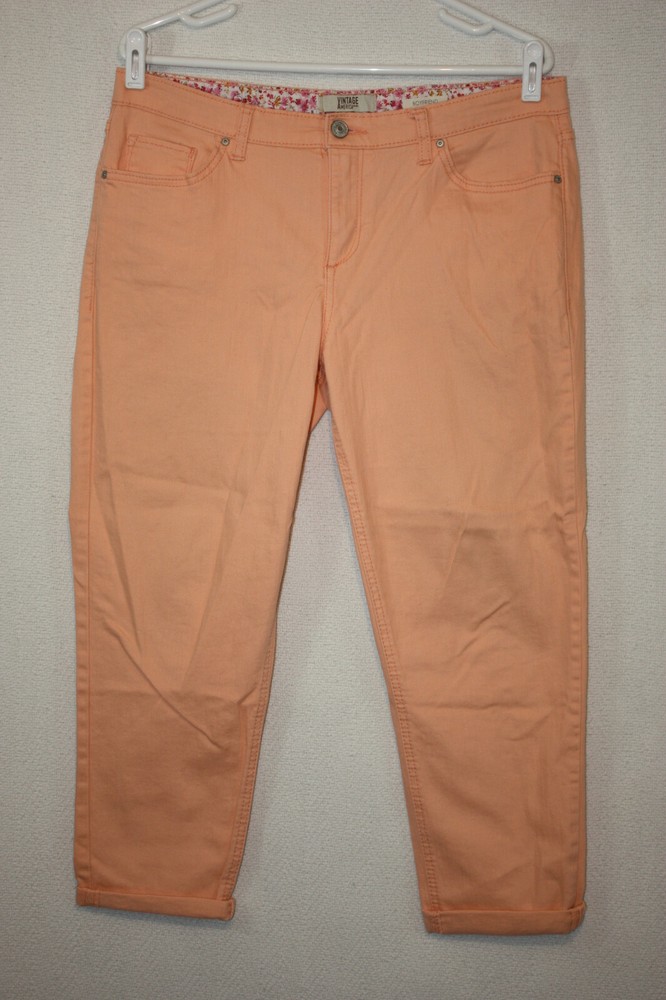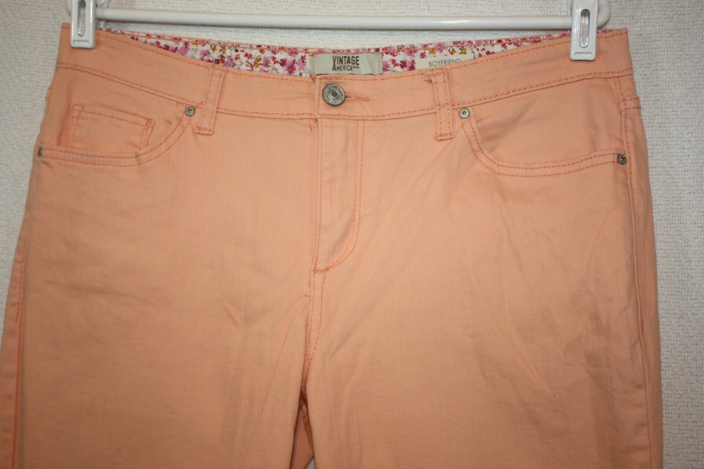 Welcome to Pim's clothing sales Excellent condition. Pale orange color. No distress. Brand: Vintage America Blues Material: 98% Cotton 2% Spandex Size : 8/29 Regular Tagged Waist: 34 Hips: 42 Rise: 10 Inseam: 25 unrolled cuffs Leg openings: 6.5 (Ask if you need more measurements) Please Remember all Clothing Items may fit differently depending on Brand, Fit, Use or Prior customization. We strongly urge our customers to check measurements first to guarantee proper fitting. Please be sure to check out our listings frequently for more high quality Designer Brand clothing items at a fraction of the price. We are getting new inventory all the time! You never know what amazing deals you may find :) Shipping discounts will be provided for multiple purchases -Please contact us after multiple purchases for an updated invoice.