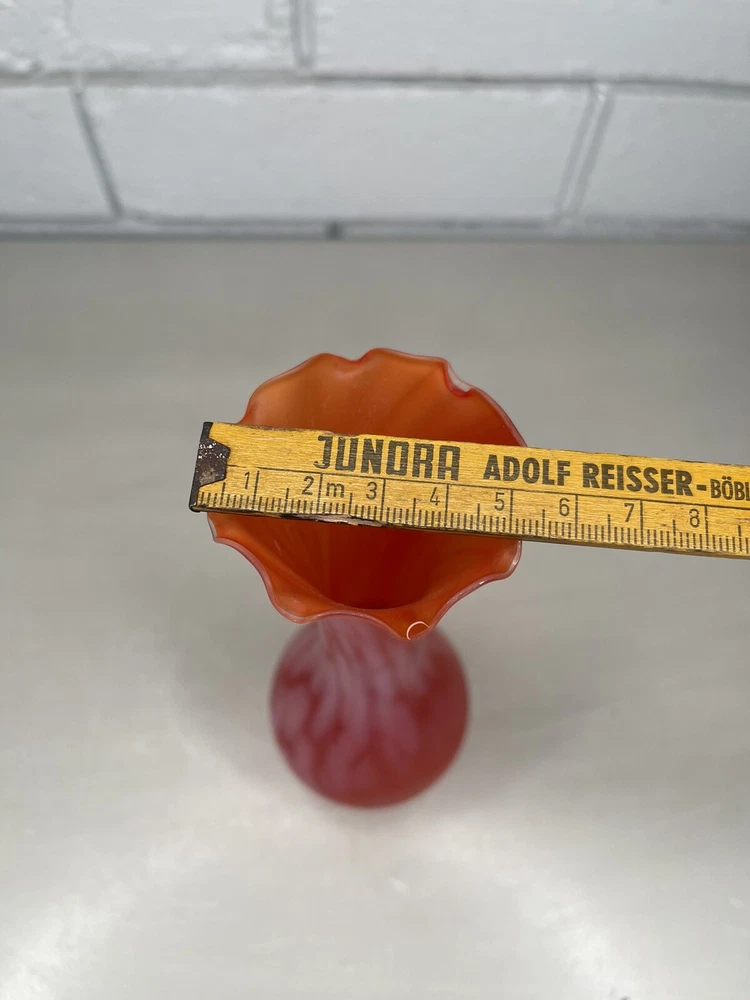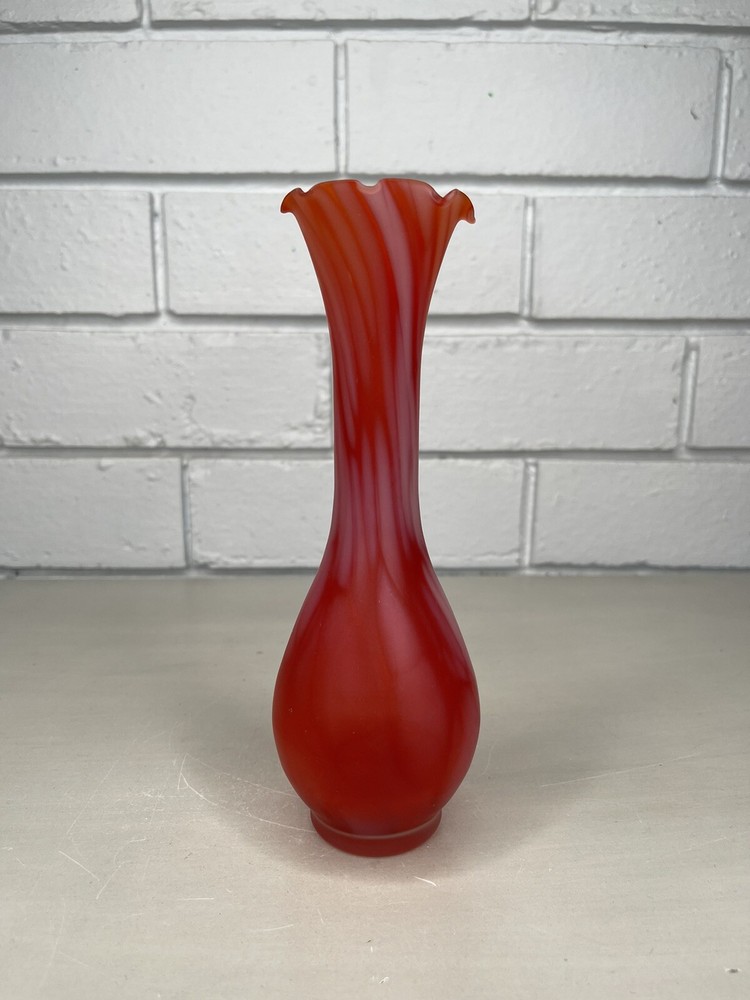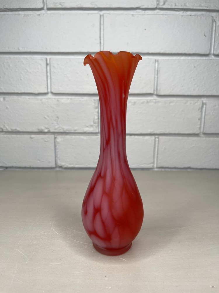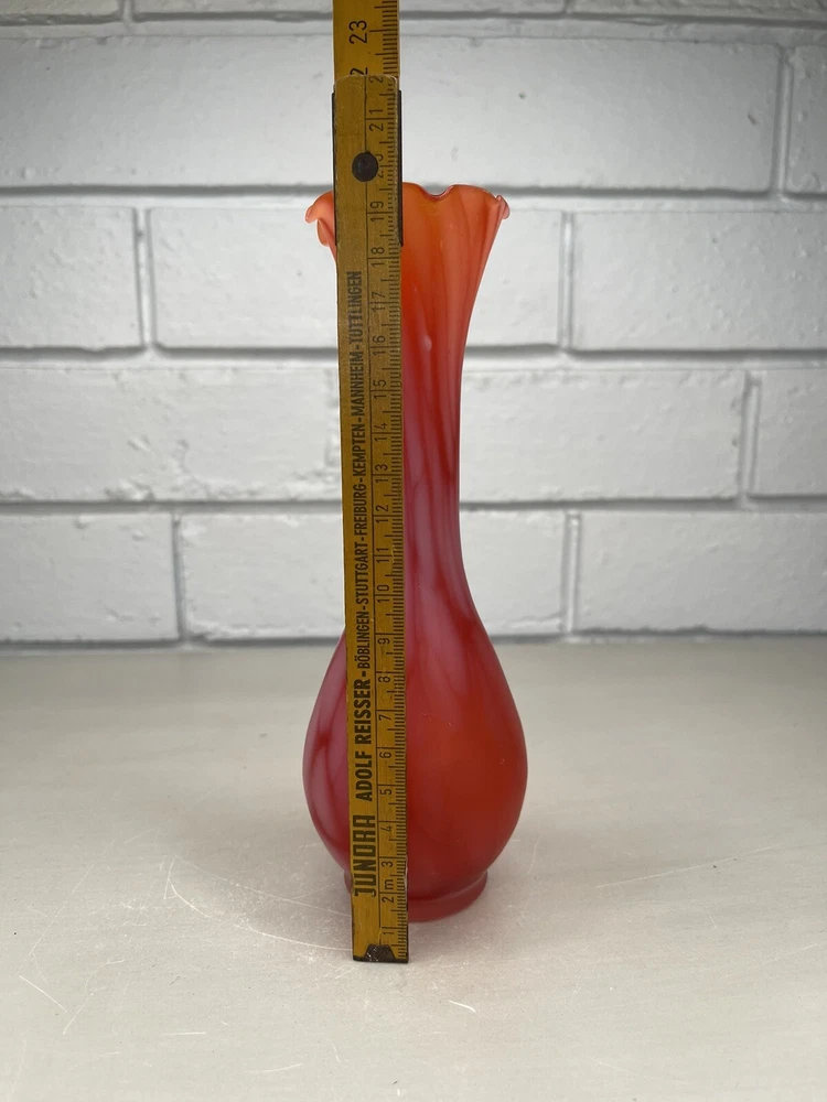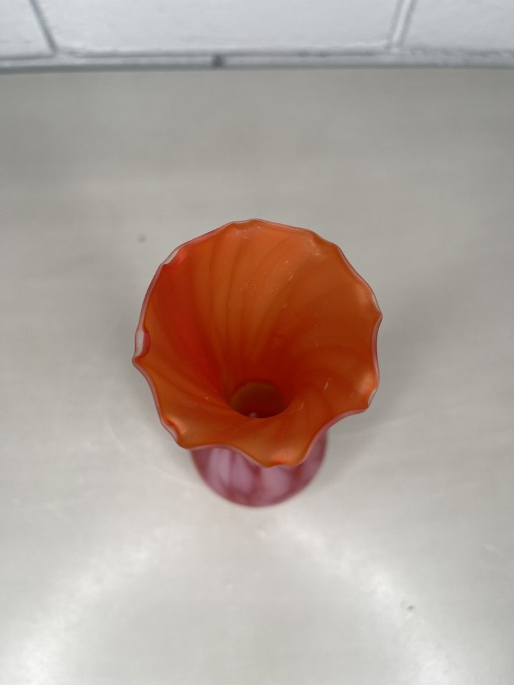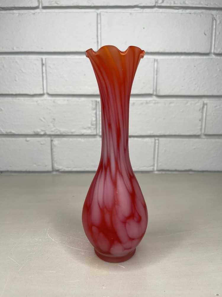 Vintage Art Glass Satin Splatter Bud Vase Red/Orange Ruffled Top MCM Mid Century Measurements are in cm. Please inspect the pictures closely as they form the best description of the item and condition. I have done my best to describe the item but feel free to ask any questions. *Postage is tracked* Every caution is taken when packing and sending this item. Thanks for looking!
