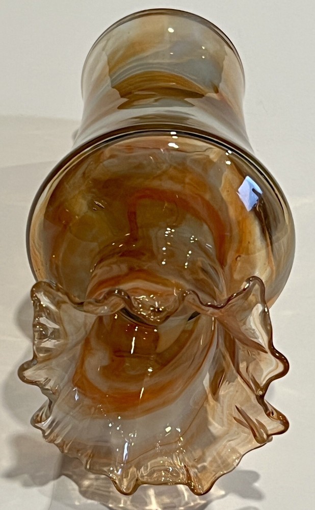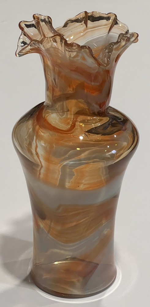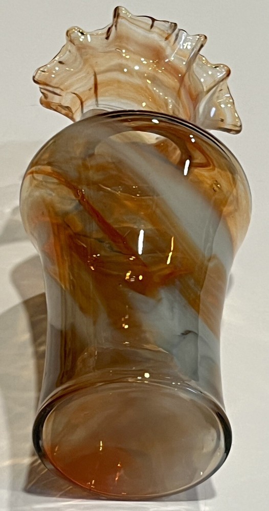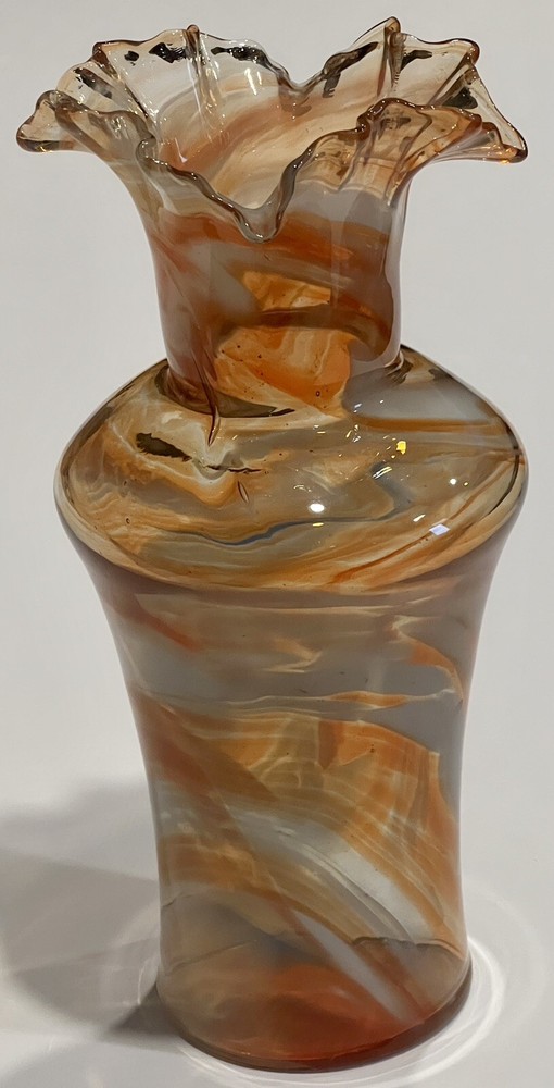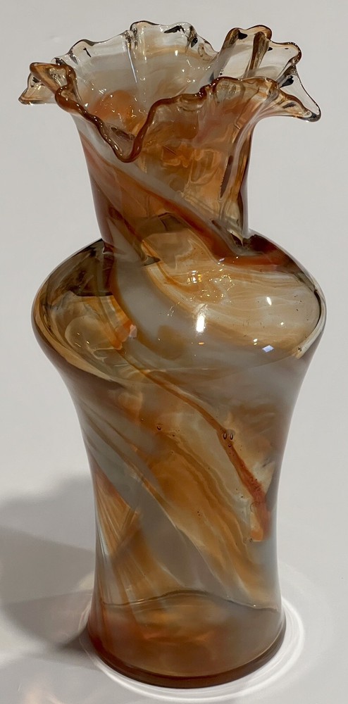 This vintage art glass vase has a unique ruffled edge and a beautiful swirl pattern. Measuring 8.5 inches in height and 4.5 inches in width, this mid-century modern style vase is both decorative and functional. It is a hand-blown, original piece that adds a touch of abstract art to any decor. The vase is made of glossy orange glass and is in excellent used condition. It is perfect for displaying fresh or dried flowers, or for use as a standalone piece. The production technique used to make this vase is hand-blown glass and it is of unknown origin. This unmarked vase is a great addition to any collection.