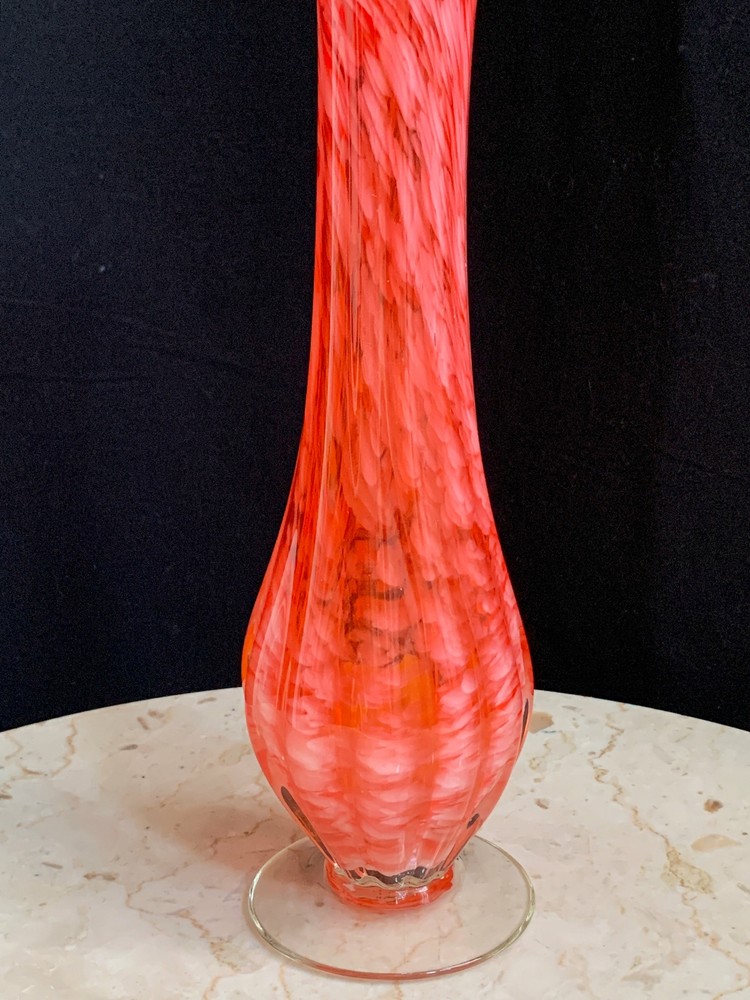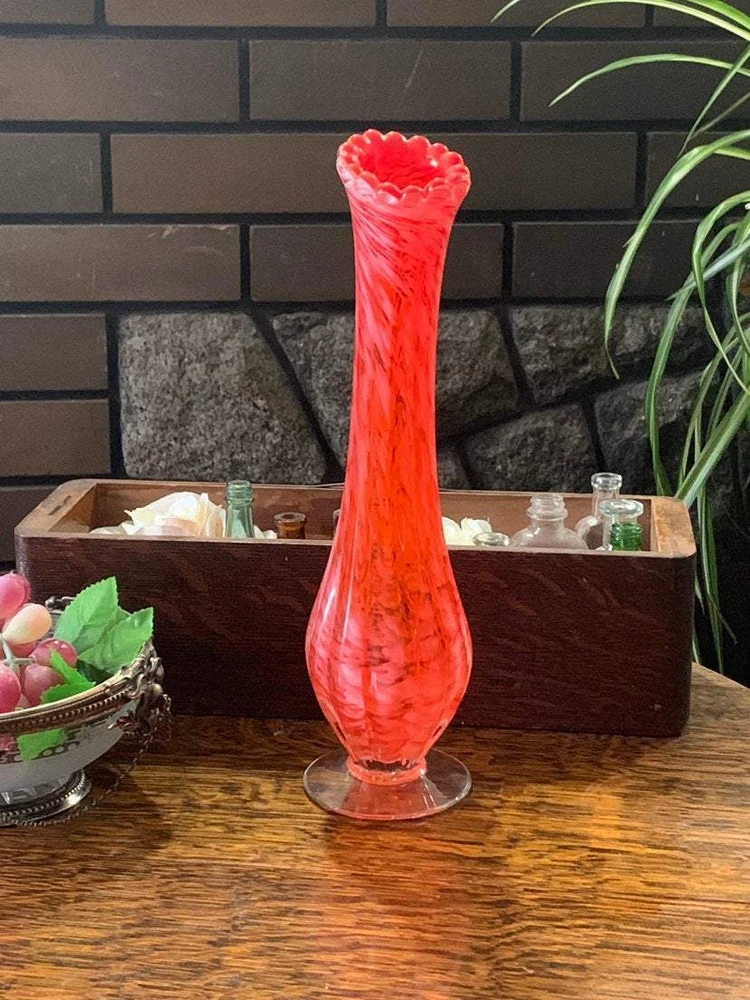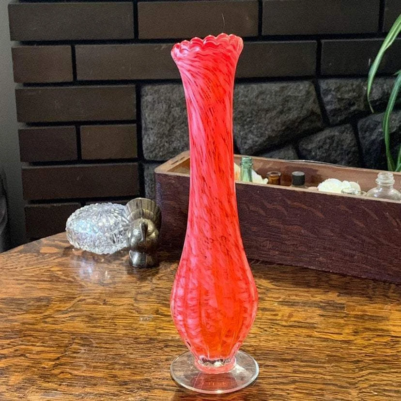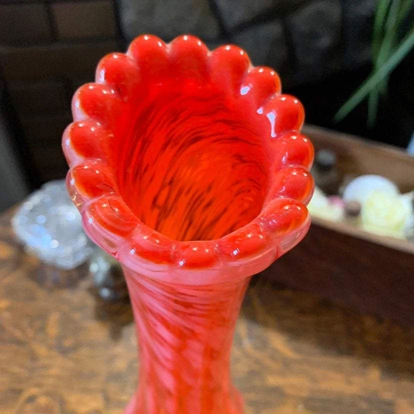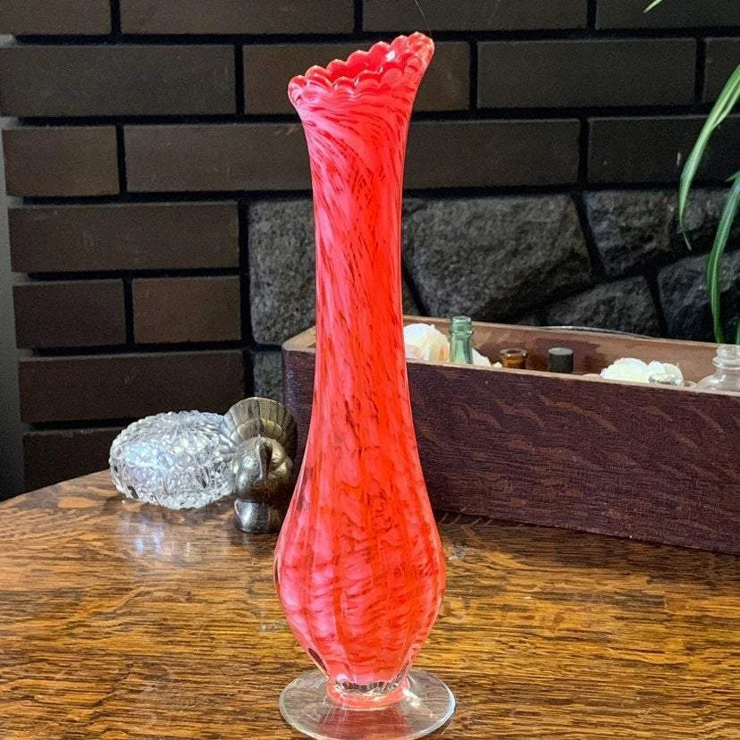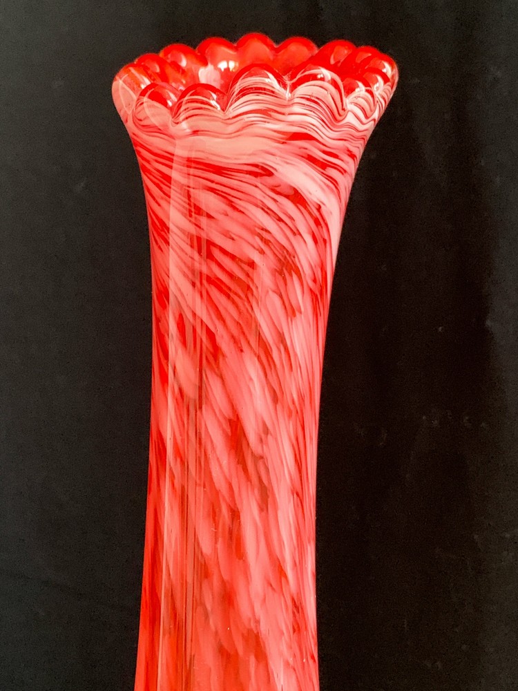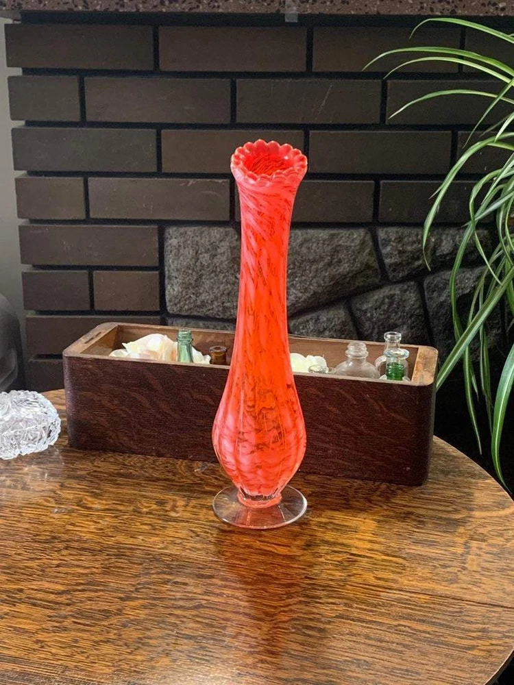 A vintage blown glass vase. The orange and white art glass vase has a rough pontil and scalloped top. In good vintage condition with no chips or cracks. 12.5” tall 3.25” in diameter at the base