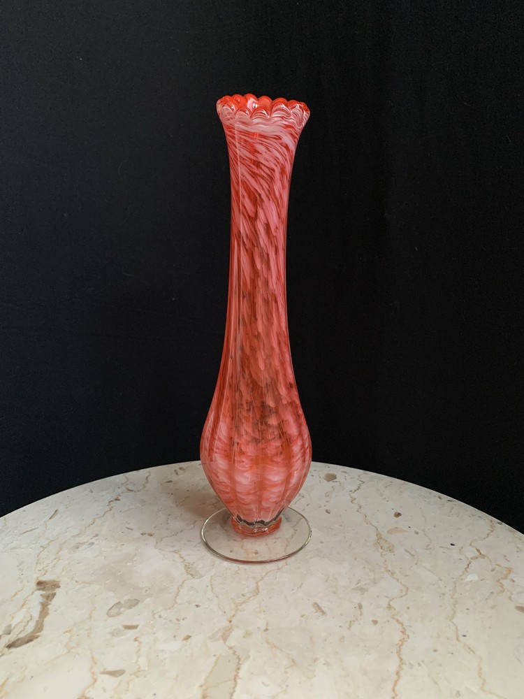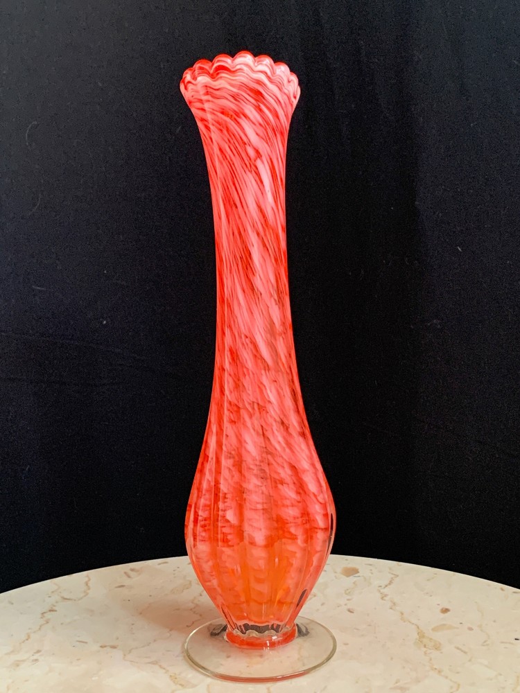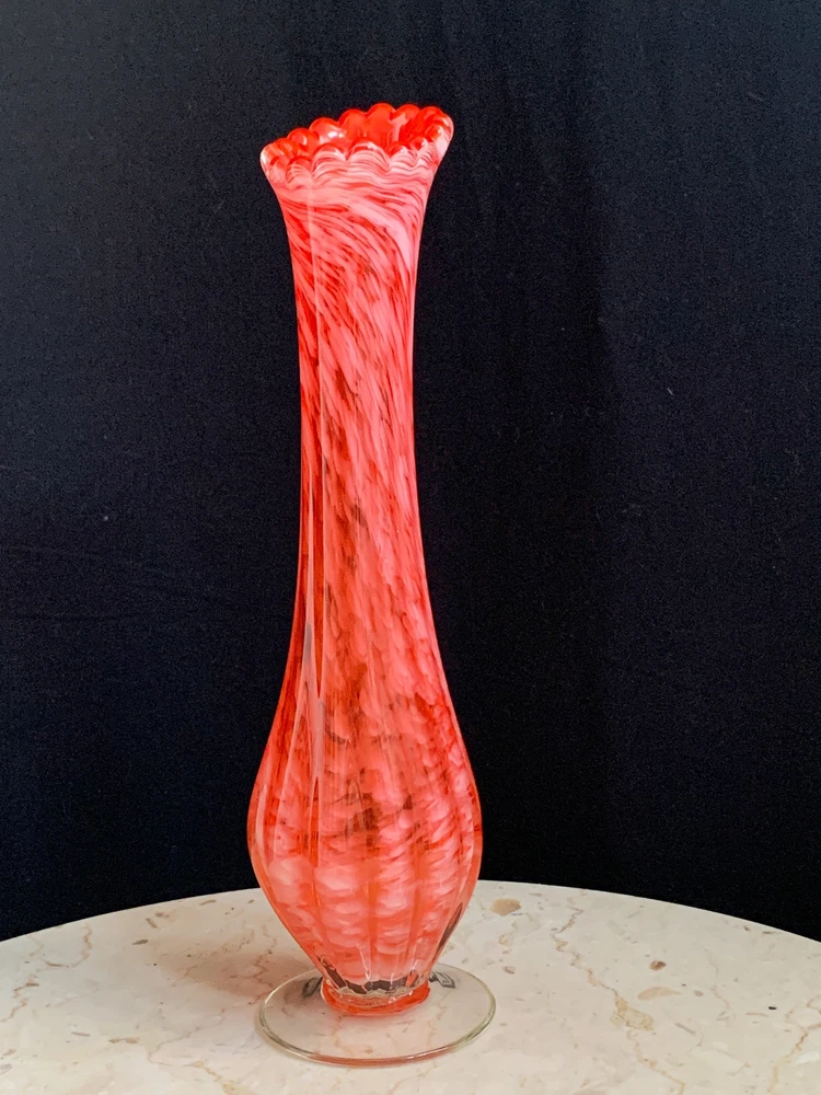 A vintage blown glass vase. The orange and white art glass vase has a rough pontil and scalloped top. In good vintage condition with no chips or cracks. 12.5” tall 3.25” in diameter at the base...