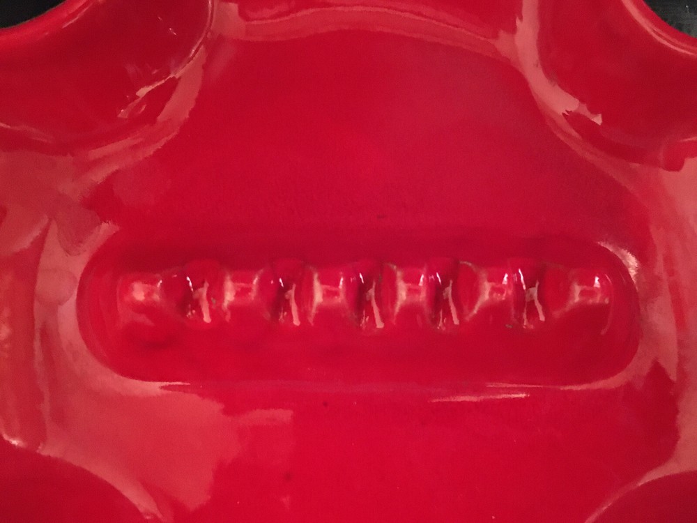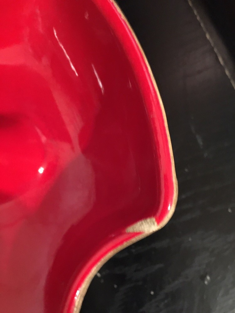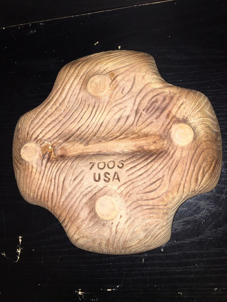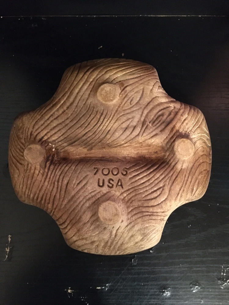 This vintage ashtray is a unique addition to your collection. The brown and vivid orange color combination of this ceramic ashtray adds a touch of warmth and vibrancy to any room. The art pottery production style and technique make it a one-of-a-kind piece. The brand is unmarked, but the quality speaks for itself. This mid-century wood look ashtray is perfect for decoration or for its intended use.in pre owned condition has some chips flaws imperfections as seen in pictures item pic is item received great for any collection 9x9