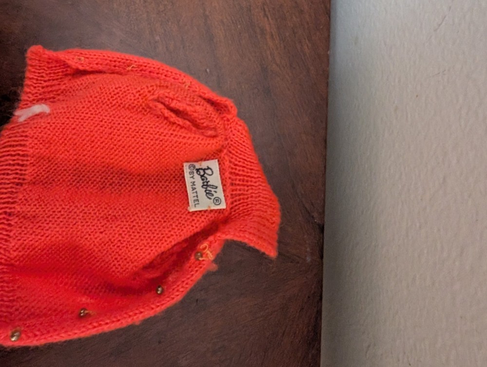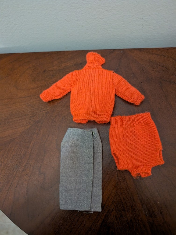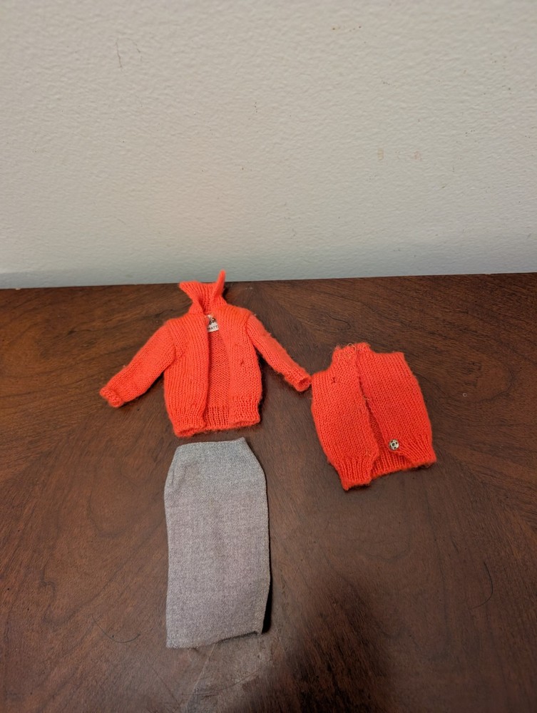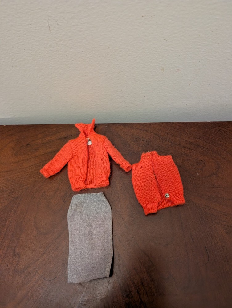 Love this vintage Barbie set! The grey skirt and orange sweaters are so charming and perfect for Ponytail or Bubble Cut dolls. A great find for collectors, though the tops need a little repair as shown. Still, it’s a fantastic addition to any Barbie wardrobe!