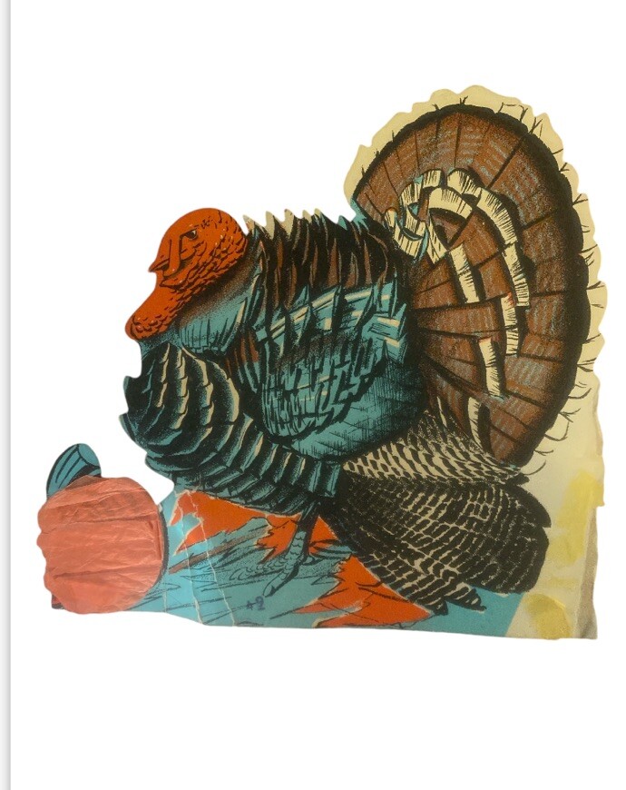 This vintage Beisle Thanksgiving centerpiece is a charming addition to any holiday decor. The cornstalk design, made of paper material, features a multicolor palette of blue and orange. Perfect for collectors of holiday memorabilia, this die-cut piece is from the 1950s and was manufactured in the United States. This item or finally came with paper honeycomb cutouts which are NOT included. Item has wear due to age and paper is bend at corner. Same day or next day delivery!