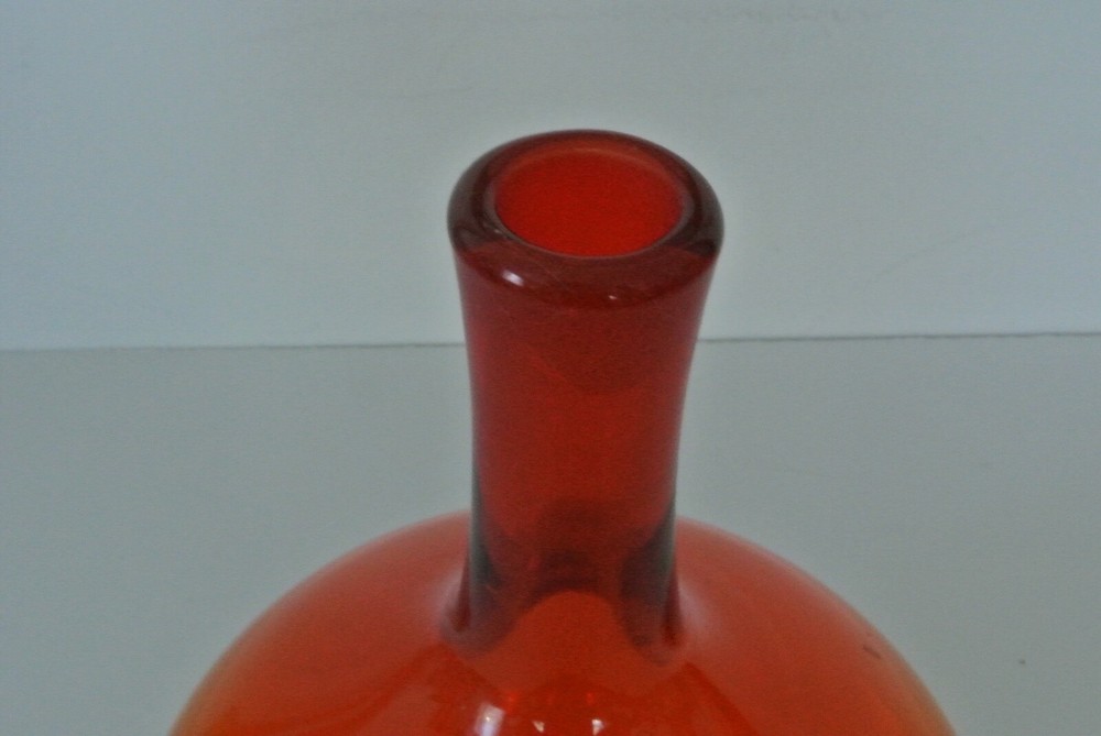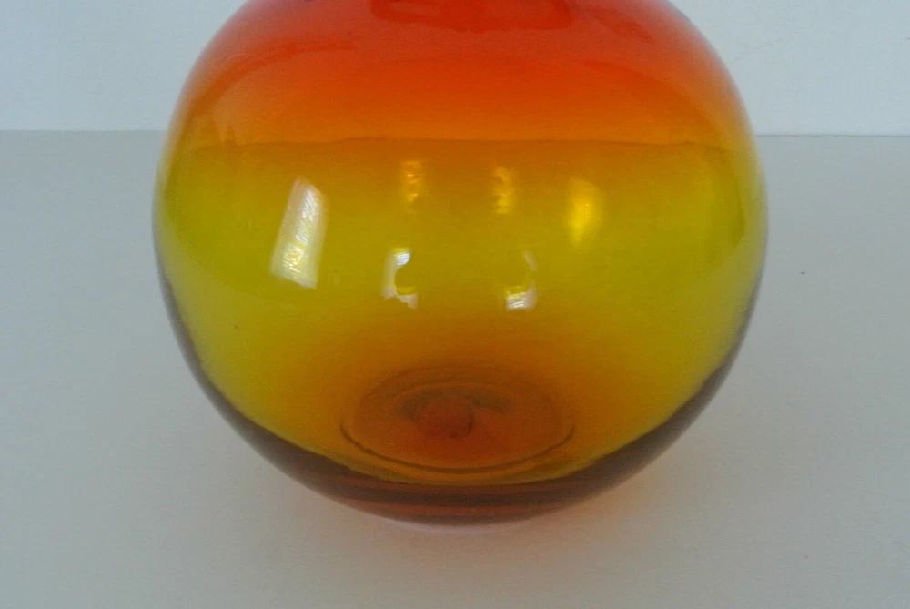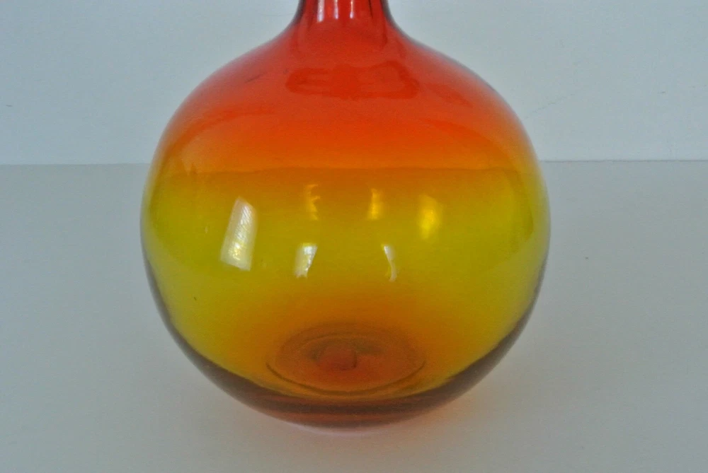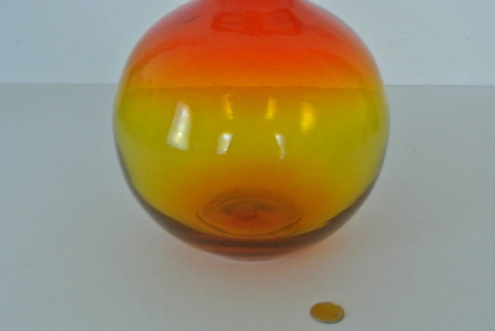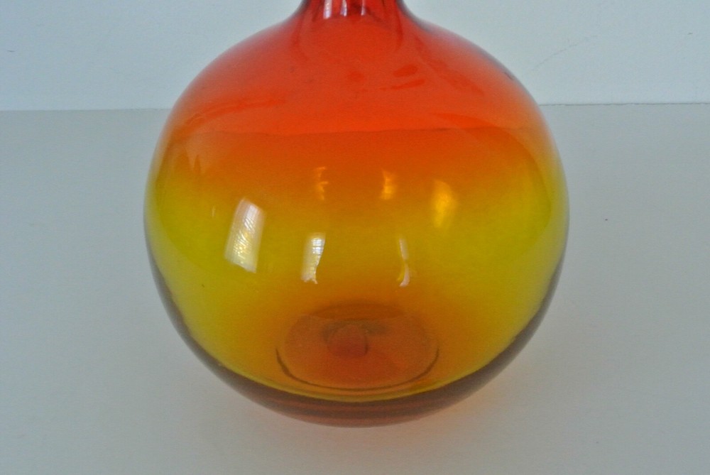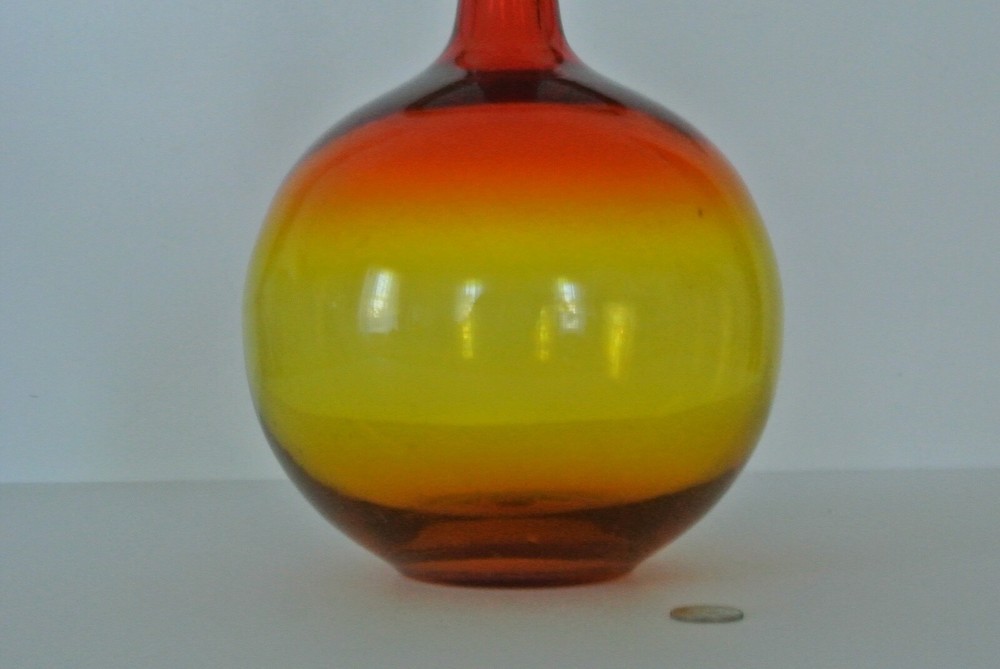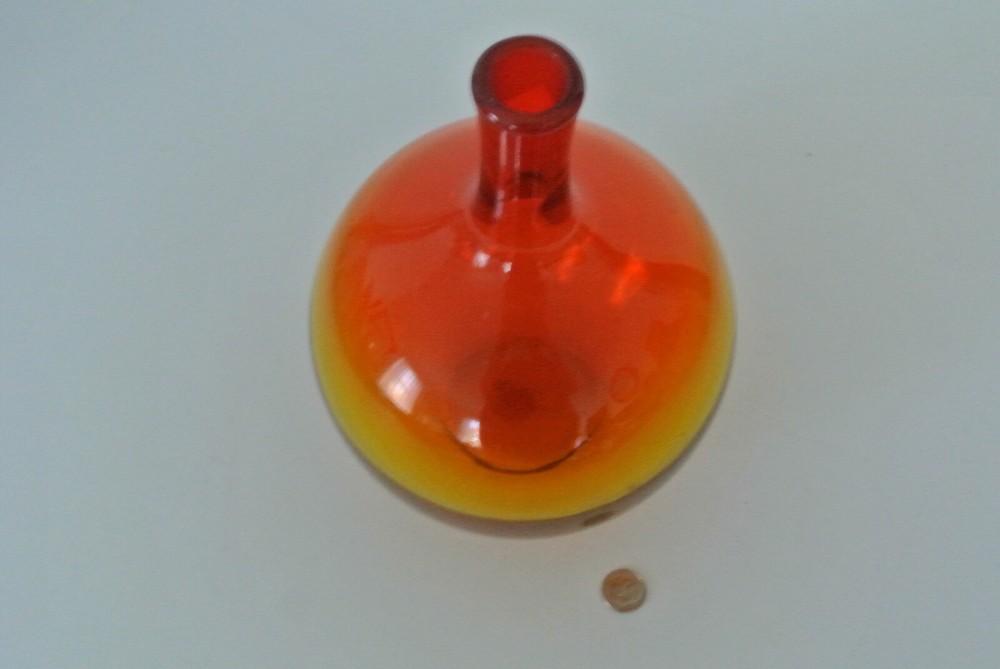 Vintage Blenko - Wayne Husted - Round w/ Slender Neck Vase - Red/Orange/Yellow - Approx. 9"H, 6 1/2". This item is a handblown vintage color fade clear glass vase. A very cool item. Looks great in the sunlight. Has a few natural bubbles in the glass, which are a product of its handblown craftsmanship. Would look great in a living room, kitchen, bathroom, sun porch, or set it on a window sill. The opening on the neck is approx. 3/4" on inside and 1" on outside. Cold hold a few thin or medium stem flowers, or one nice sunflower. A great decorating item to add a pop of color to any room. It is a heavy weight, so it won't topple over easily. Check out my other items - Shop 182 (Go to: -About this Seller, -Seller's other items) *View all pictures - No Returns. Please Do Not Contact Me about services, products, or commercial interests. Coin for size variation, not included. BN6