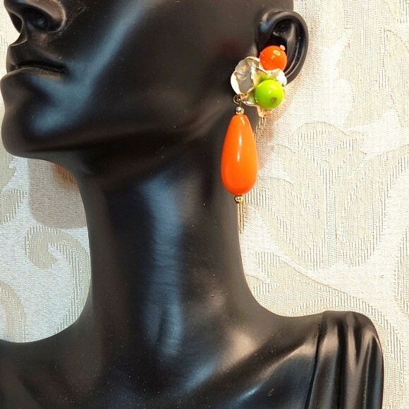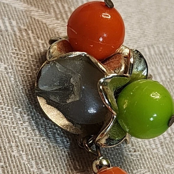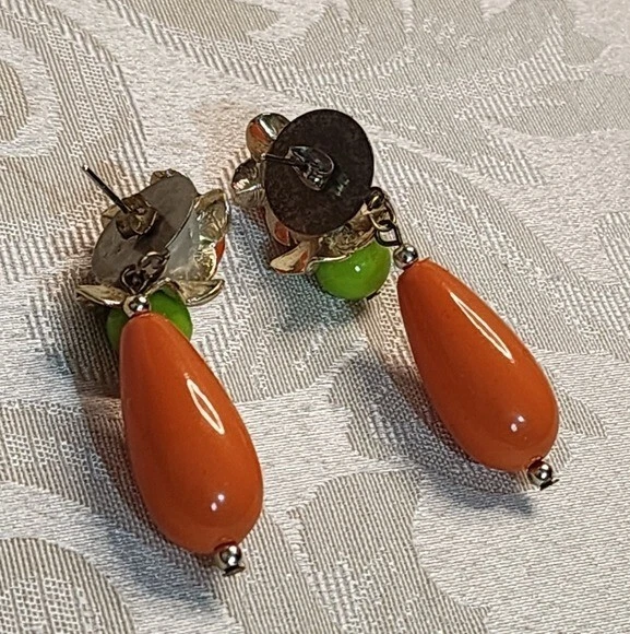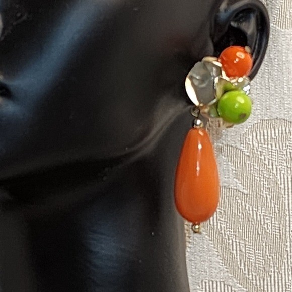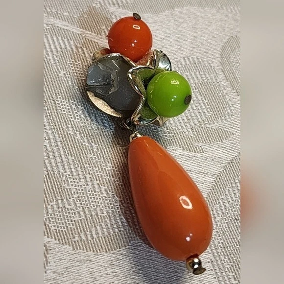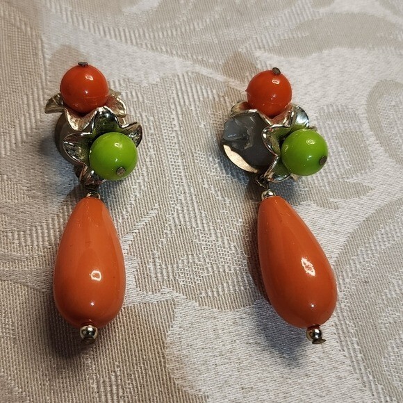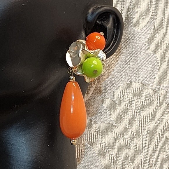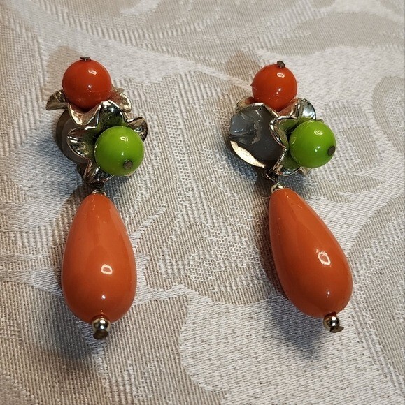 Vintage Bold Drop Earrings Orange Green Bead Mid Century Modern Statement Add a vibrant pop of retro charm to your look with these striking vintage clip-on earrings. Featuring glossy orange teardrop beads paired with lime green and tangerine accents, they’re set on silver-tone clip backs with a flower petal-like design. These earrings radiate playful mid-century flair—perfect for statement jewelry lovers and collectors alike. Era: Likely 1960s–70s Style: dangle/drop Color: Orange, green, silver-tone Condition: Excellent vintage condition with secure backs Length: Approx. 2.25" Material: Plastic/acrylic beads, silver-tone