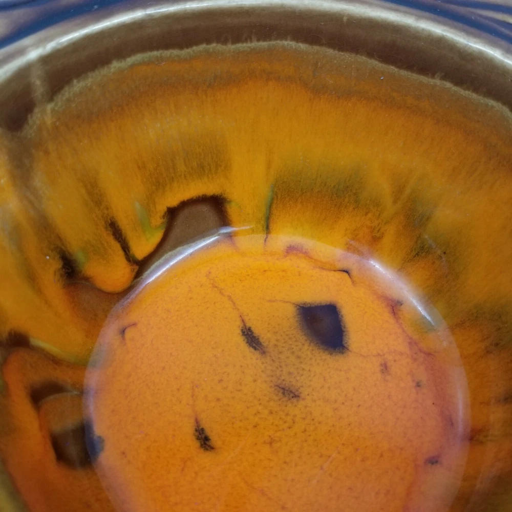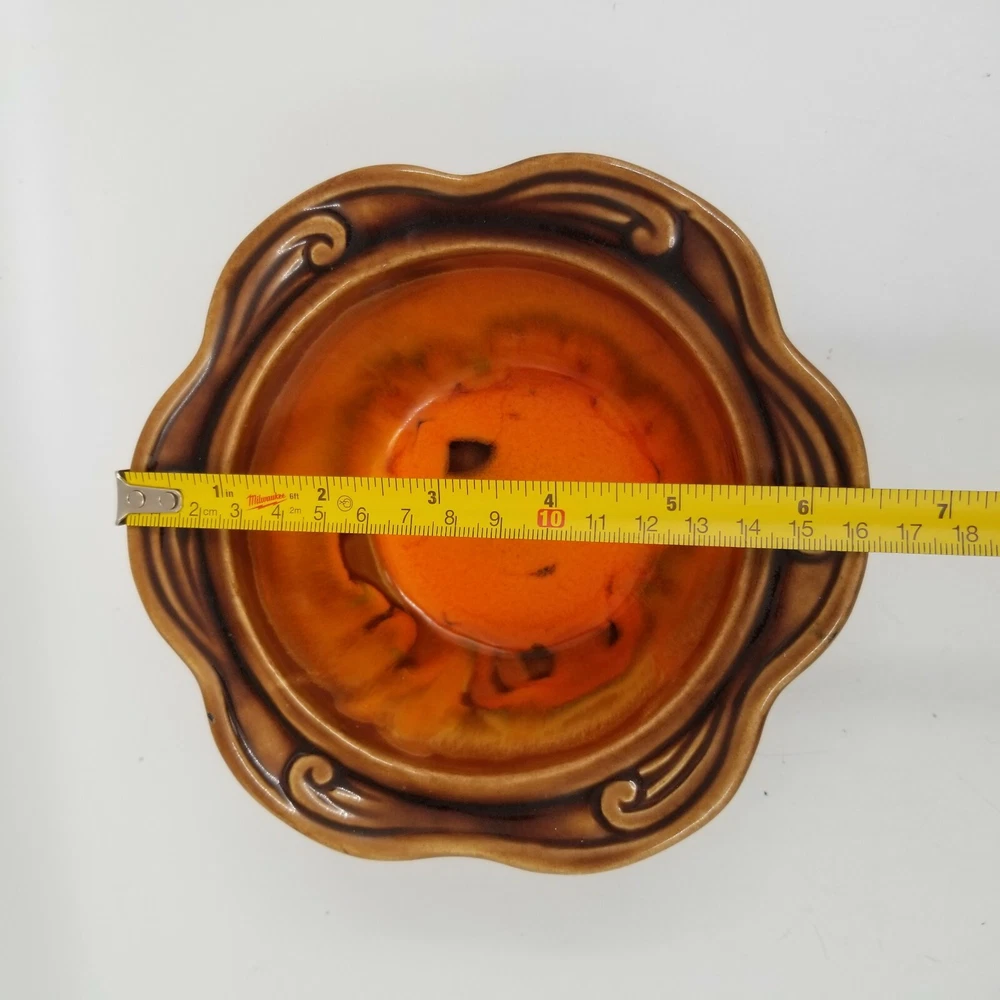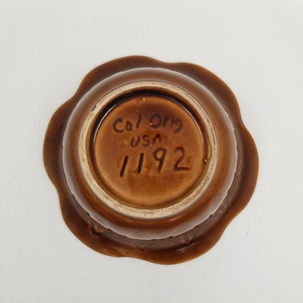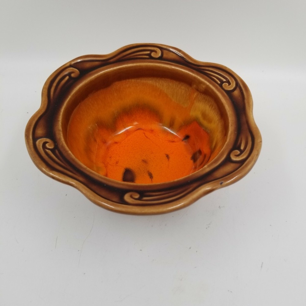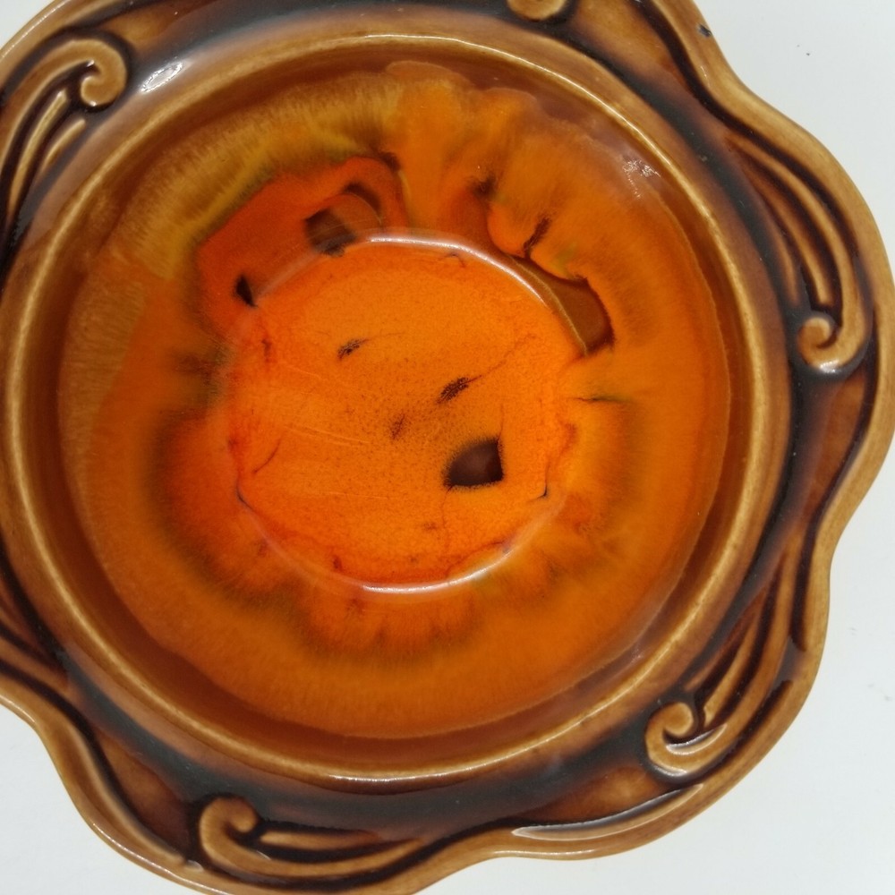 Vintage Brown Orange Drip Lava Glaze Cal Orig USA 1192 Bowl California Pottery. Vintage California Pottery Bowl Nice fall colors with a bright orange glazed inside good for fall, Thanksgiving, and Halloween decor. Approximately 3" tall x 6.5" wide Orange glaze inside, scalloped edge, and brown glaze outside. Small chip in glaze and crazing shown in pictures.